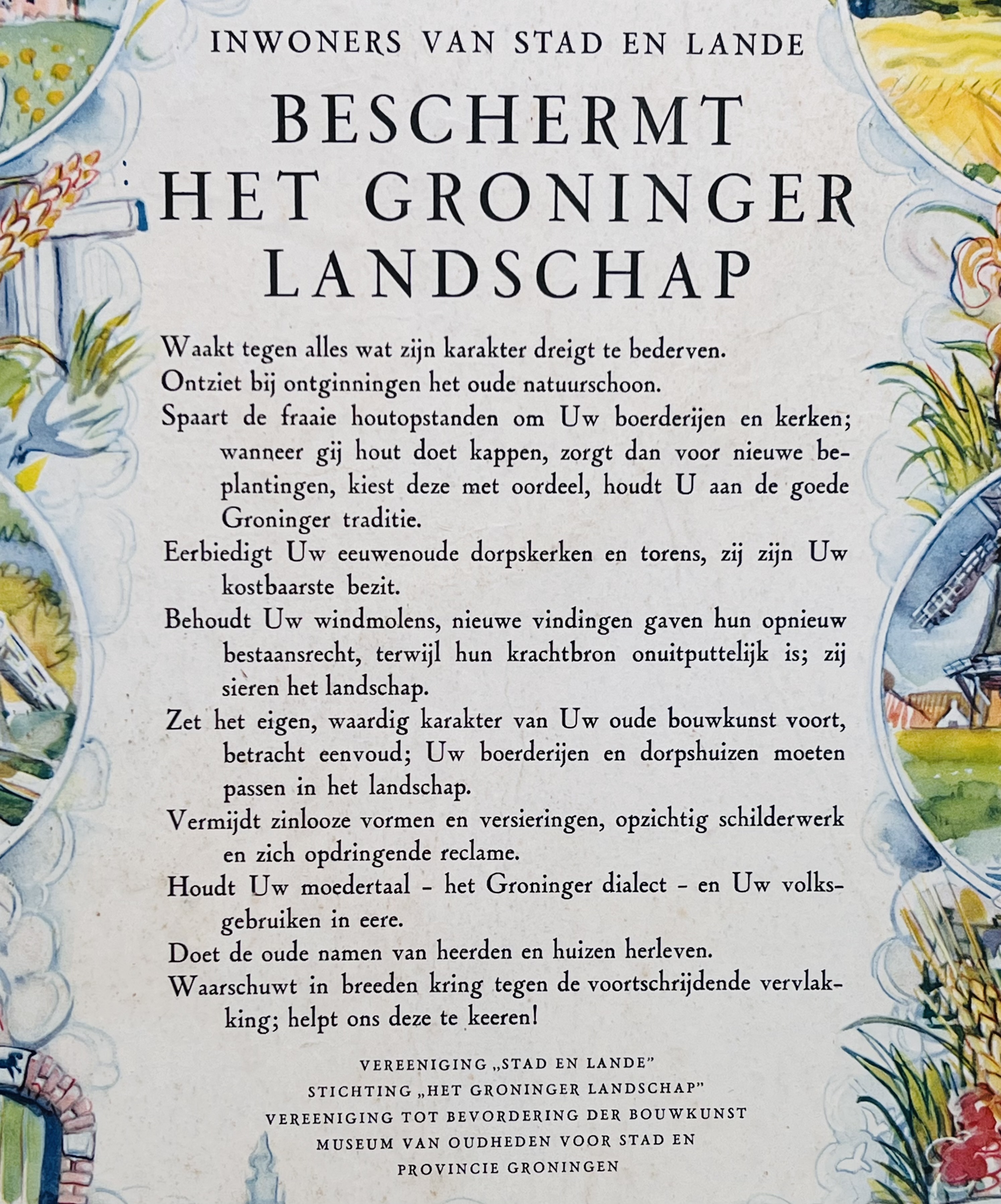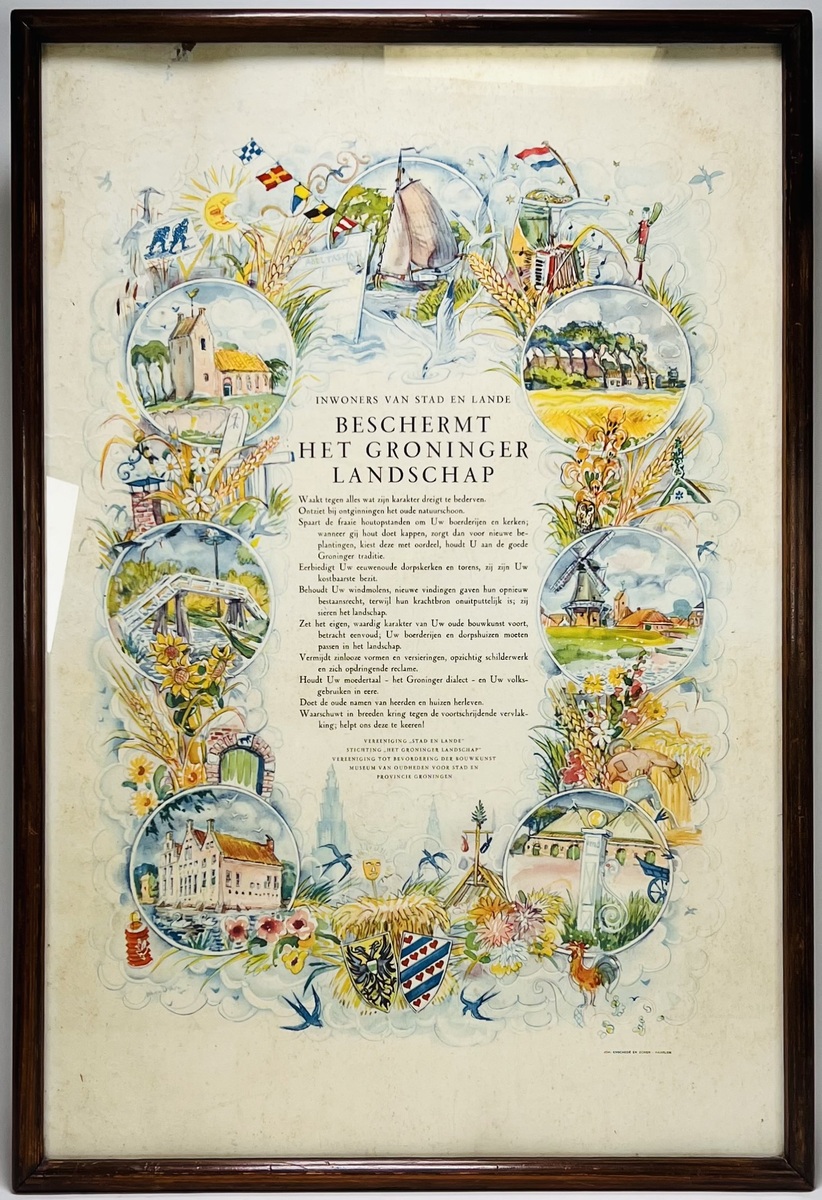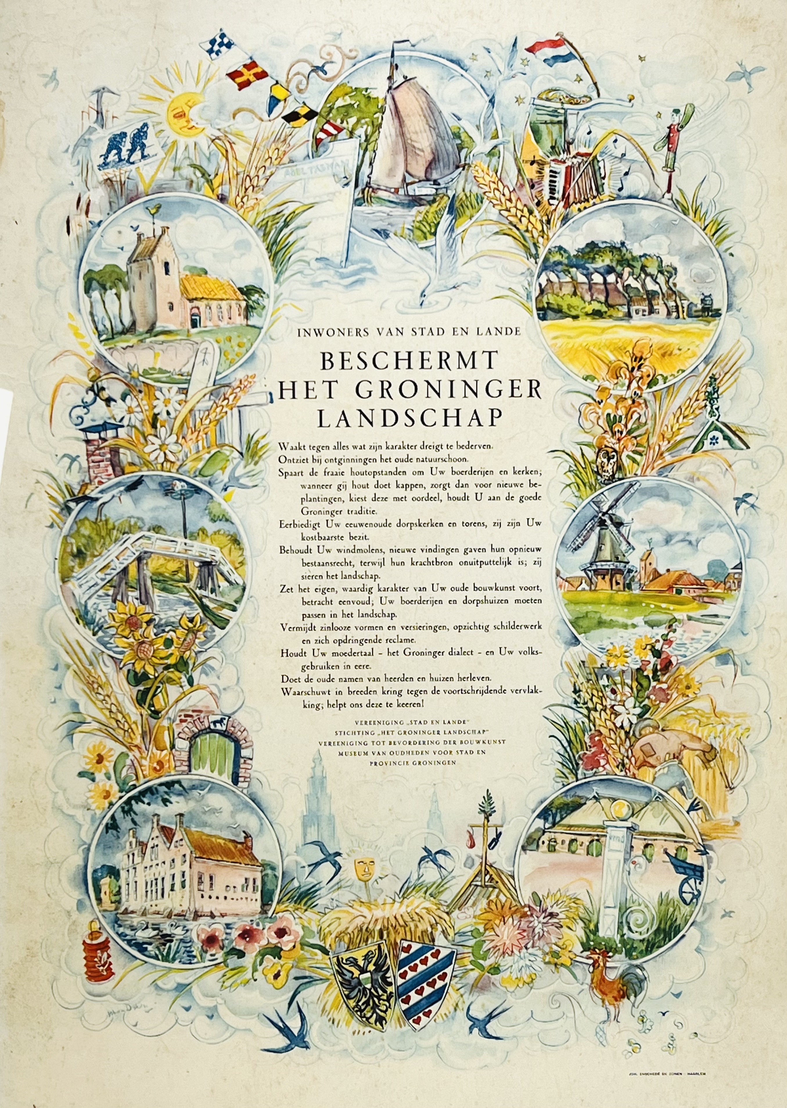 Affiche, kleurenlithografie door kunstenaar Johan Dijkstra met de titel “Beschermt het Groninger Landschap“. Uitgeven door Johan Enschede en Zonen - Haarlem, derde kwart 20e eeuw. |