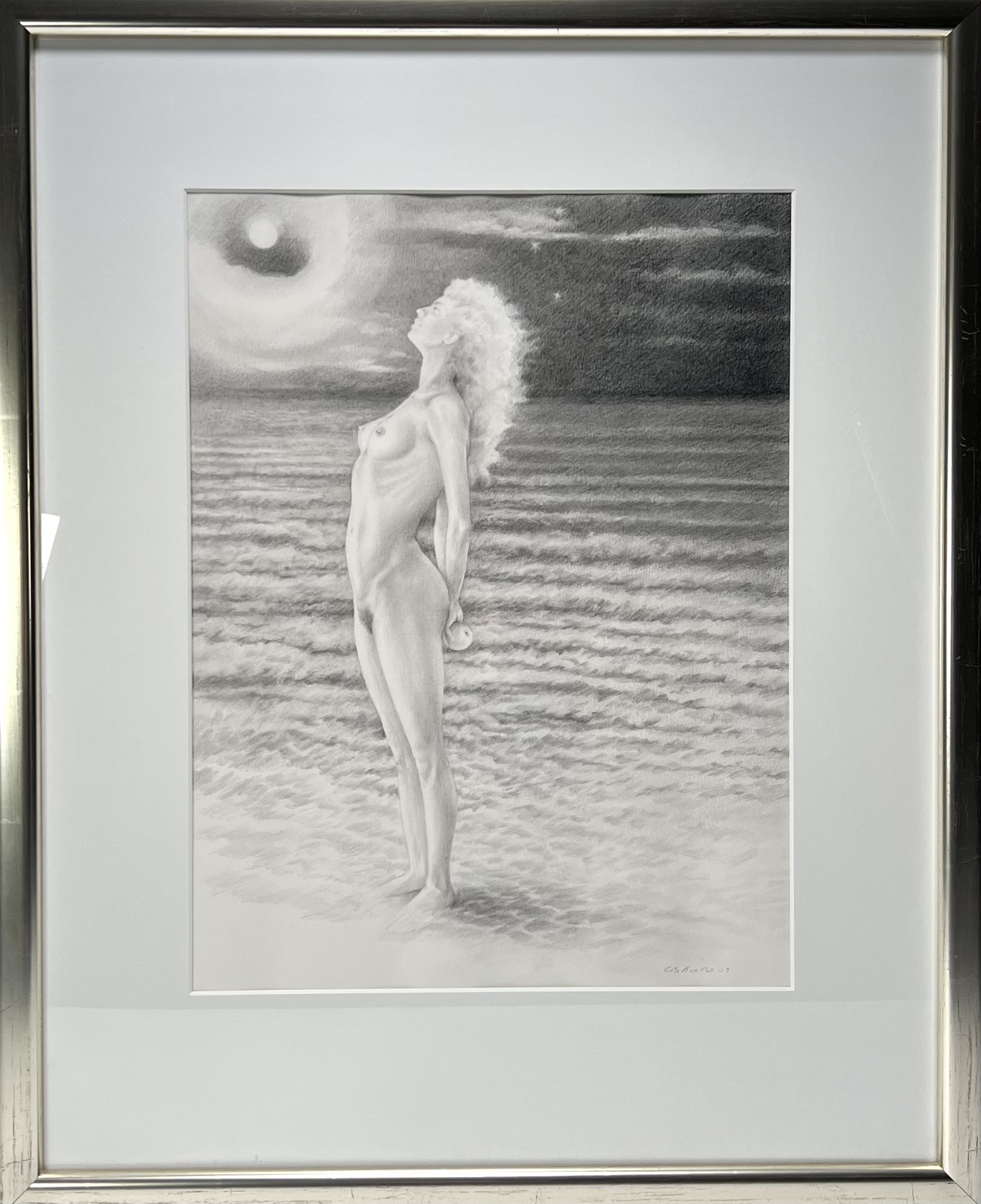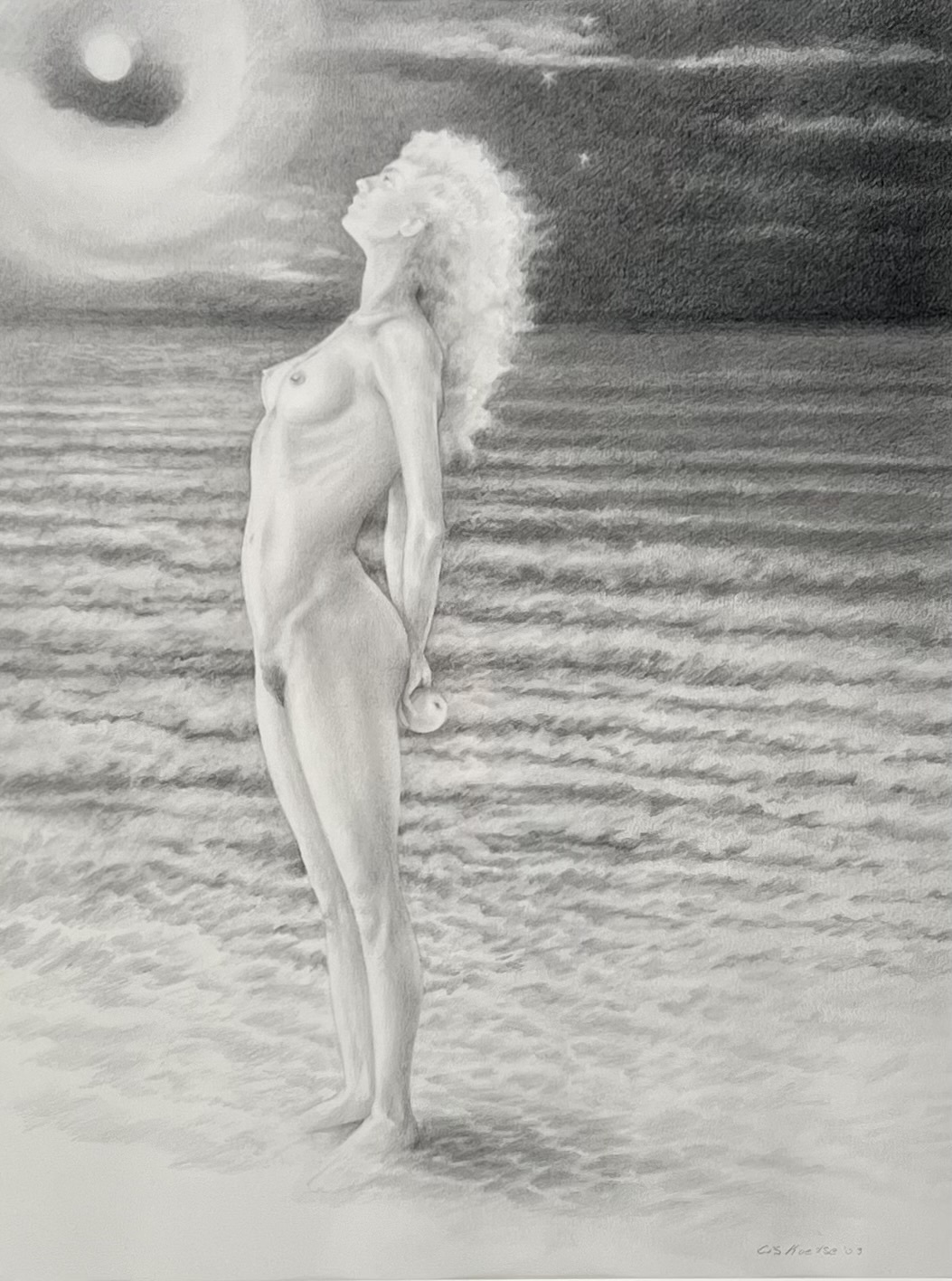 Potloodtekening van vrouwelijk naakt met appel getiteld “Verloren paradijs” door Cis Koetse (1943), rechtsonder gesigneerd en gedateerd 2003. |