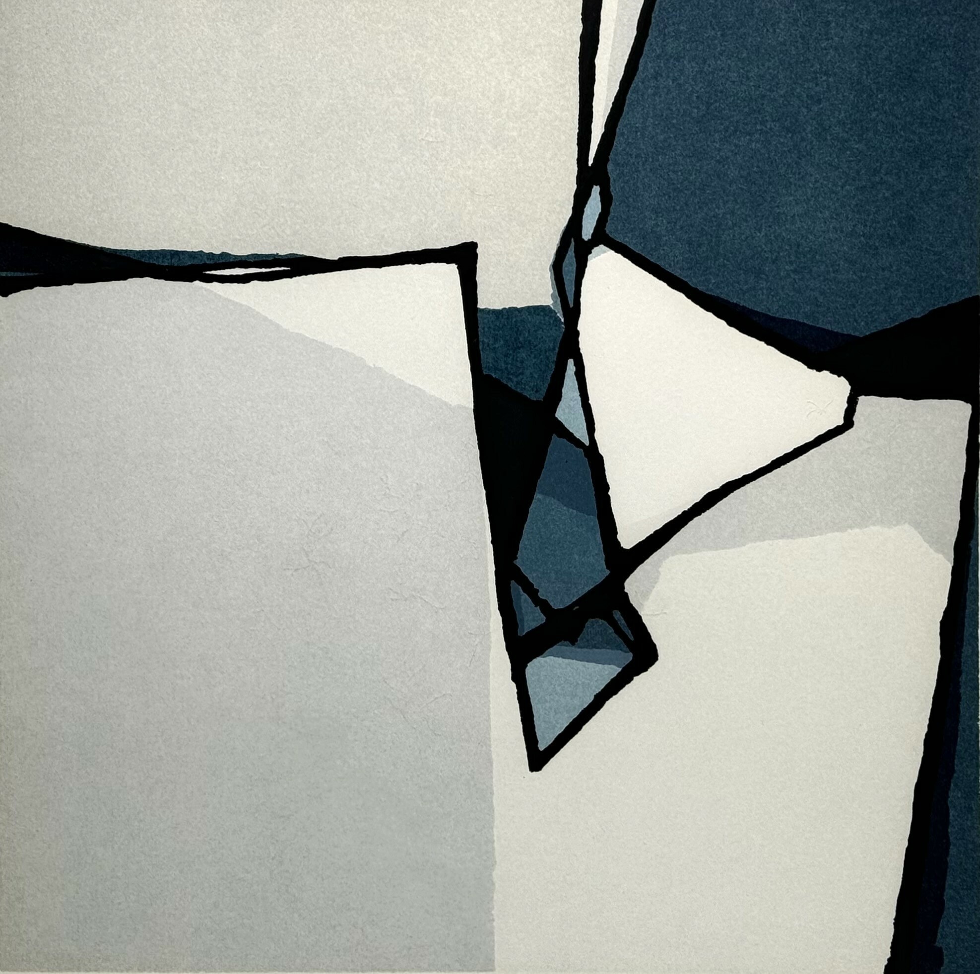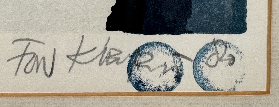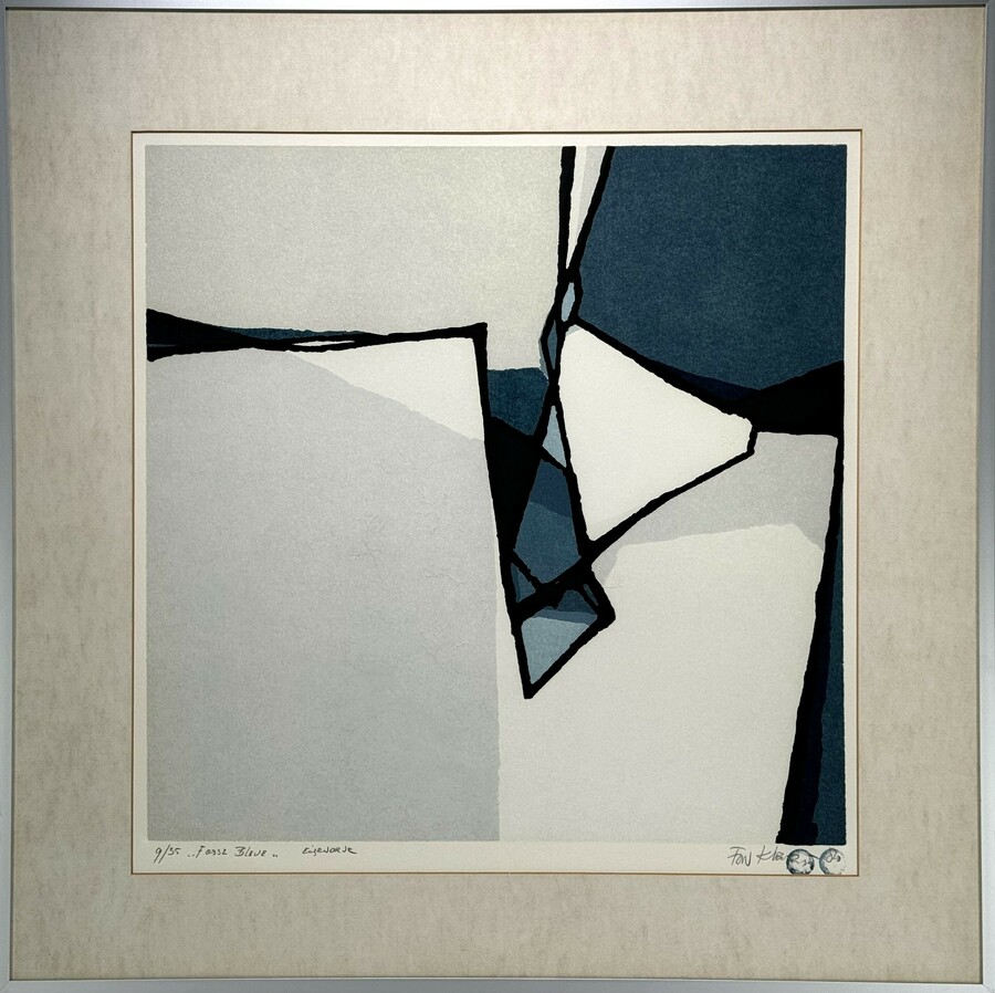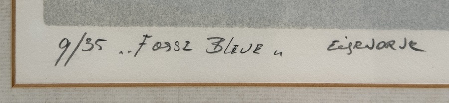 Zeefdruk getiteld “‘Fosse Bleue” van Fon Klement (1930-2000). Rechtsonder met potlood gesigneerd en duimdrukken, vermelding Eigen Druk, oplagenummer 9/35 en datering 1980. |