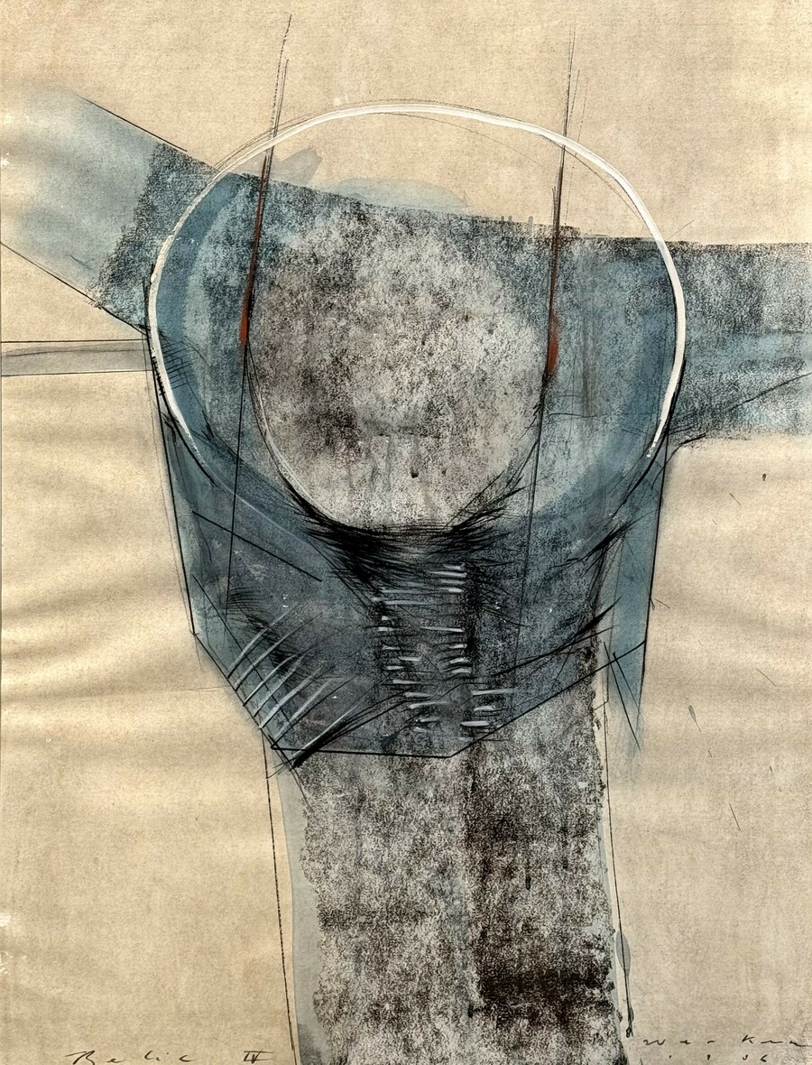 Schilderij van een Corpus Christi aan het kruis getiteld “Relic IV” door Krijn van de Werken (1948), gemengde techniek op papier. Rechtsonder gesigneerd en gedateerd 1986. |