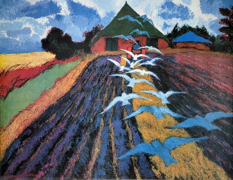 Reproductie getiteld “Geploegde akker met meeuwen” van Jannes de Vries, 21e eeuw. |