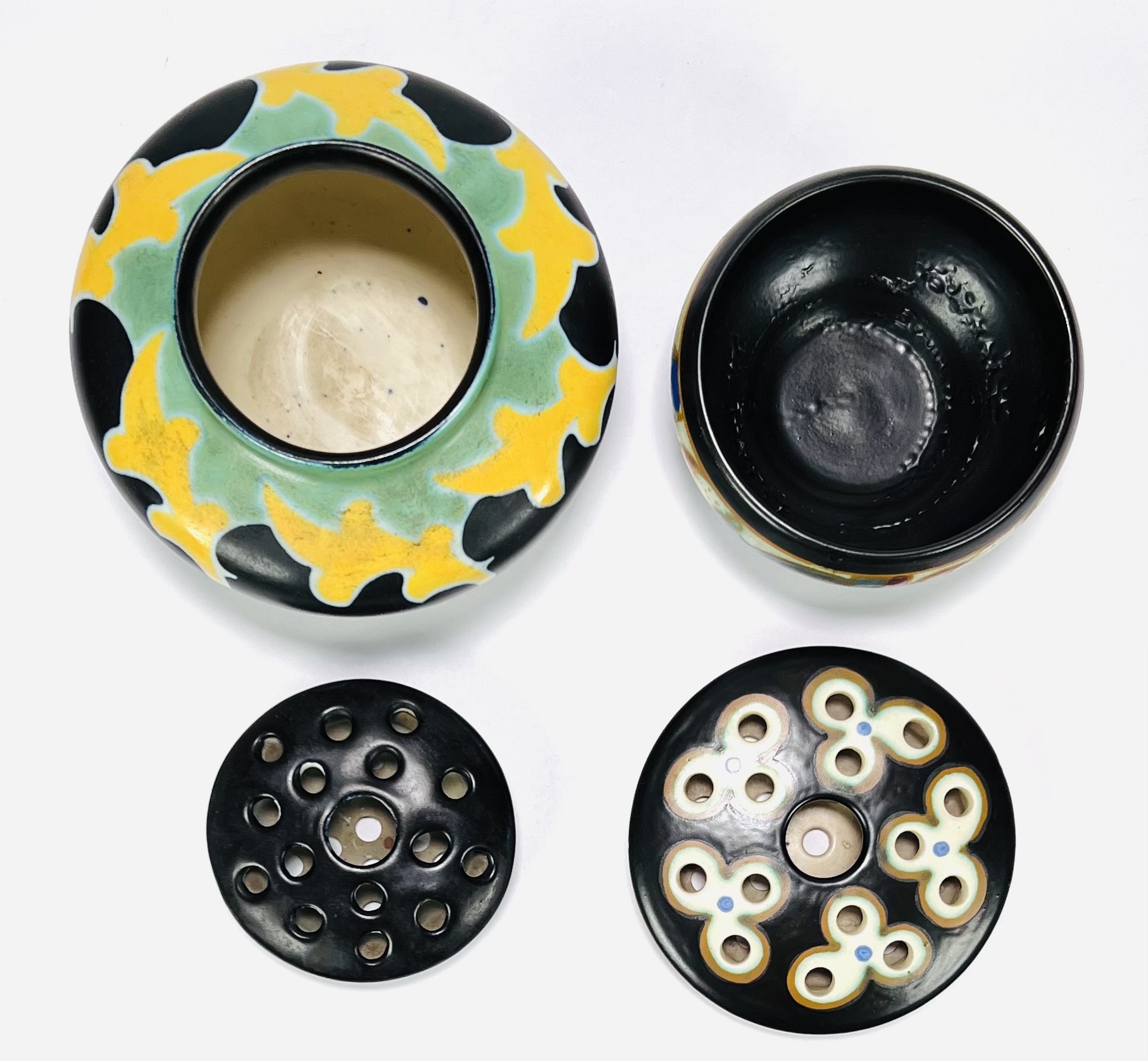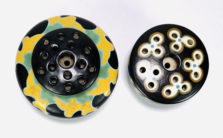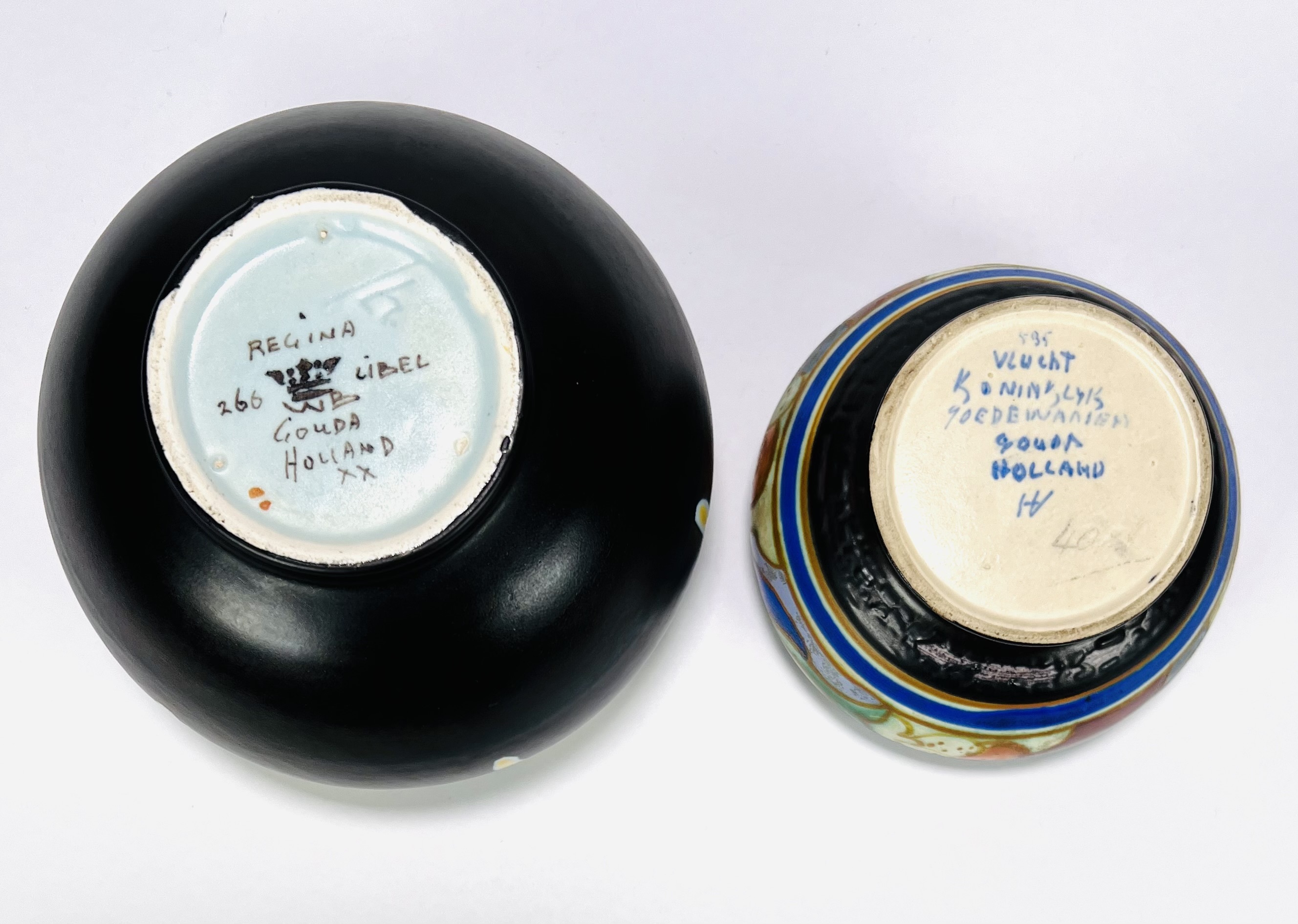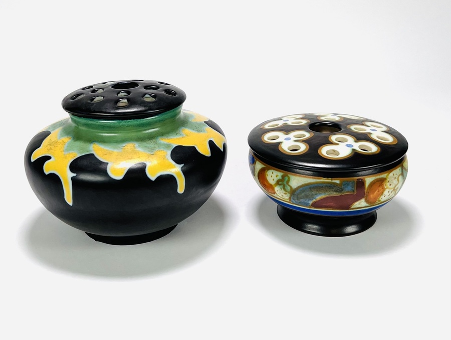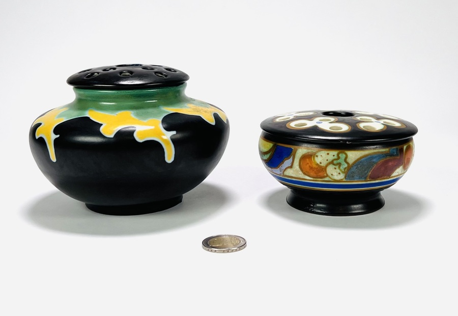 Twee keramieken Art Deco rozenstekers van de Plateelbakkerijen Regina en Goedewaagen, decornamen Libel en Vlucht. Aan de onderzijde gemerkt en voorzien van modelnummers en monogrammen plateelschilders. Tweede kwart 20e eeuw. |