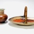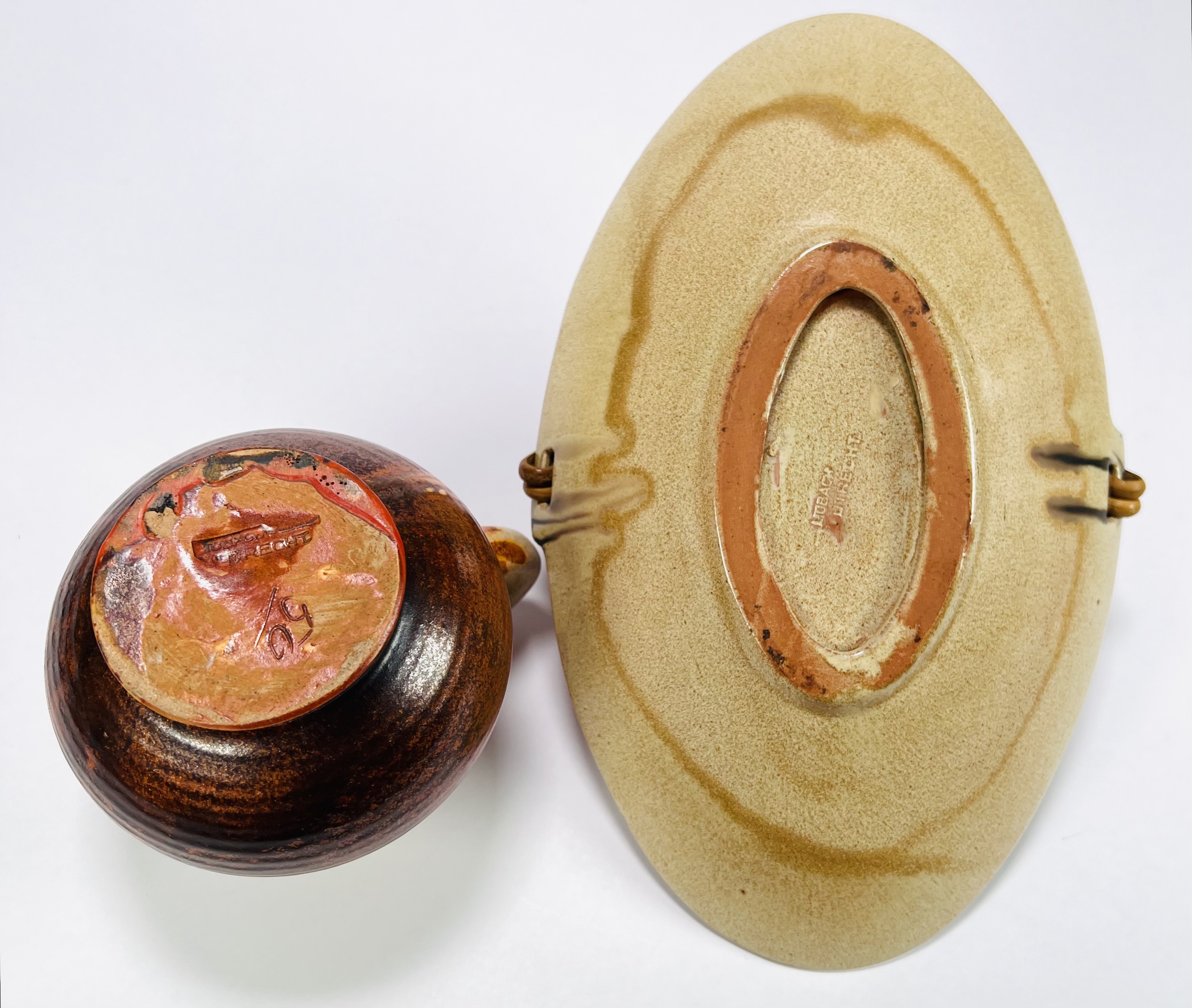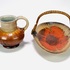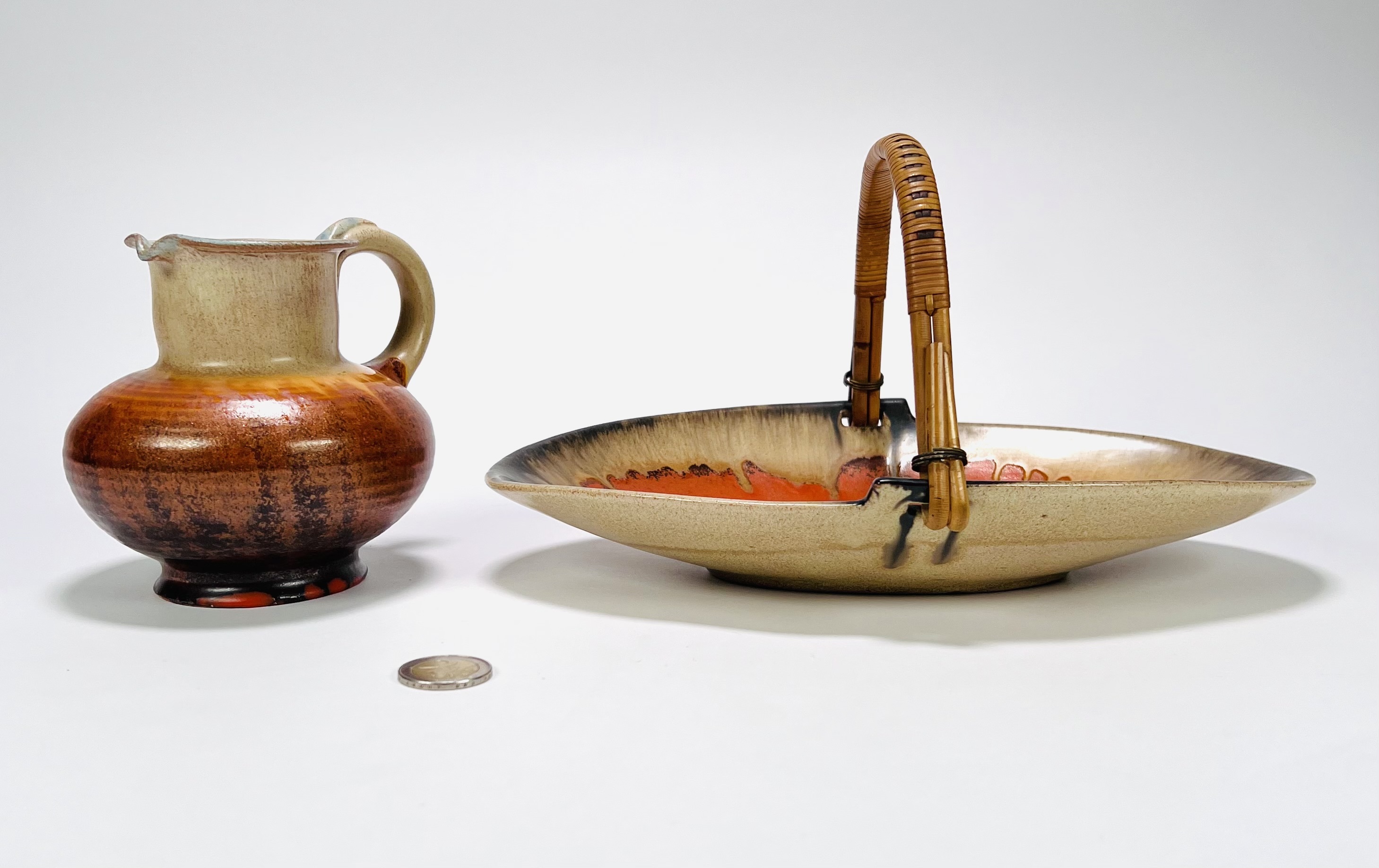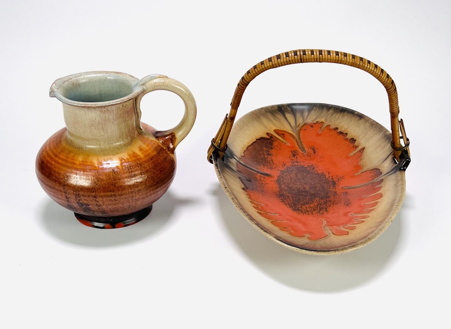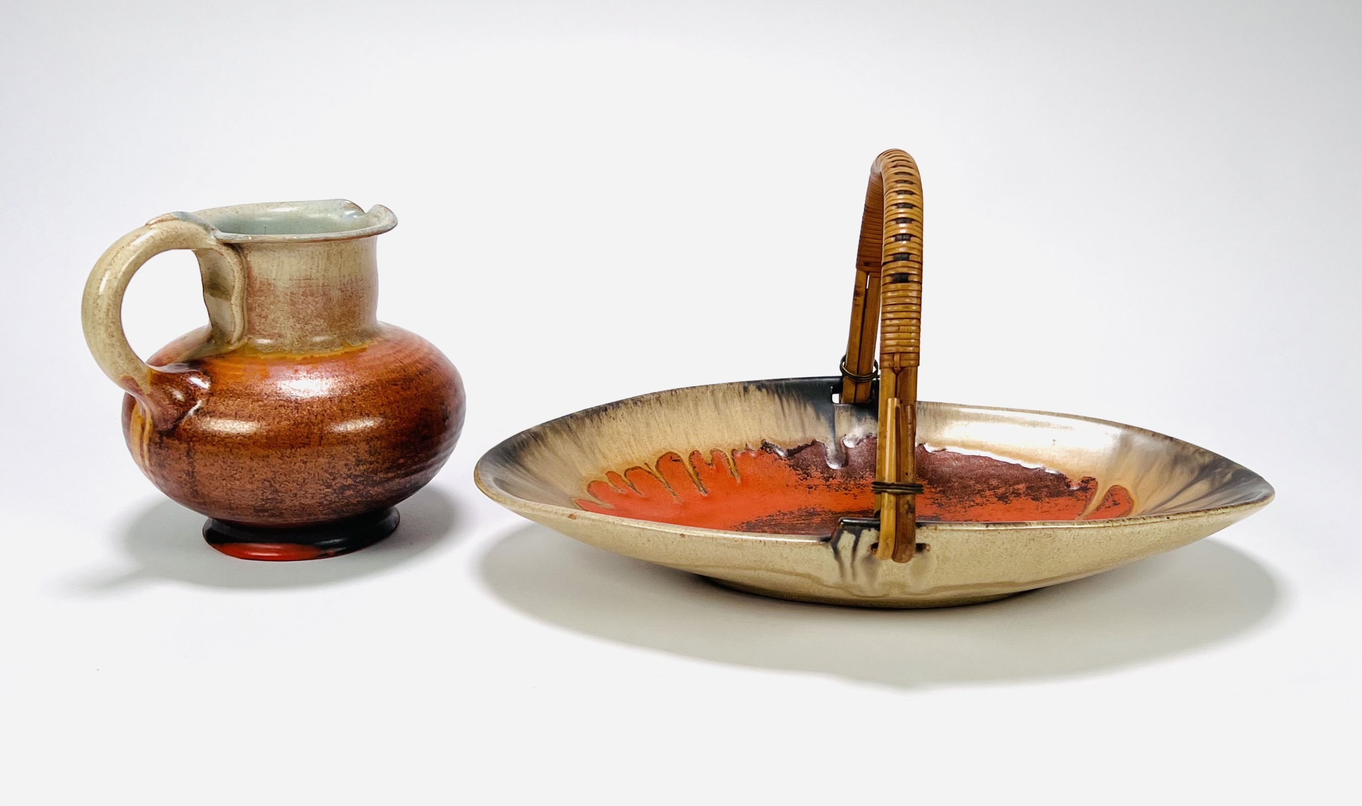 Keramieken Art Deco schaal en schenkkan met druip- en spuitglazuur door Mobach, Utrecht. Aan de onderzijde gemerkt. Schenkkan met vermelding van modelnummer 50. Jaren 30 |