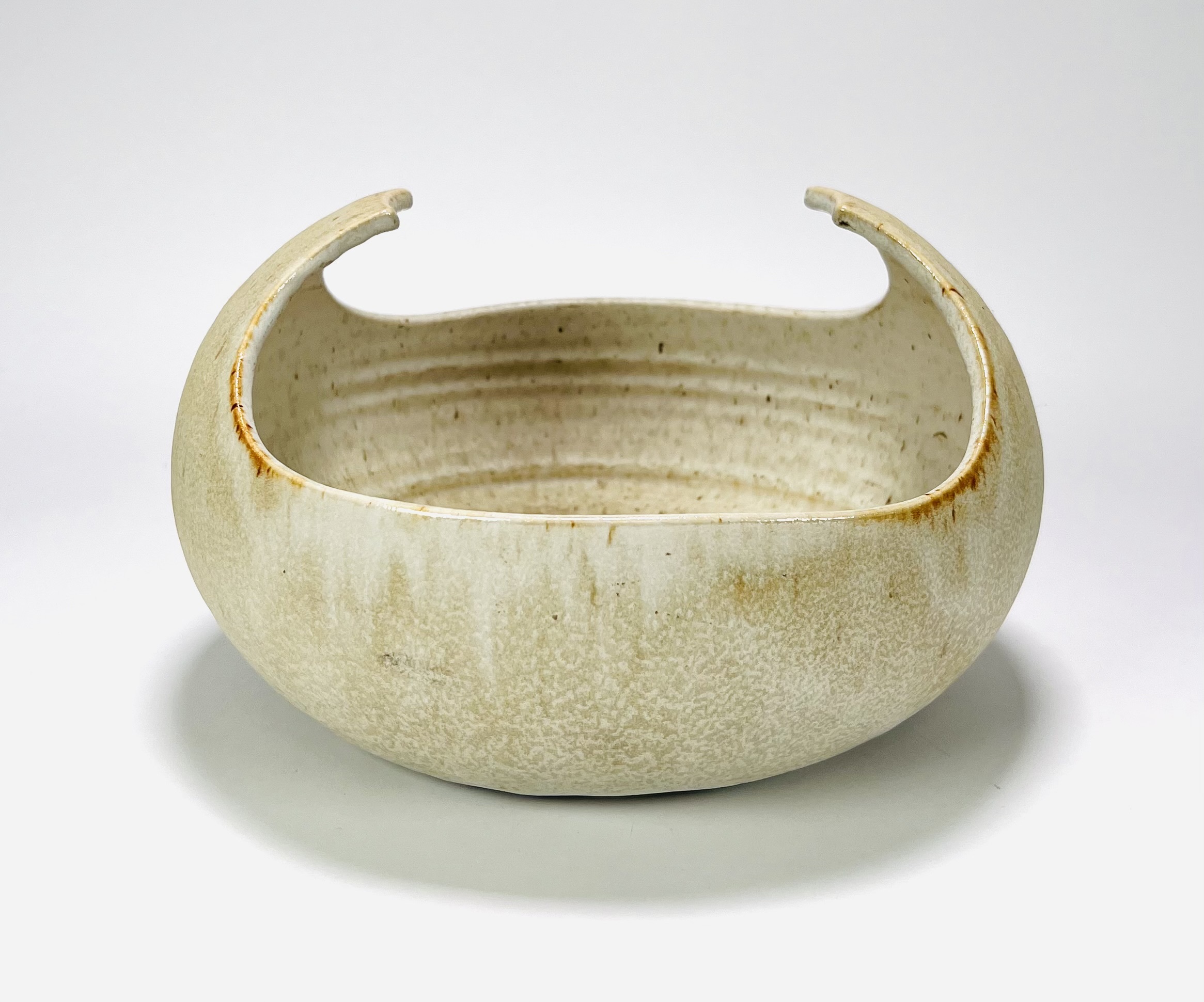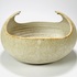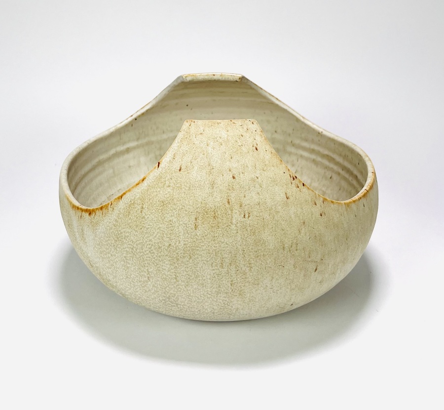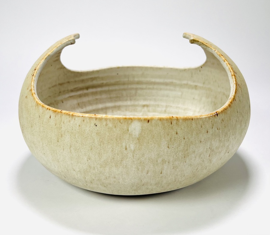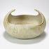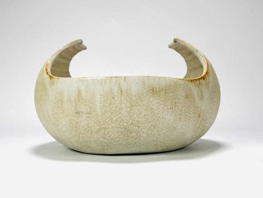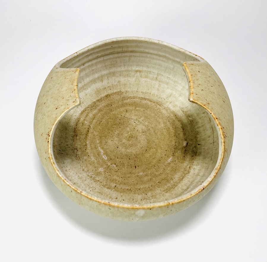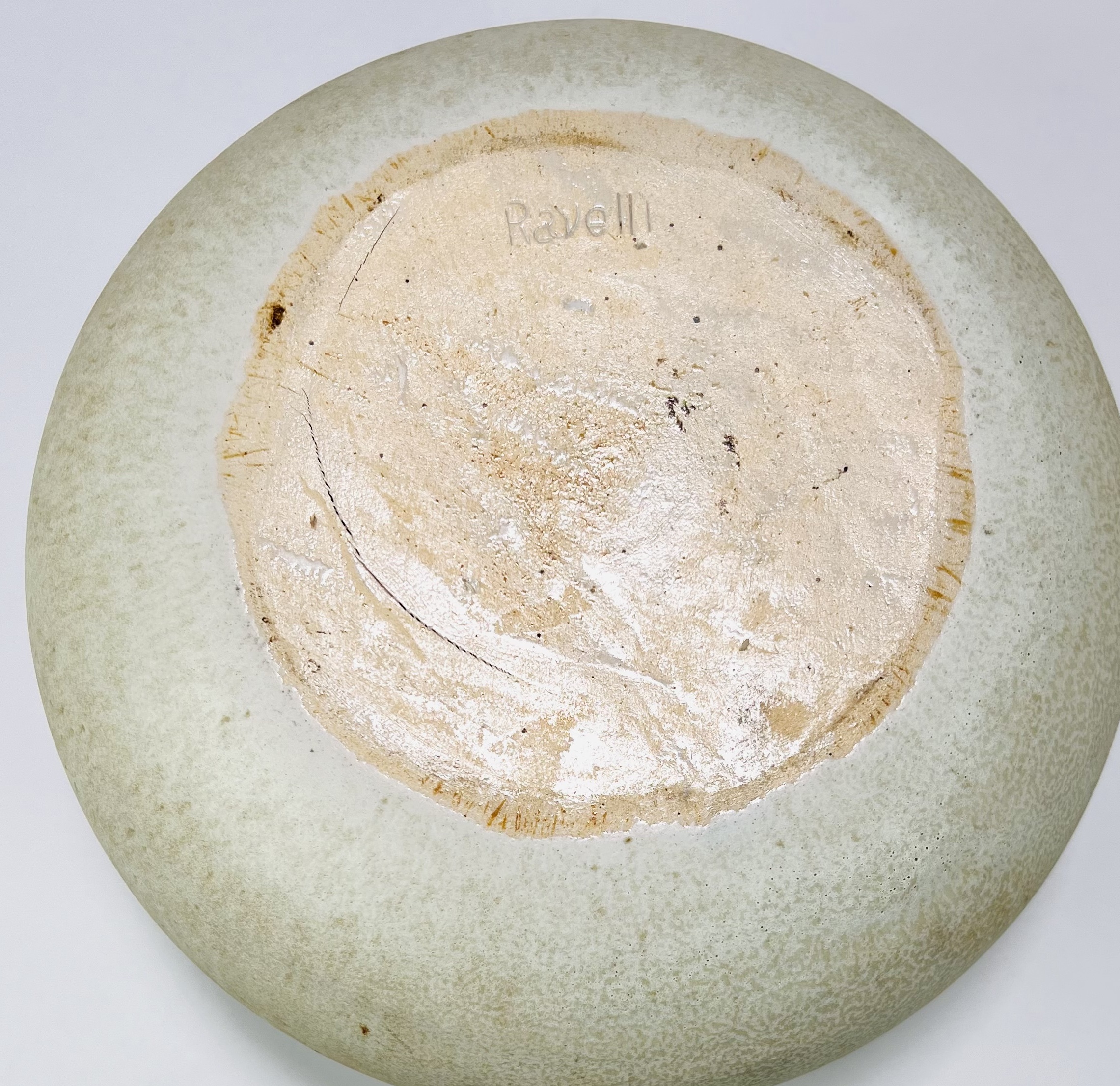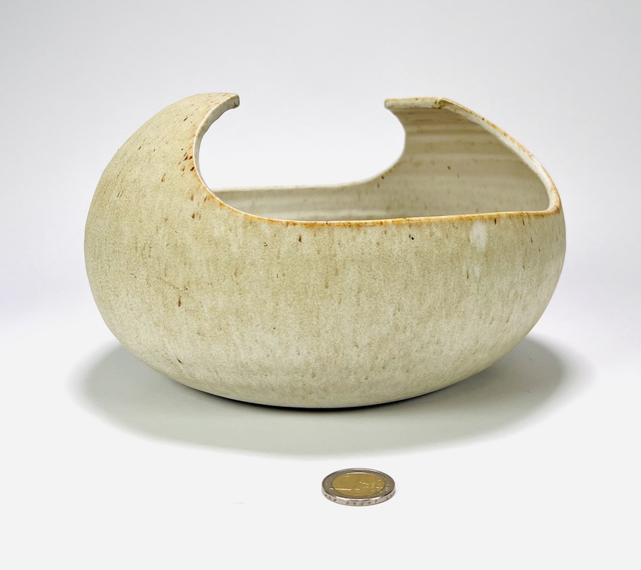 Crème-zandkleurige keramieken schaal met omhoogkomende rand door Jaap Ravelli (1916-2011). Aan de onderzijde gemerkt Ravelli, Valkenburg, jaren 60/70. |