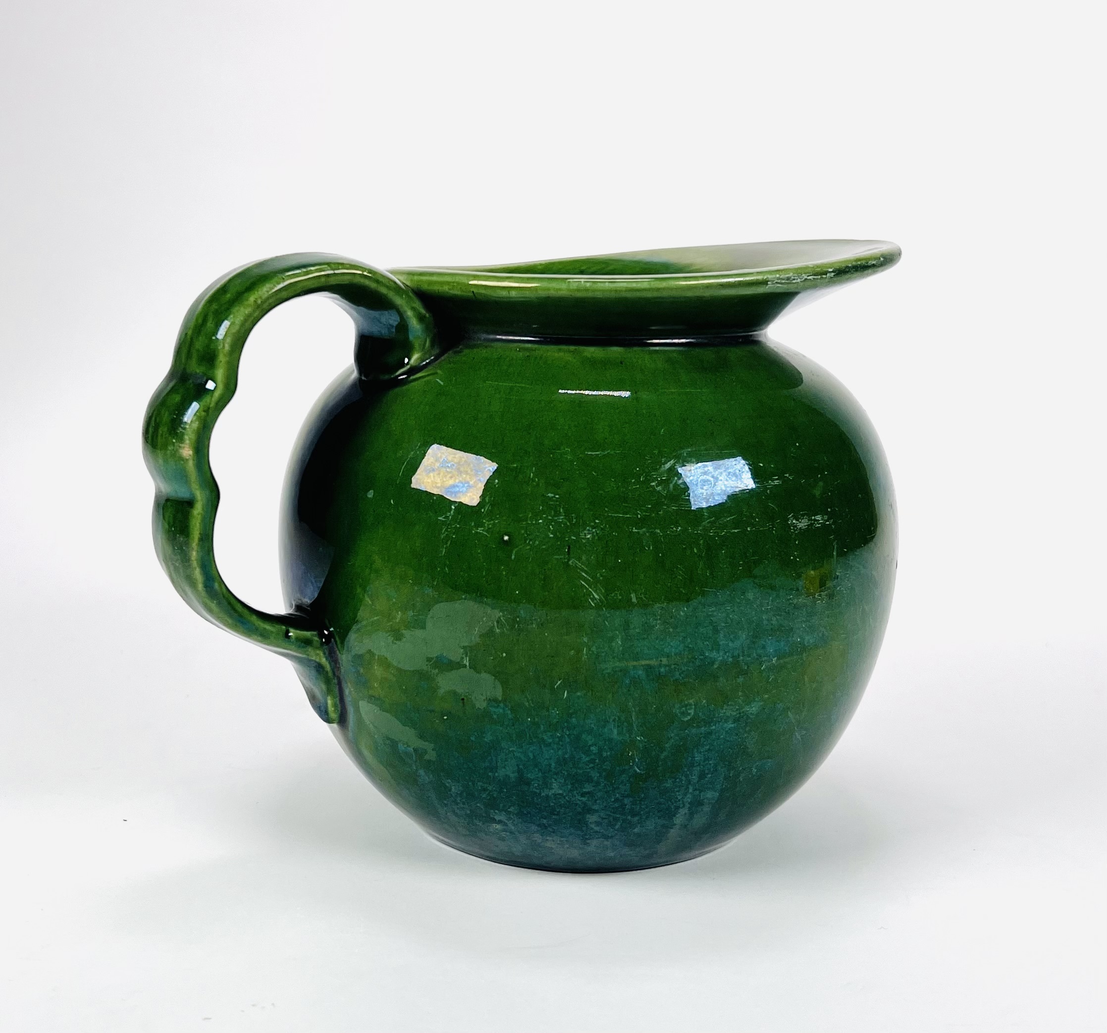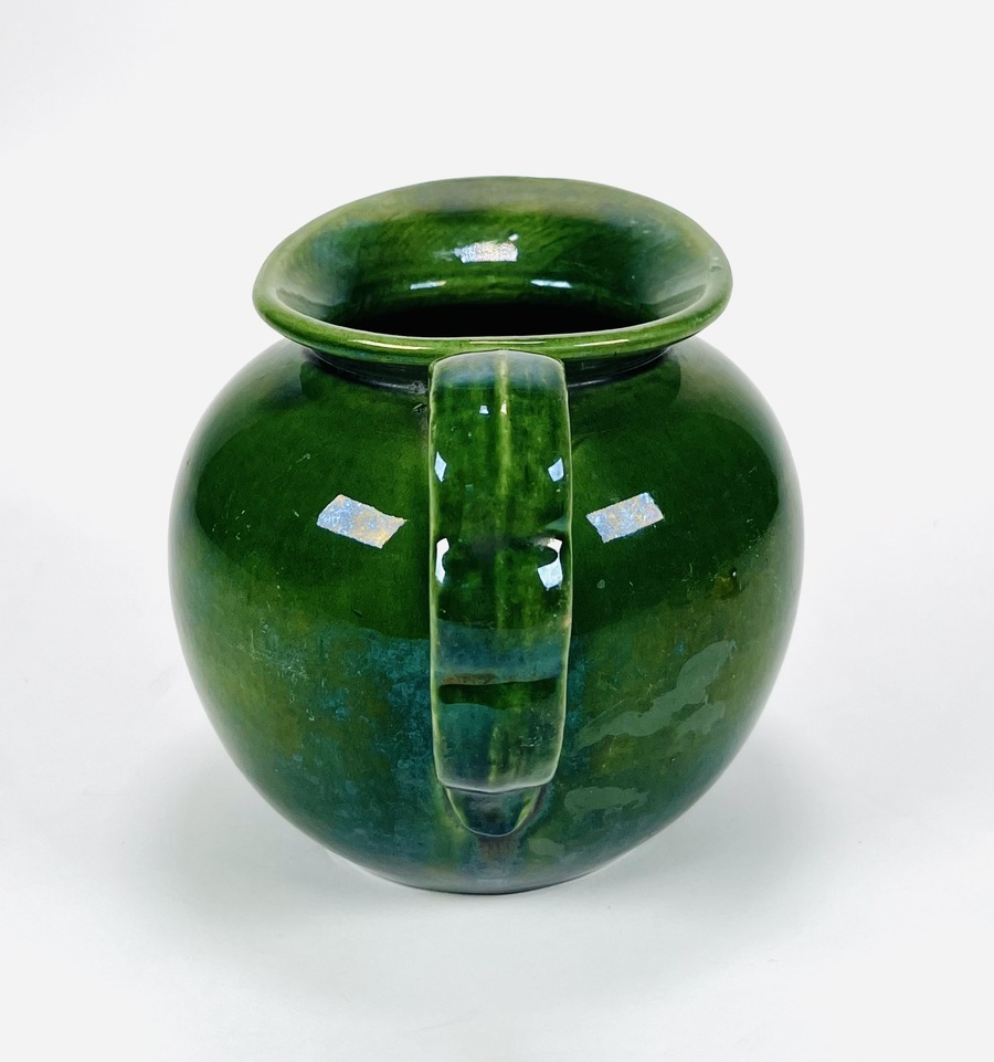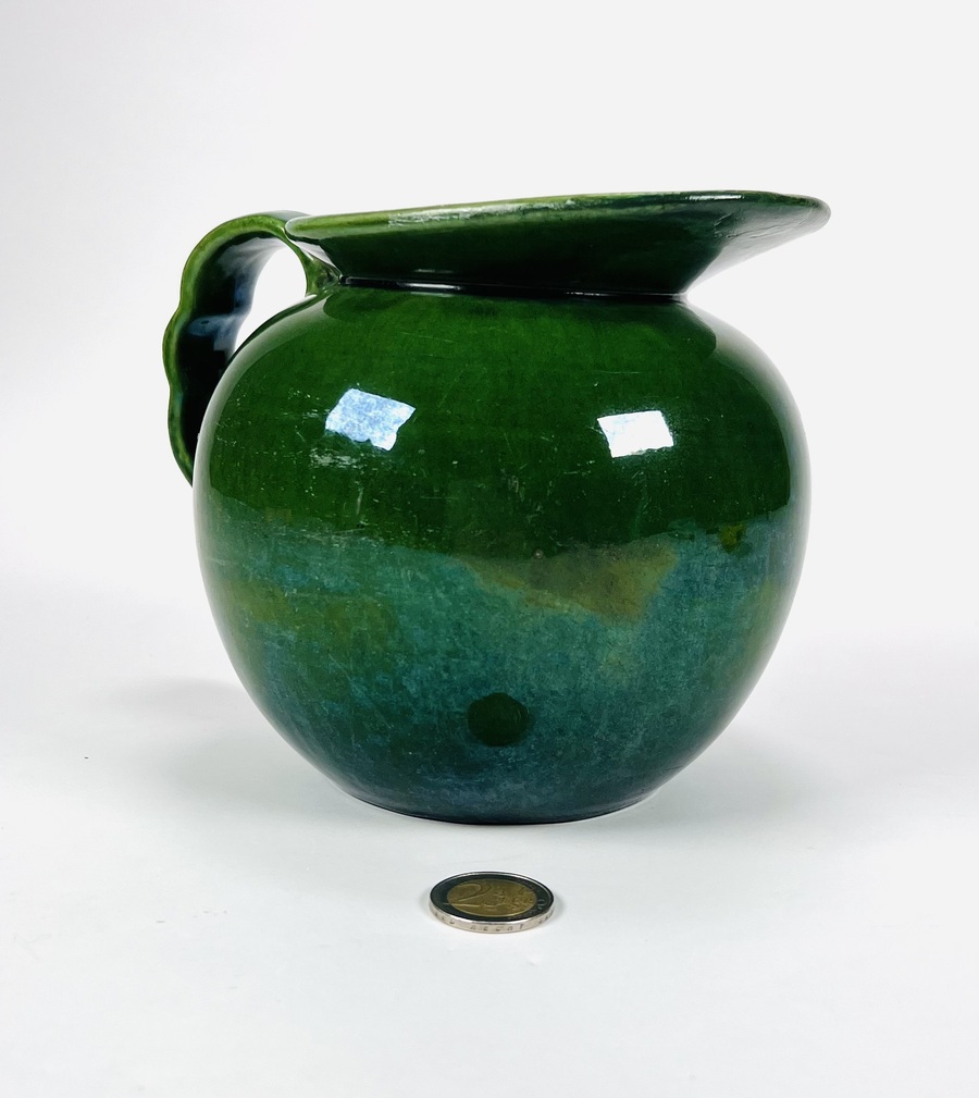 Keramieken groen geglazuurde schenkkan door de Groninger Steenfabriek ADCO. Aan de onderzijde gemerkt en voorzien van modelnummer 1512. Jaren 50. |