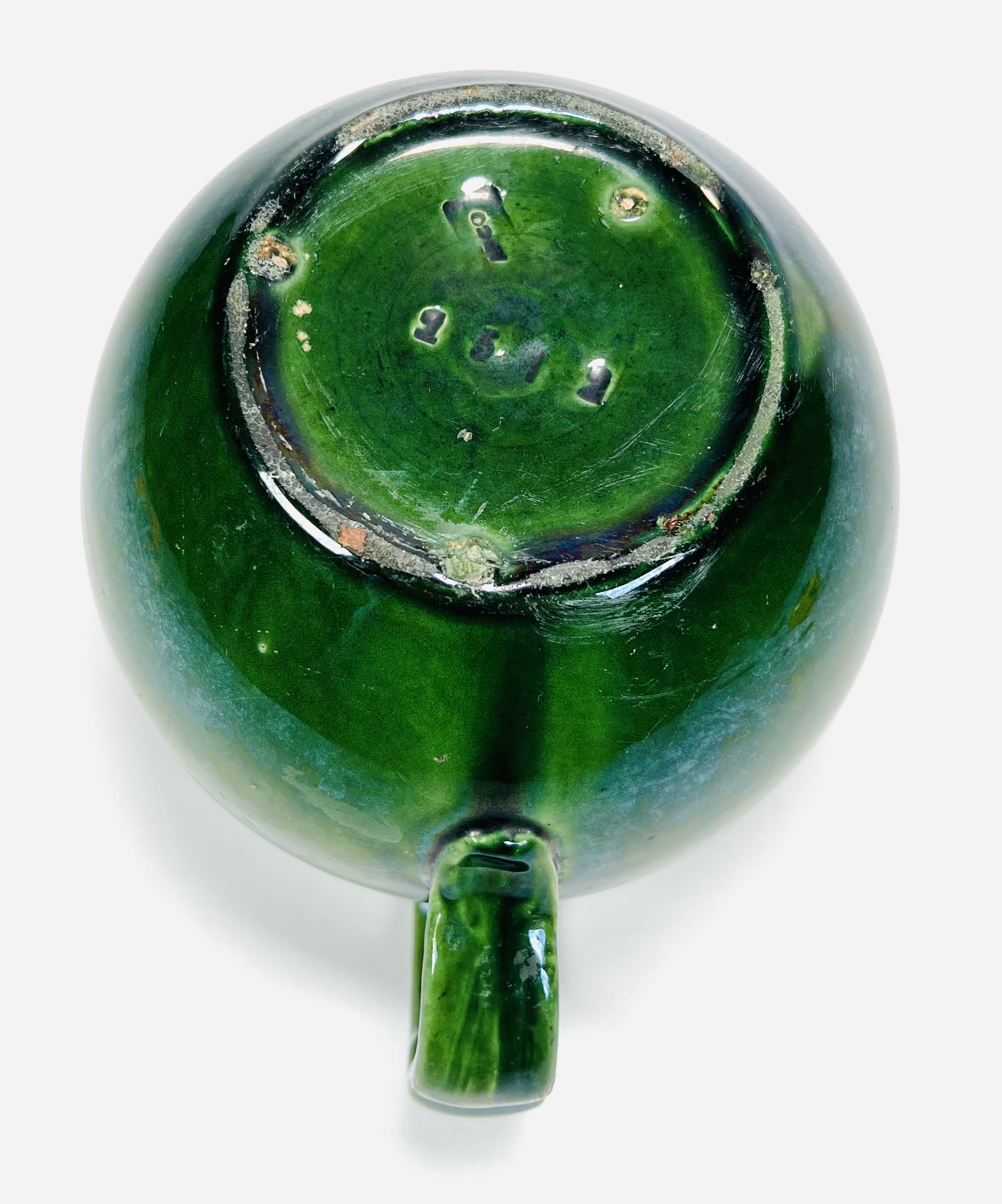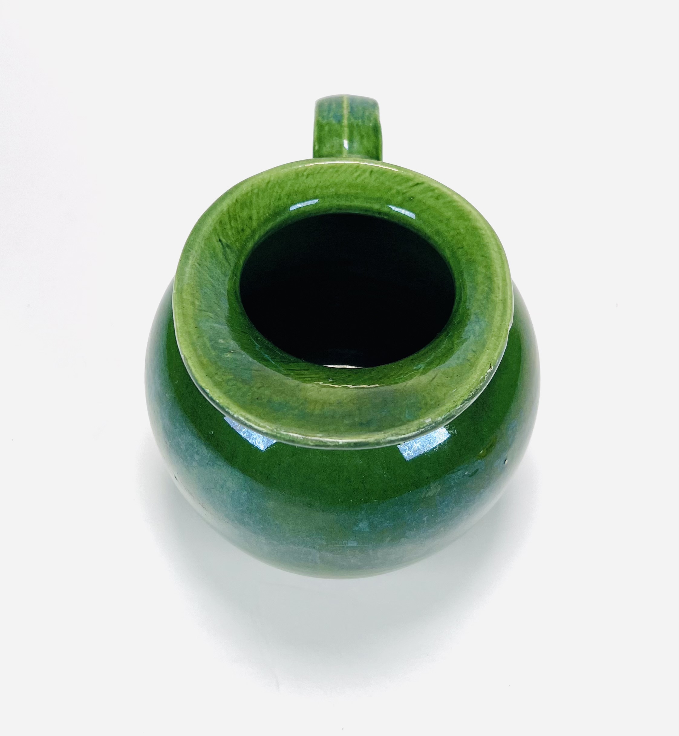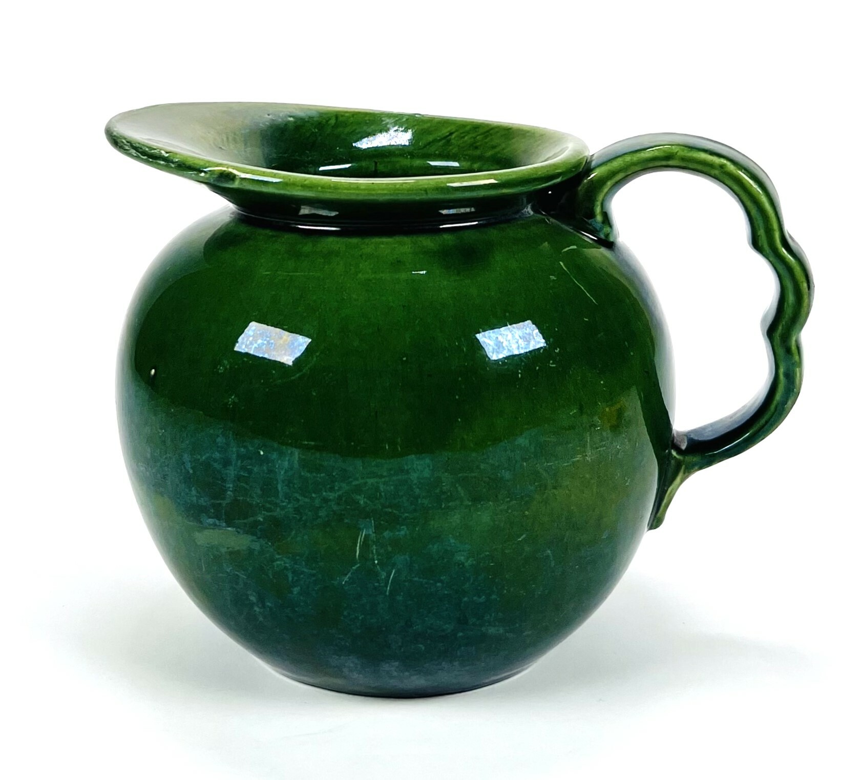 Keramieken groen geglazuurde schenkkan door de Groninger Steenfabriek ADCO. Aan de onderzijde gemerkt en voorzien van modelnummer 1512. Jaren 50. |