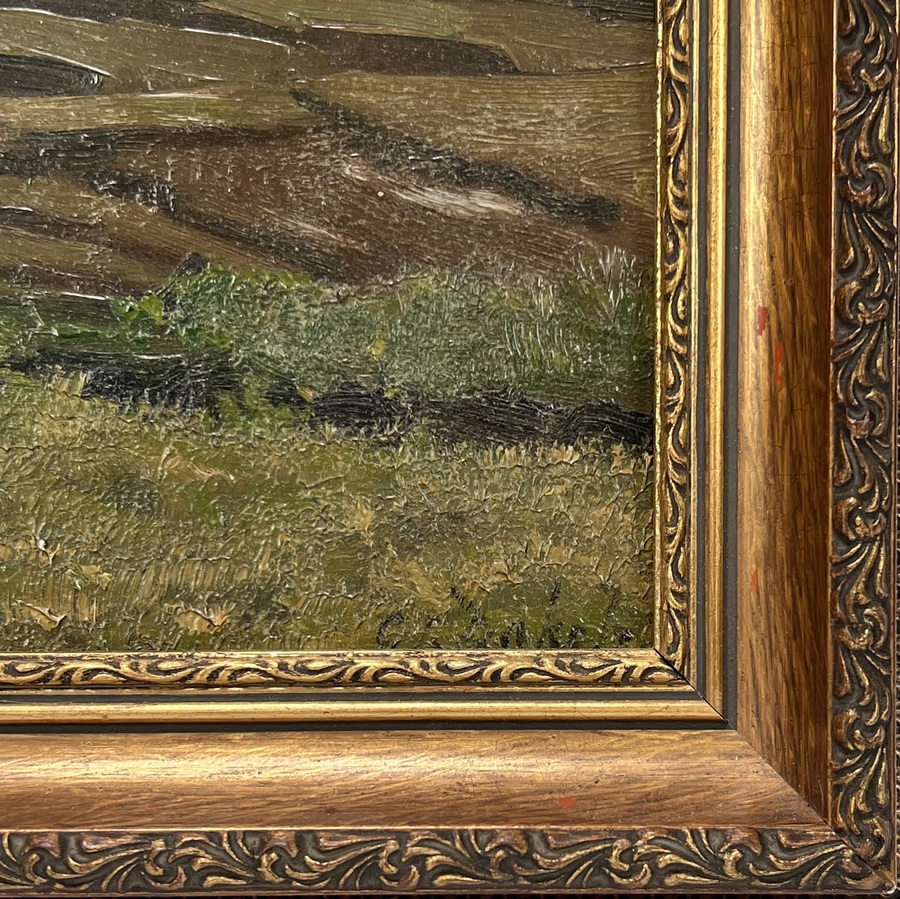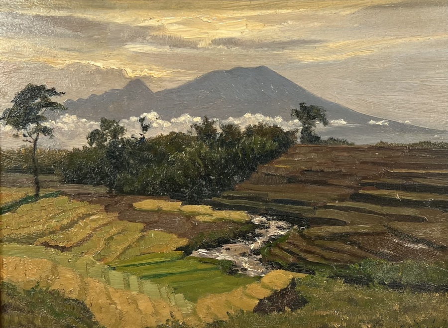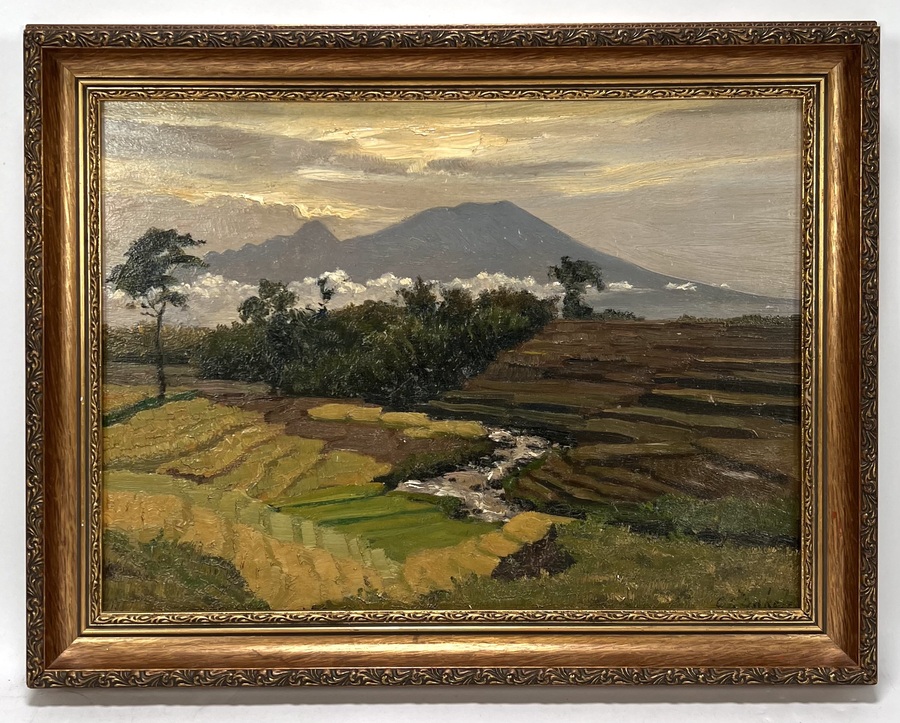 Schilderij van Indonesisch landschap met bergkammen door Carel Lodewijk Dake Junior (Schaarbeek 1886 – Batavia 1946), olieverfschilderij op paneel. Rechtsonder gesigneerd, verso informatie over de locatie. Tweede kwart 20e eeuw. |