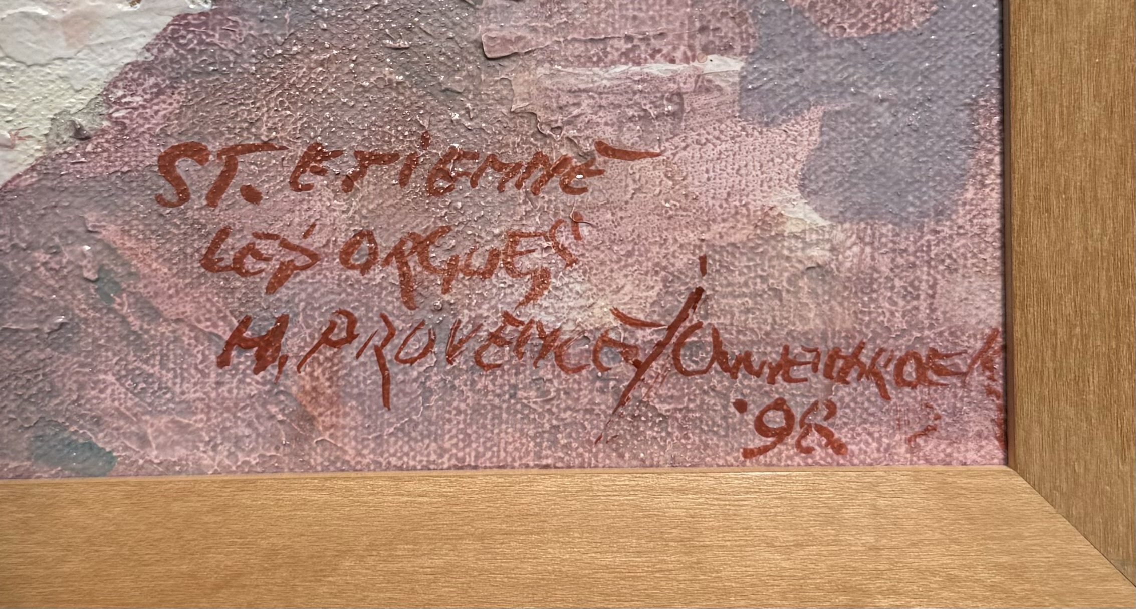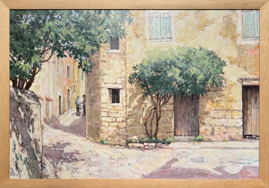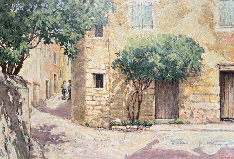 Schilderij met Zuid-Frans stadsgezicht van Saint-Étienne door Jan Ouwenbroek (1927-2024), olieverfschilderij op linnen. Rechtsonder gesigneerd en gedateerd 1998. |