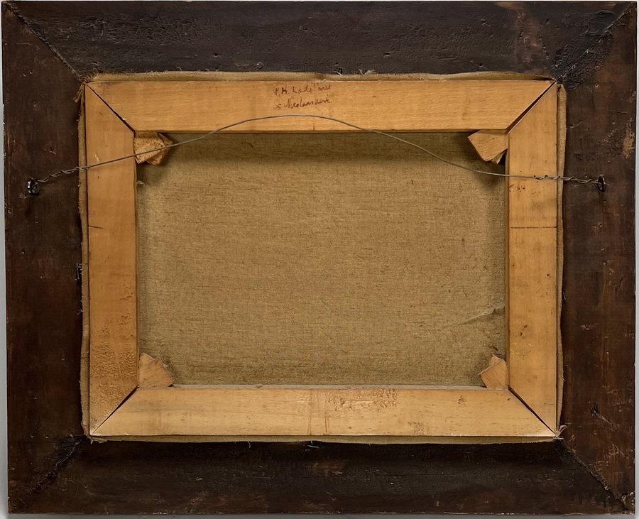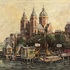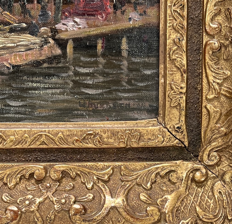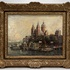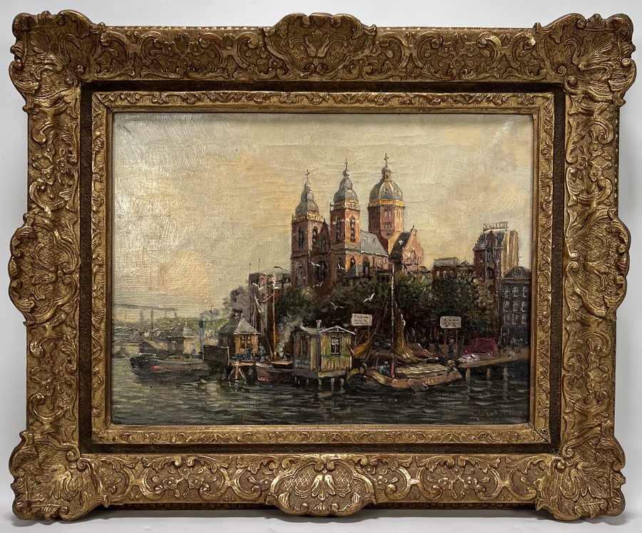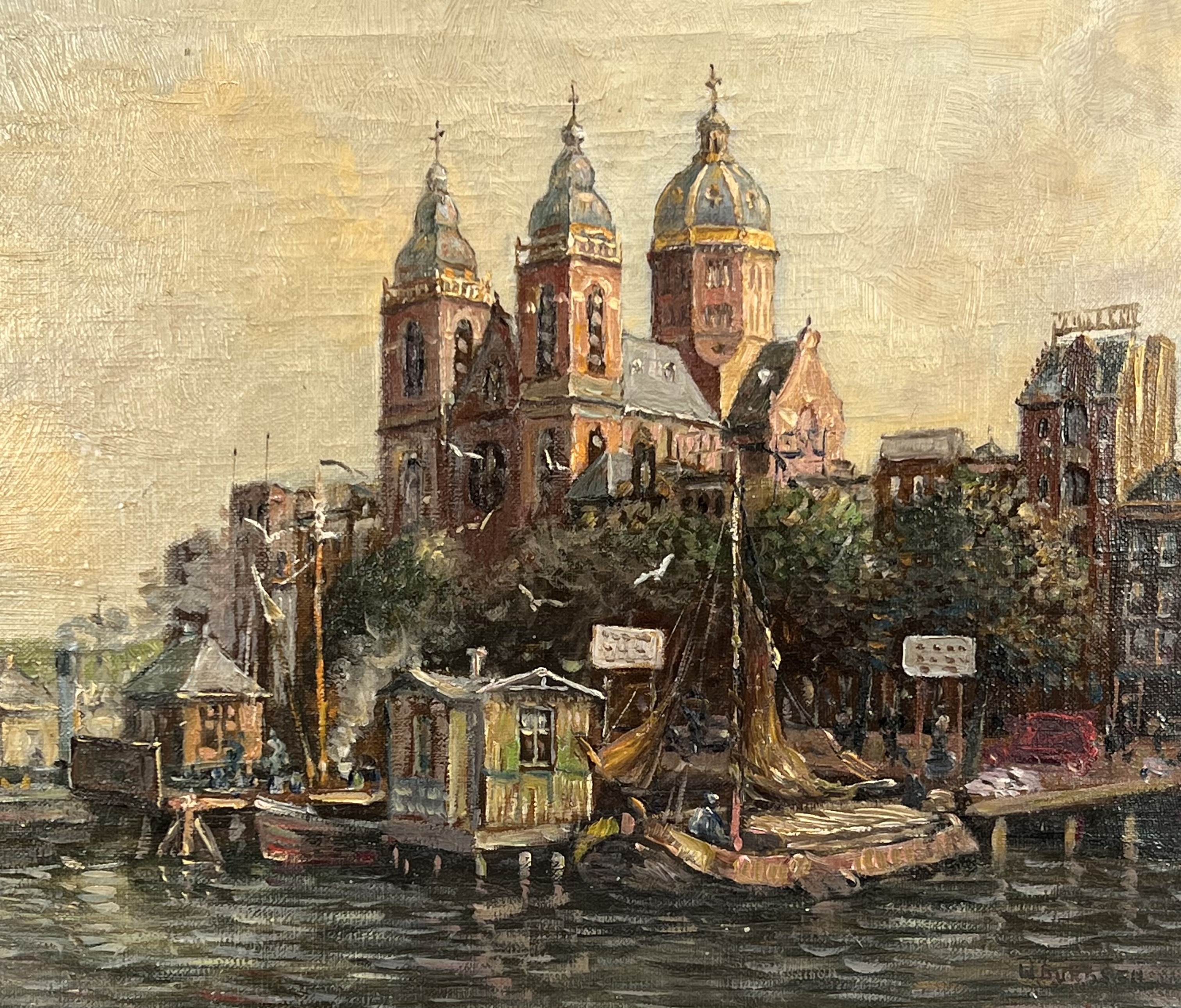 Schilderij van Amsterdam met de Sint-Nicolaaskerk, olieverfschilderij op doek. Rechtsonder gesigneerd, eerste helft 20e eeuw. |