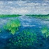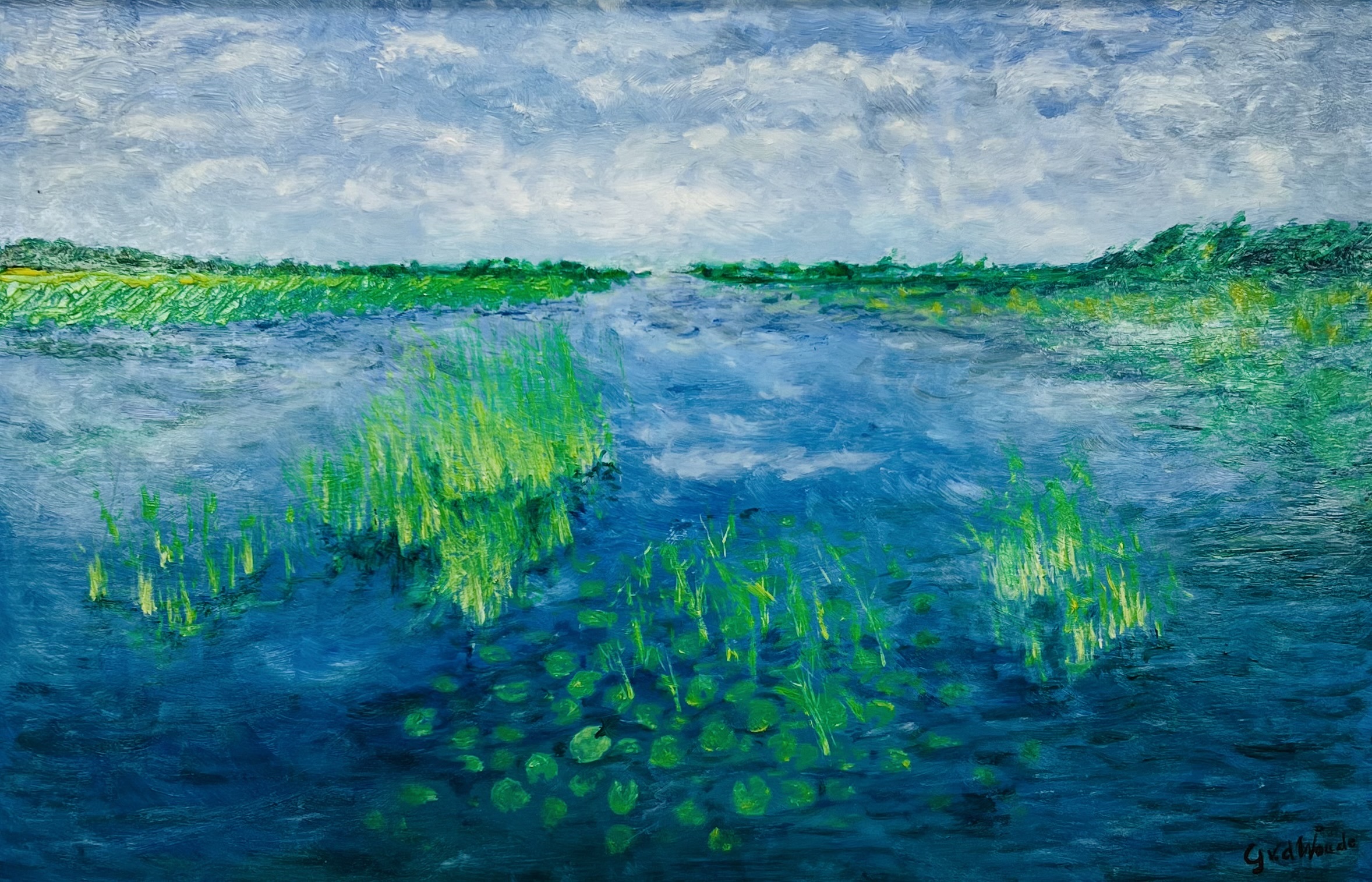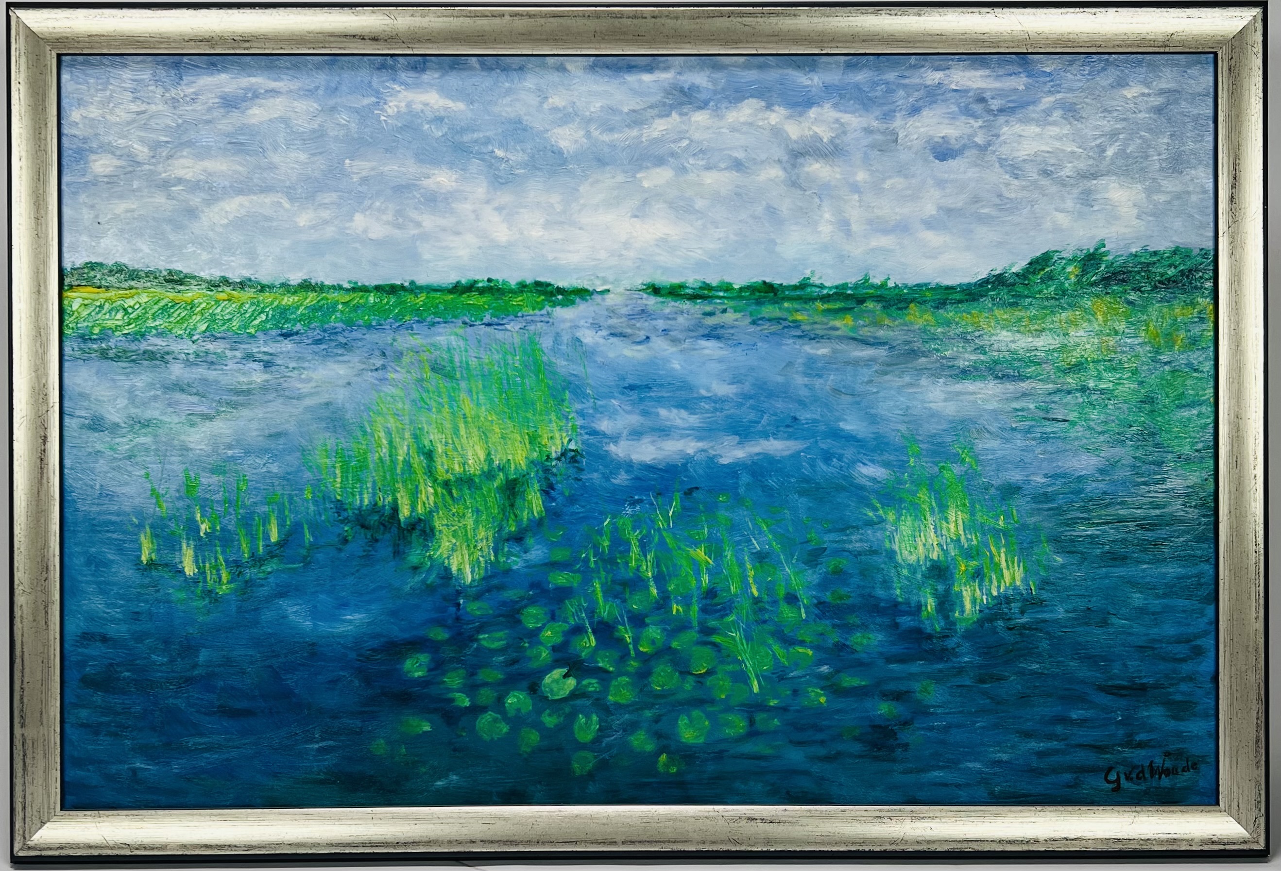Schilderij van een landschappelijk meergezicht door G. v.d. Woude, acrylverf op board. Rechtsonder gesigneerd, vierde kwart 20e eeuw. |