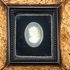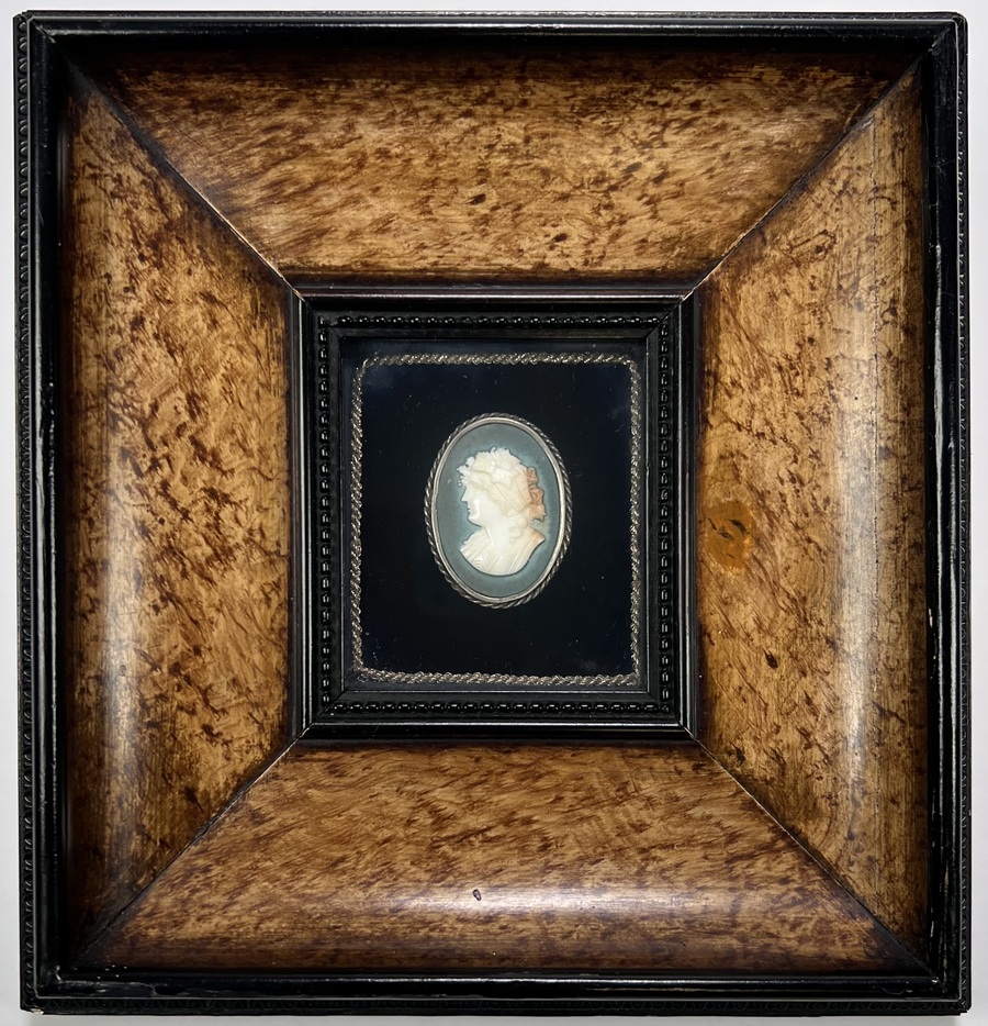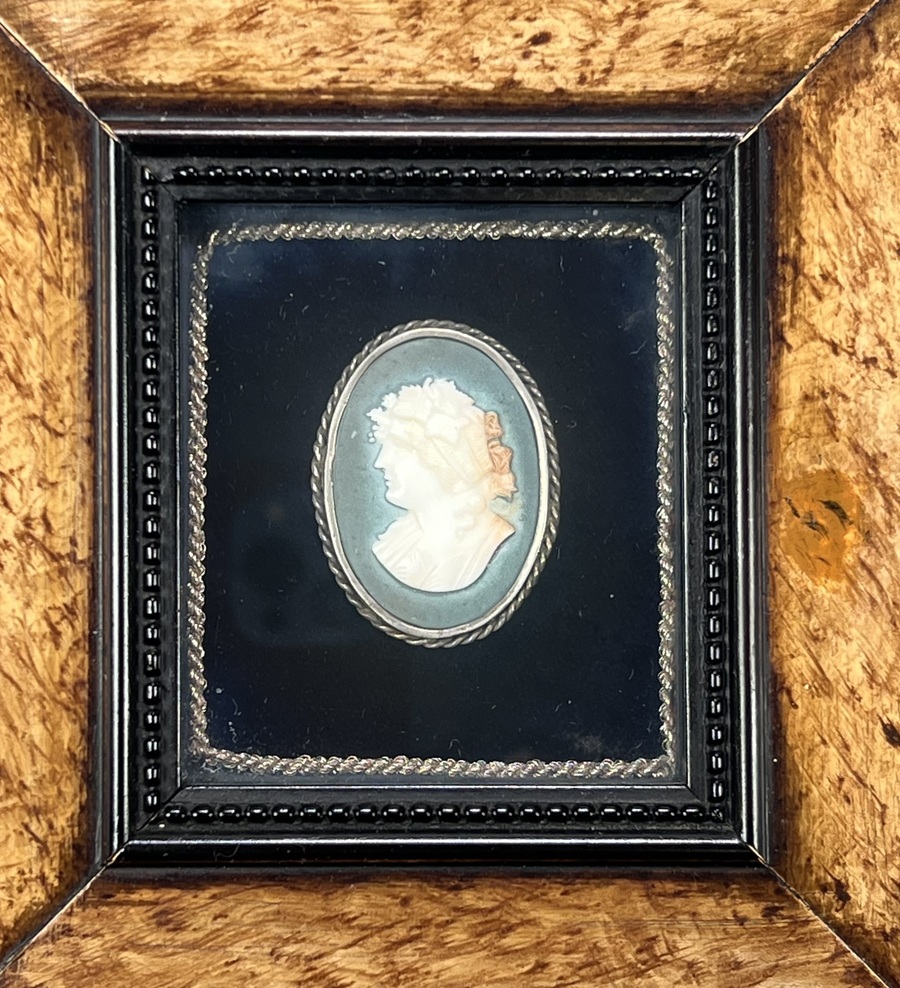 Ingelijste camee van schelp met zilveren omranding. Camee 19e eeuw, inlijsting jaren 70. |