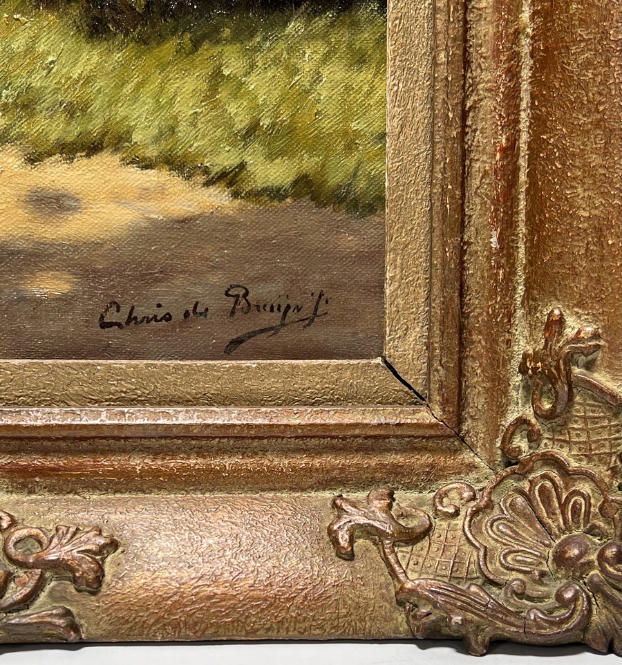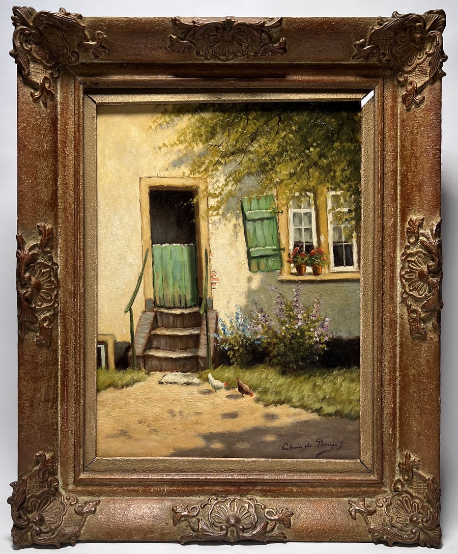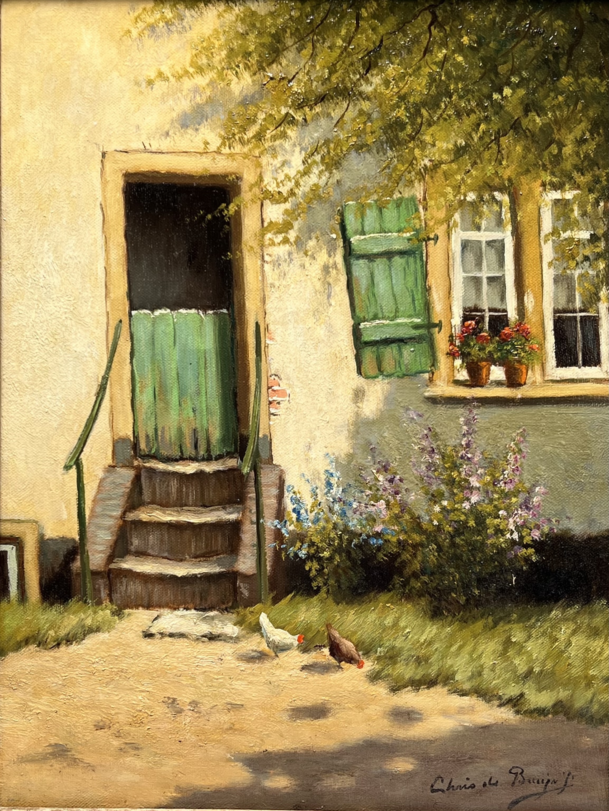 Schilderij van boerderijaanzicht met kippen door Chris de Bruijn Junior (1901-1974), olieverfschilderij op linnen. Rechtsonder gesigneerd, tweede kwart 20e eeuw. |