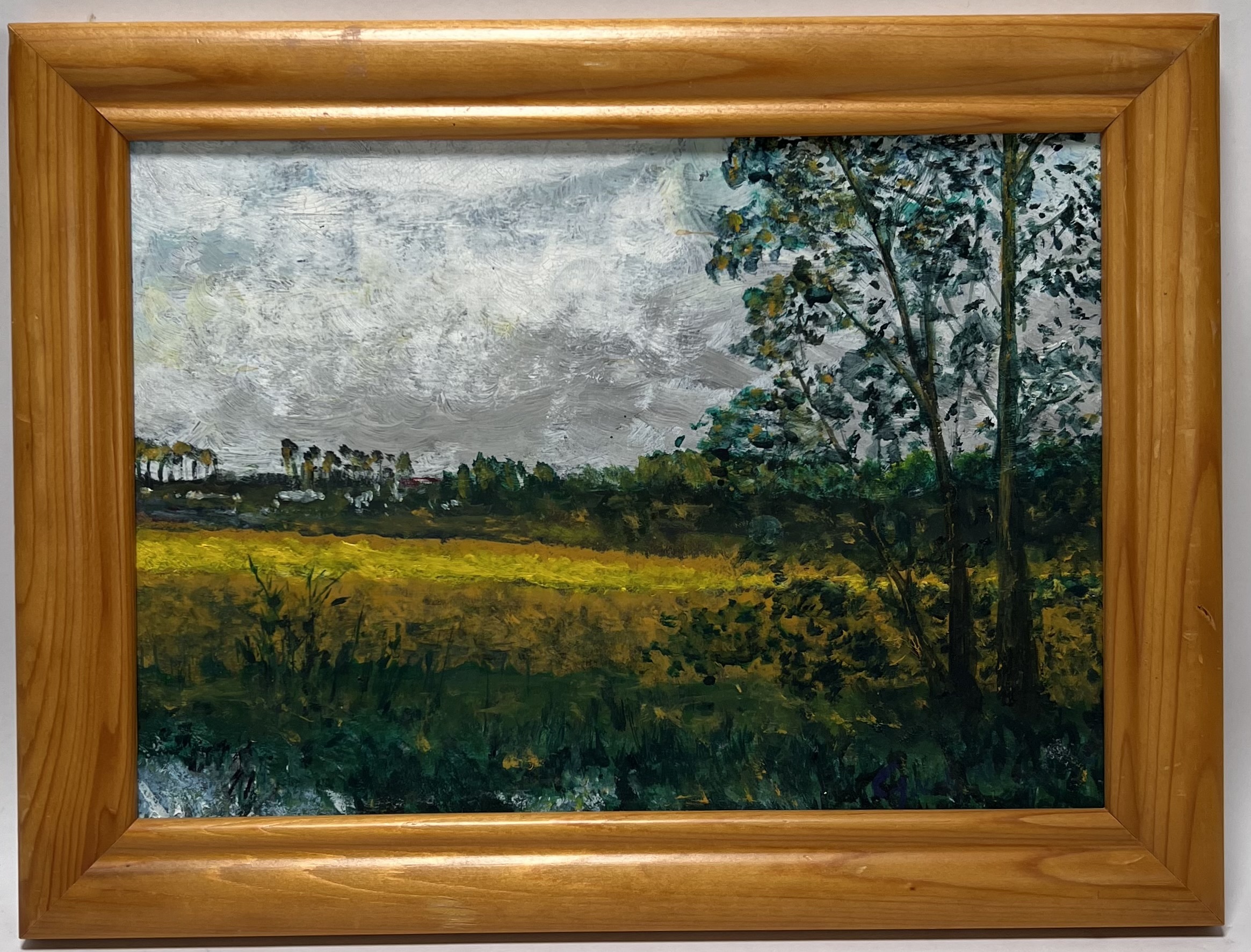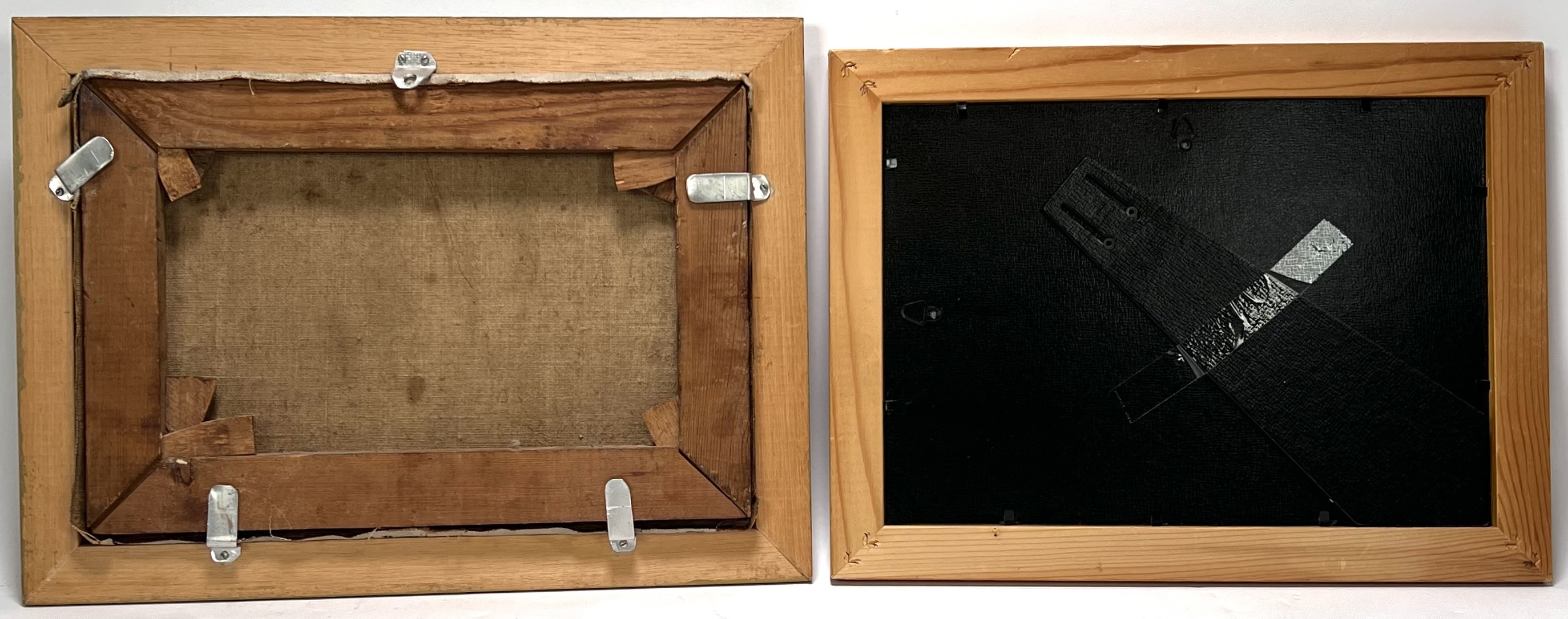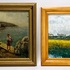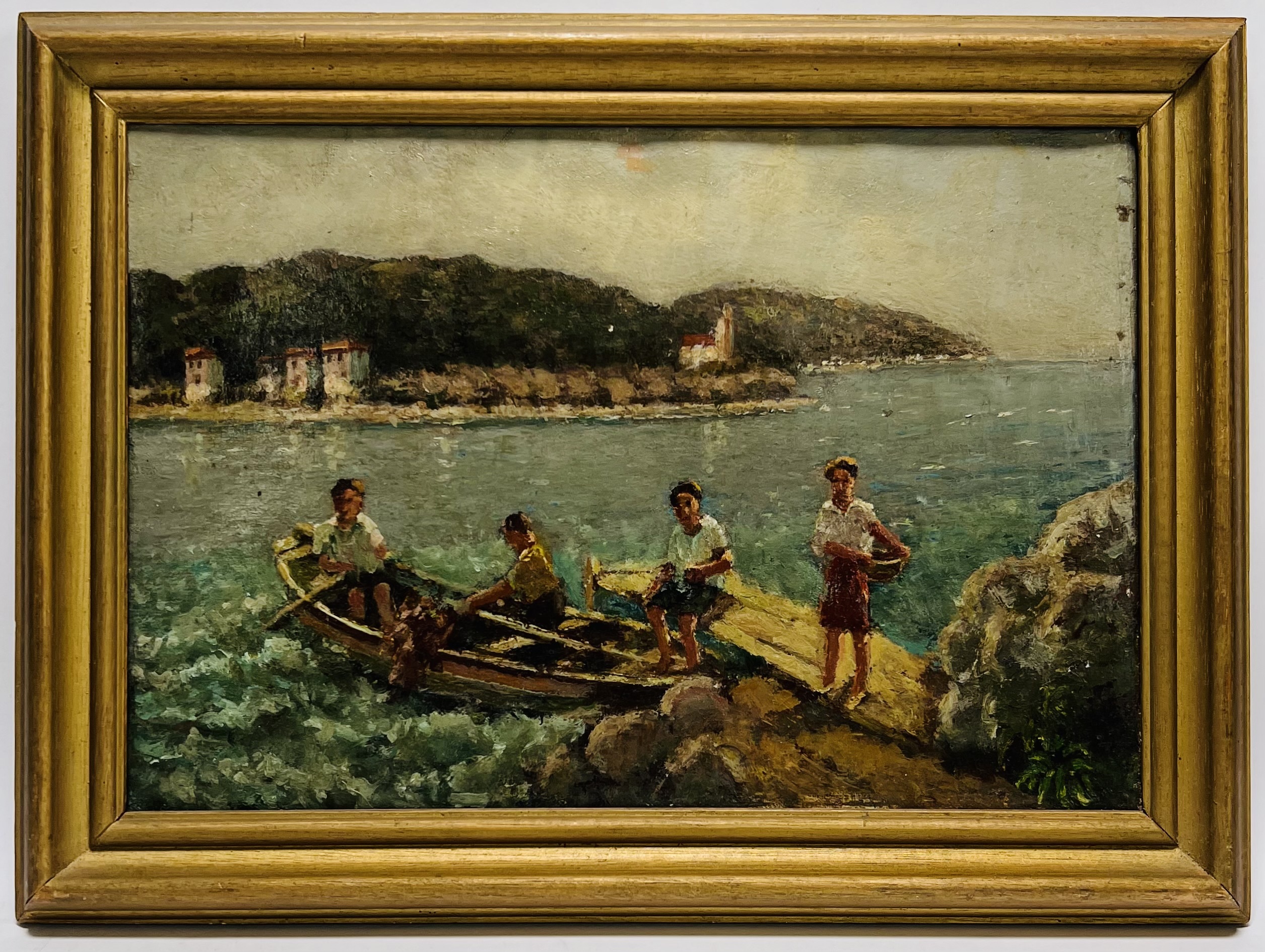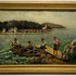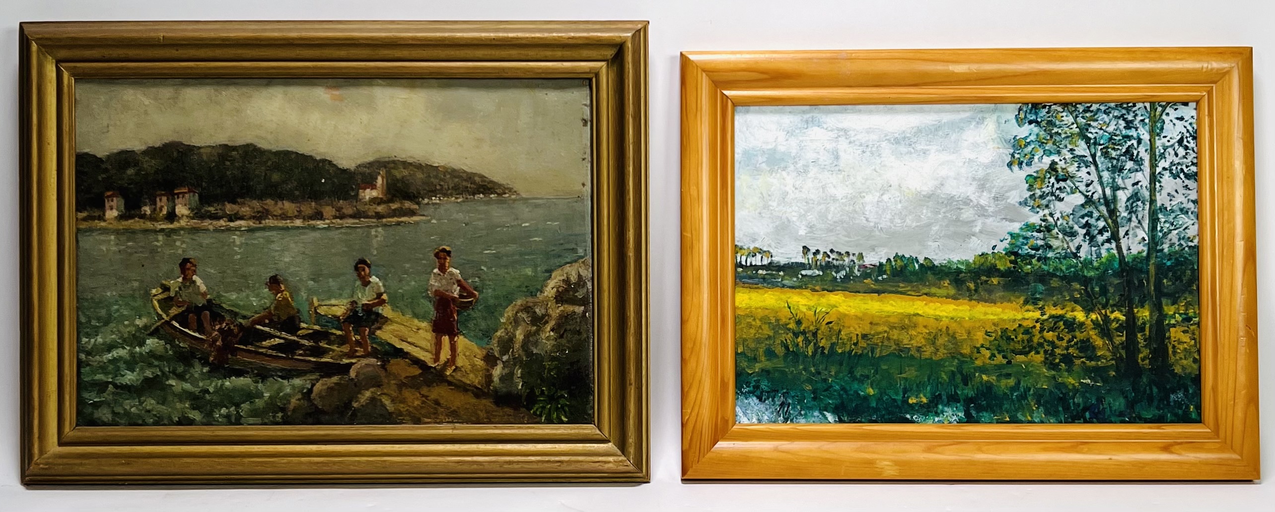 Schilderij van een Noord Italiaans meergezicht met roeiers aan de waterkant. Olieverfschilderij op linnen. Anoniem, jaren 50/60. Daarbij een schilderijtje met landschappelijke voorstelling door G. van der Woude, eind 20e eeuw. |