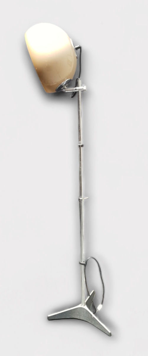 Vintage vloerlamp met plexiglazen beige lampenkap door Raak Amsterdam. Onderzijde voet gemerkt, jaren 70. |