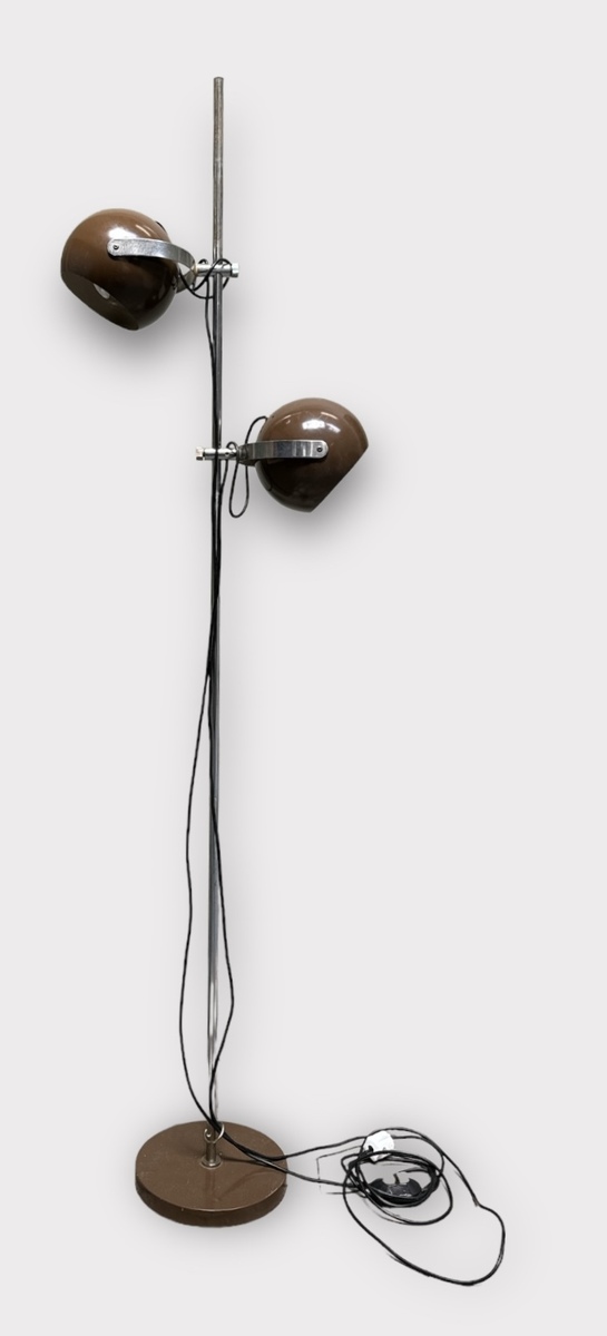Vintage bruine vloerlamp met twee verstelbare metalen bollen. Gefabriceerd door Anvia Almelo in de jaren 70. |