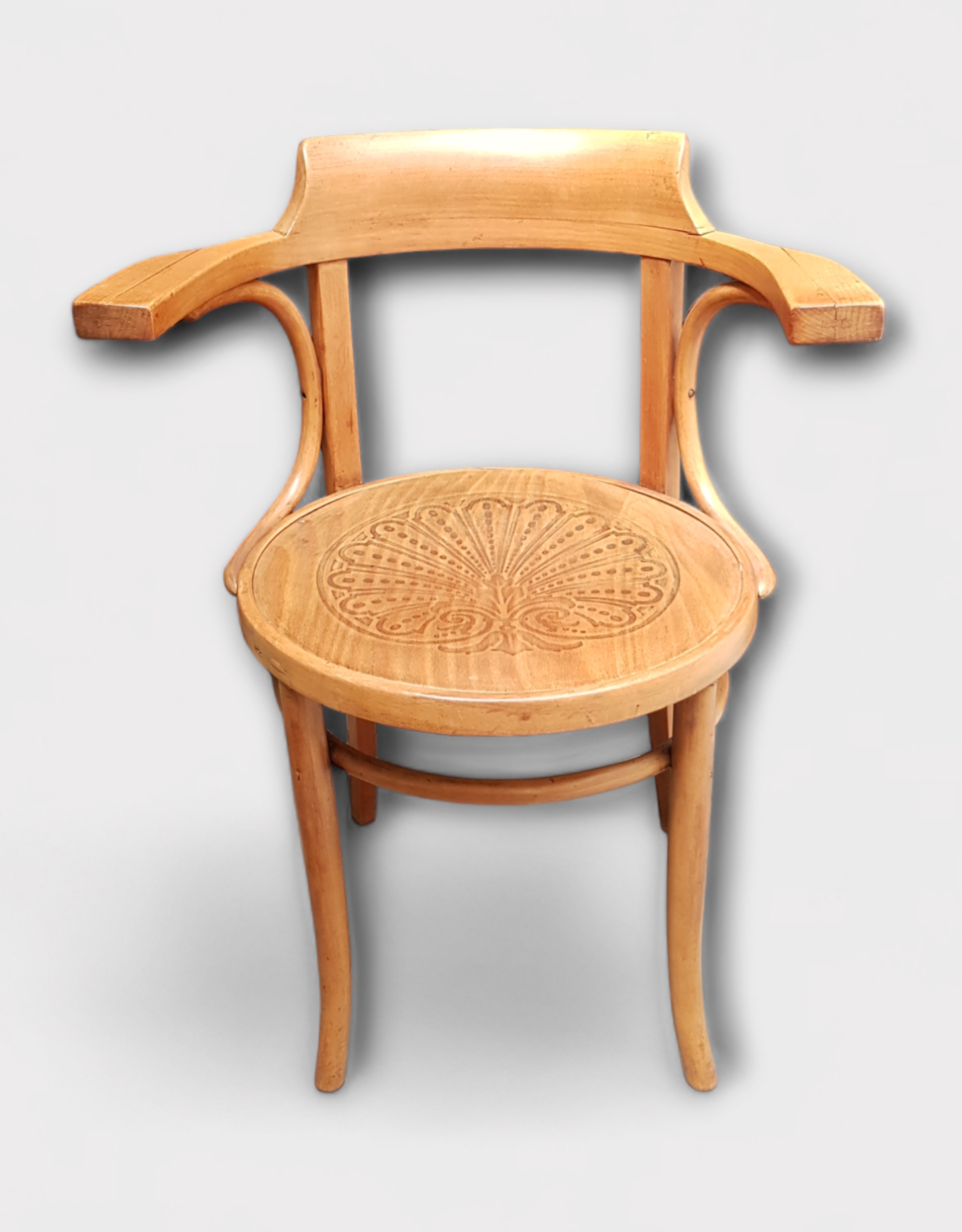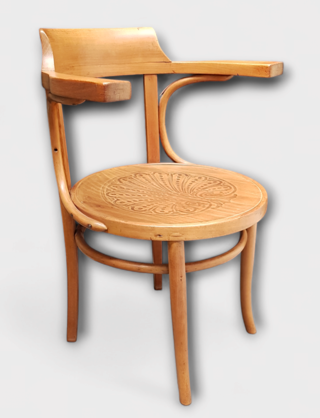 Beukenhouten Thonet stijl armstoel met gedecoreerde zitting. Aan de onderzijde papieren label Levee aanwezig, midden 20e eeuw. |