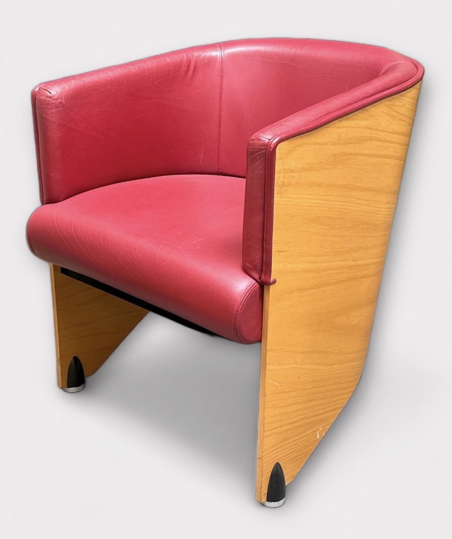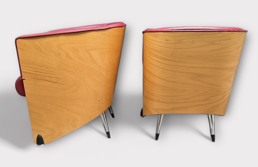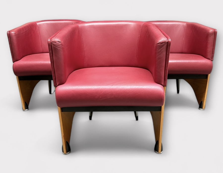 Drie lederen stoelen met gebogen multiplex achterzijde staande op metalen poten, gefabriceerd door Meubelfabrikant Gelderland, modelnaam Lande Pencil. Begin 20e eeuw. |