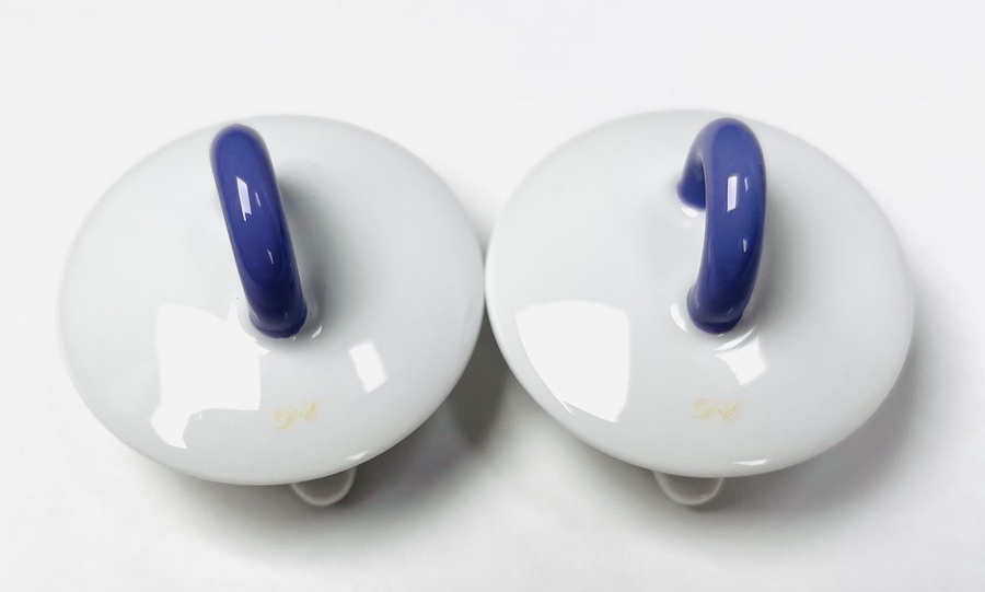 Twee porseleinen theepotten en kopjes, modelnaam “Tea for one” van de Duitse porselein fabrikant Arzberg, naar het ontwerp van designer Matteo Thun, die onderdeel was van de Memphis-groep. Tevens een suikerpot van dezelfde ontwerper. Twee deksels met DE logo (Douwe Egberts). Jaren 80/90. |