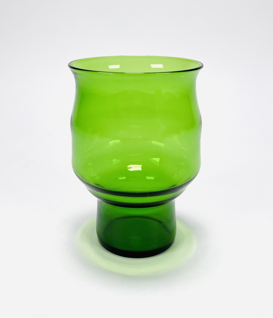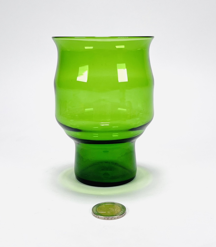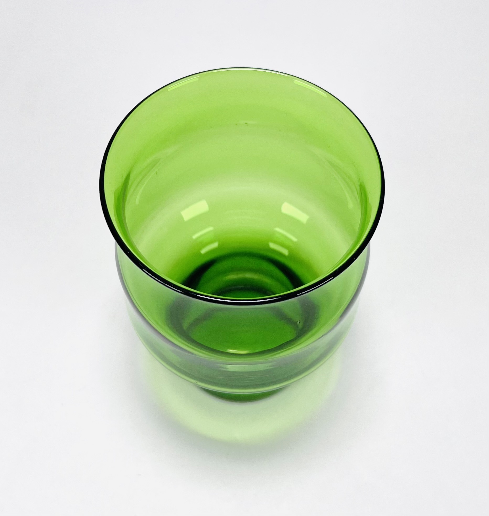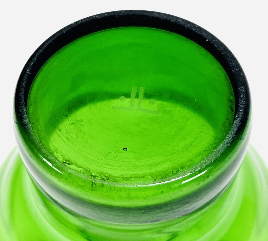 Groene vaas naar ontwerp van Christiaan Johannes Lanooy en uitvoering Glasfabriek Leerdam. Aan de onderzijde gesigneerd met etsmerk Lanooy Leerdam. Uitvoering begin jaren 20. |