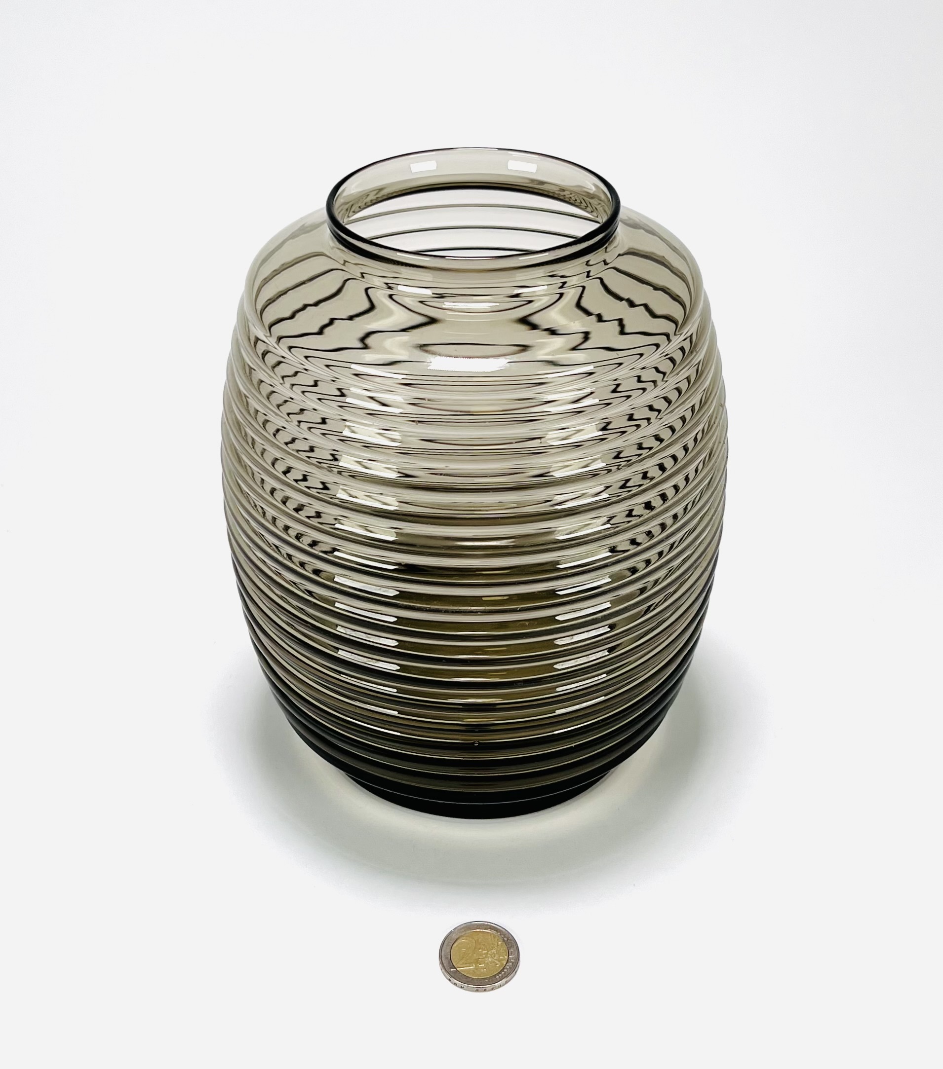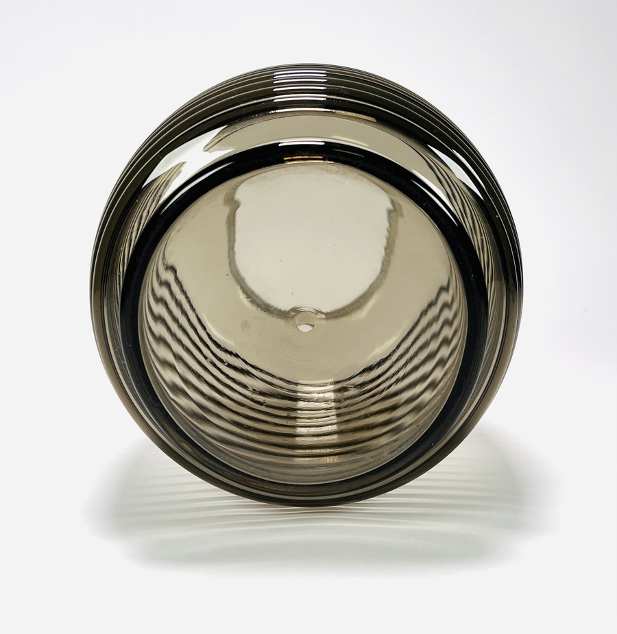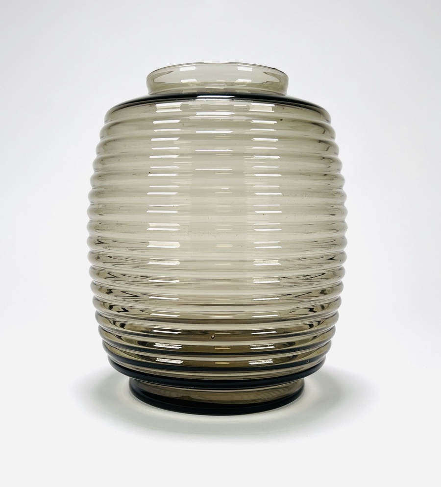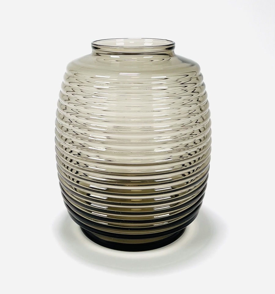 Fumékleurige vaas in tonmodel met verticale ribbelstructuur naar ontwerp van Andries Dirk Copier, modelnummer GL1747. Uitgevoerd door Glasfabriek Leerdam, ontwerp stamt uit 1953. |