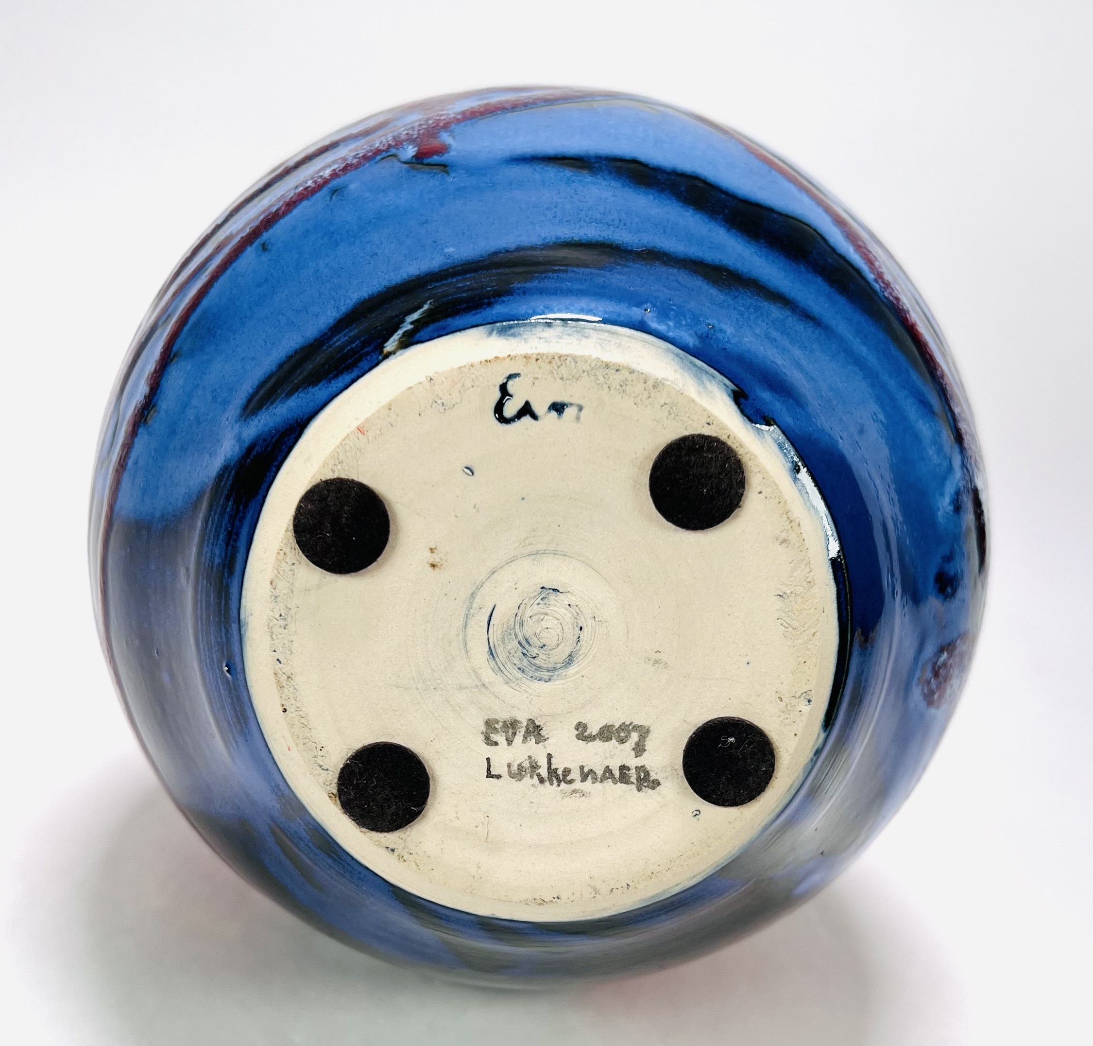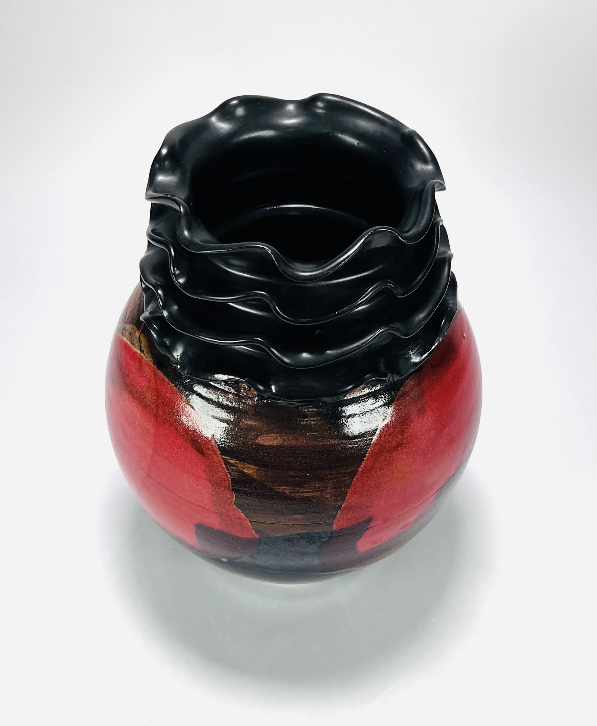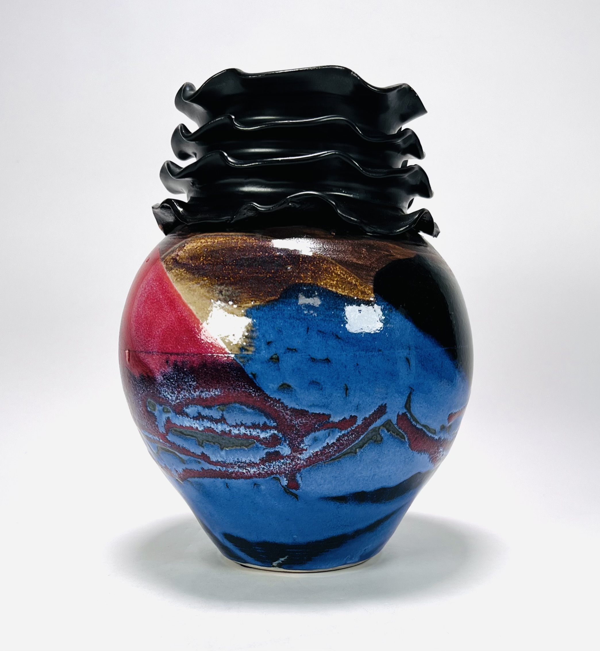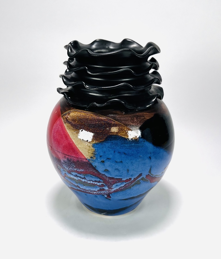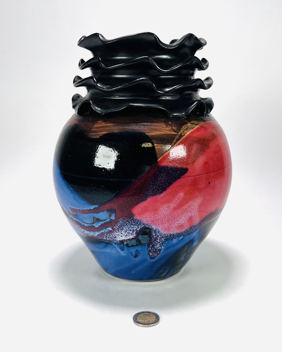 Polychroom geglazuurde vaas met meervoudig golvende kraag door Eva Lukkenaer (Pottenbakkerij De Vuurplaats te Wijster). Aan de onderzijde gesigneerd en gedateerd 2007. |