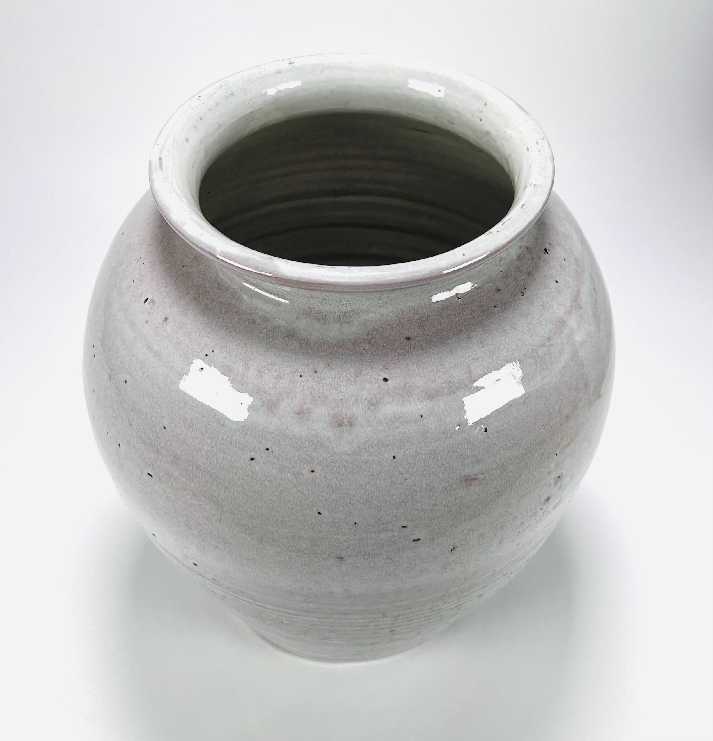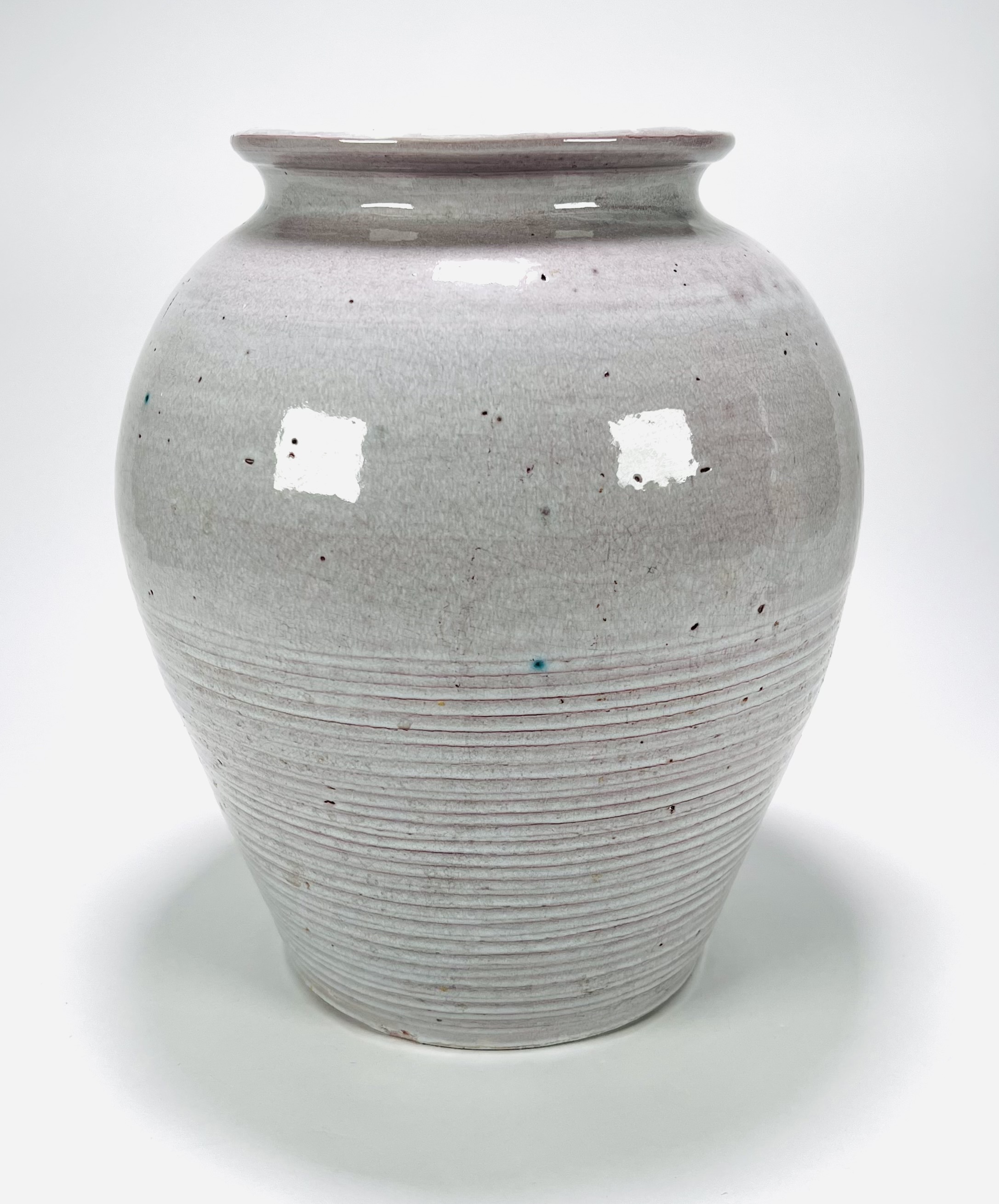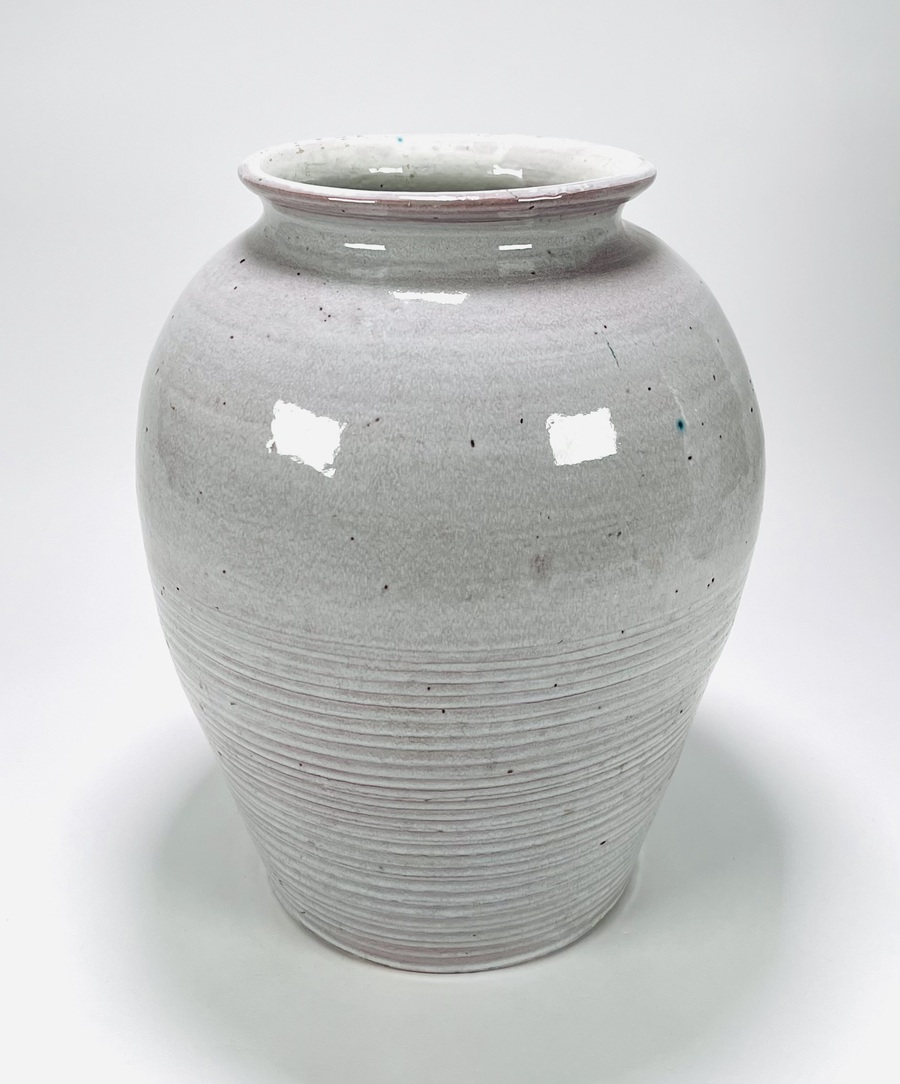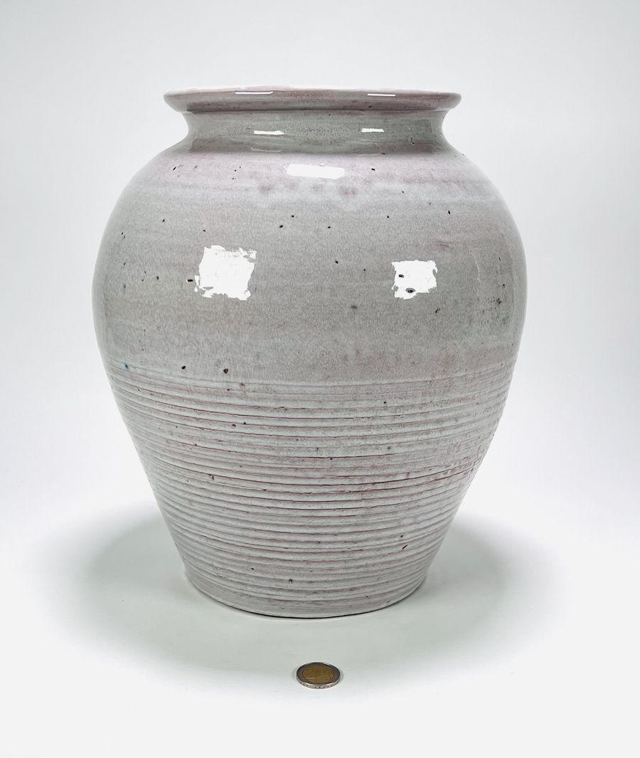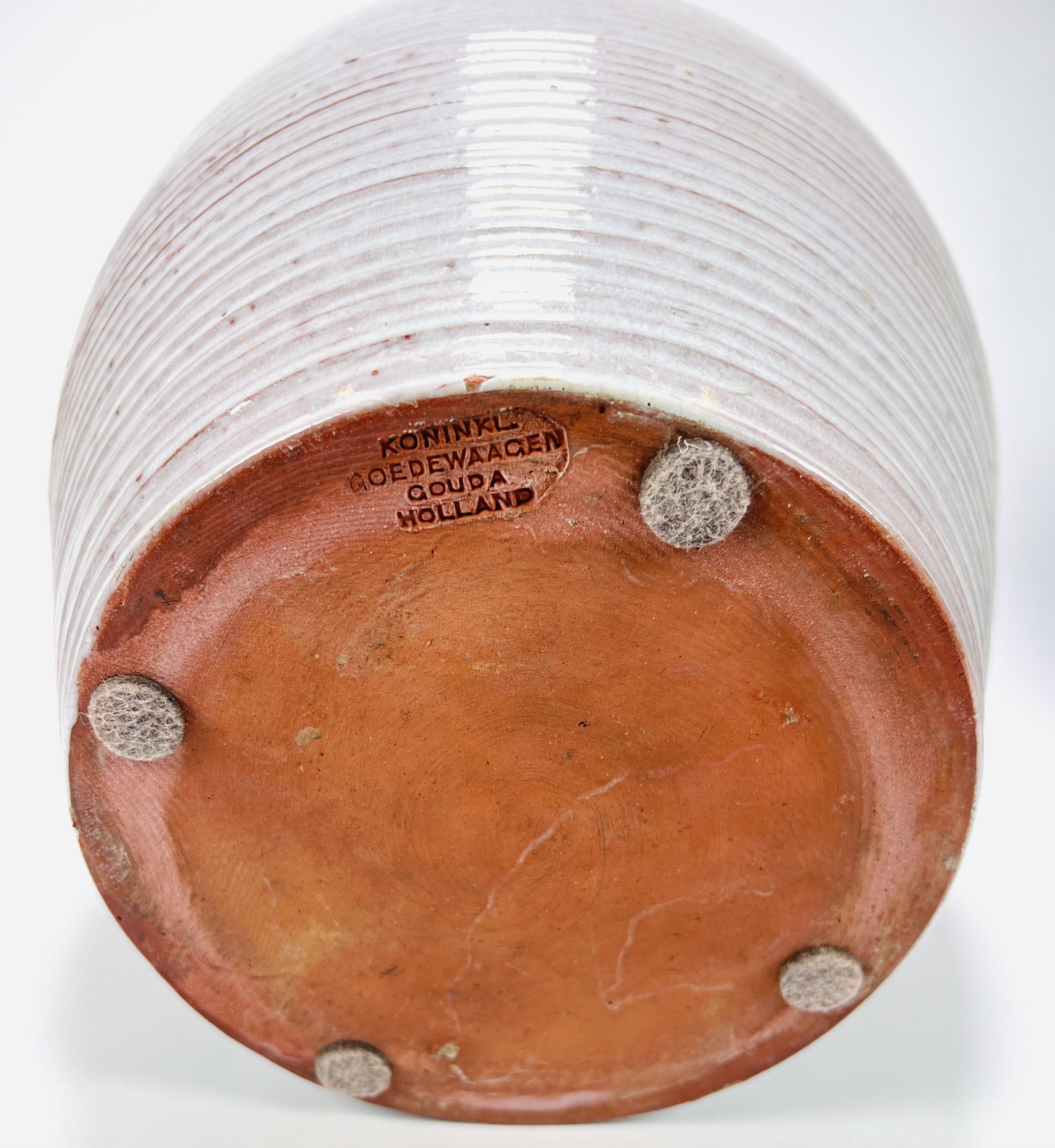 Aardewerken vaas met horizontale ribbelstructuur voorzien van lichtgrijze glansglazuur door Koninklijke Goedewaagen, Gouda. Betreft een vaas op groot formaat. Aan de onderzijde gemerkt, derde kwart 20e eeuw. |