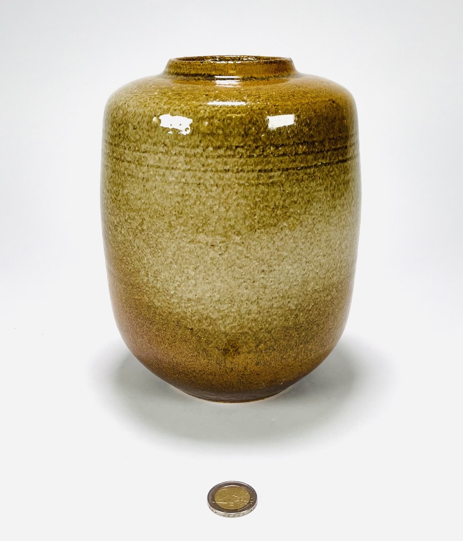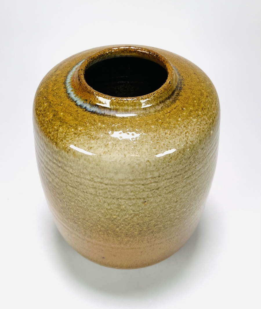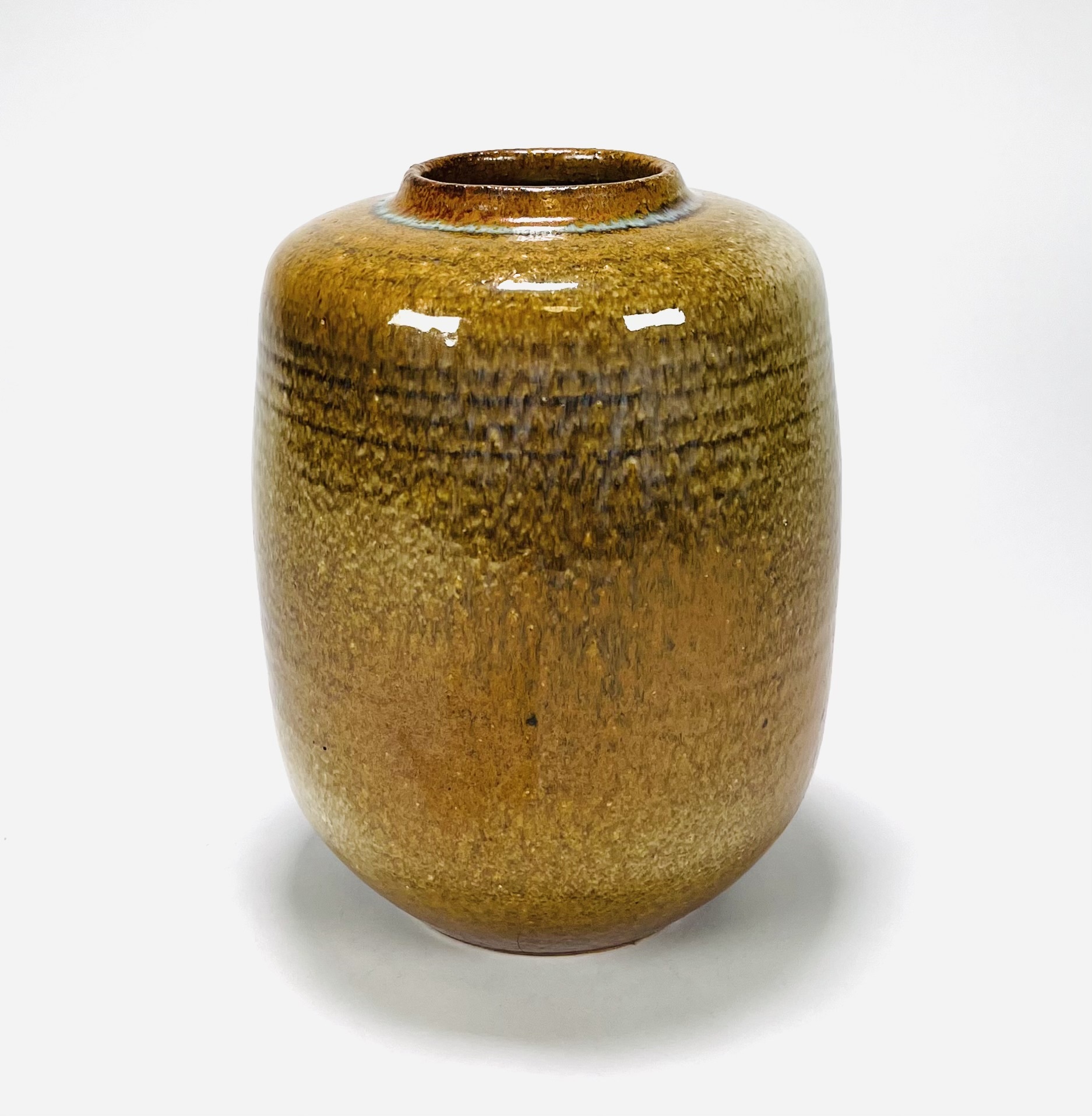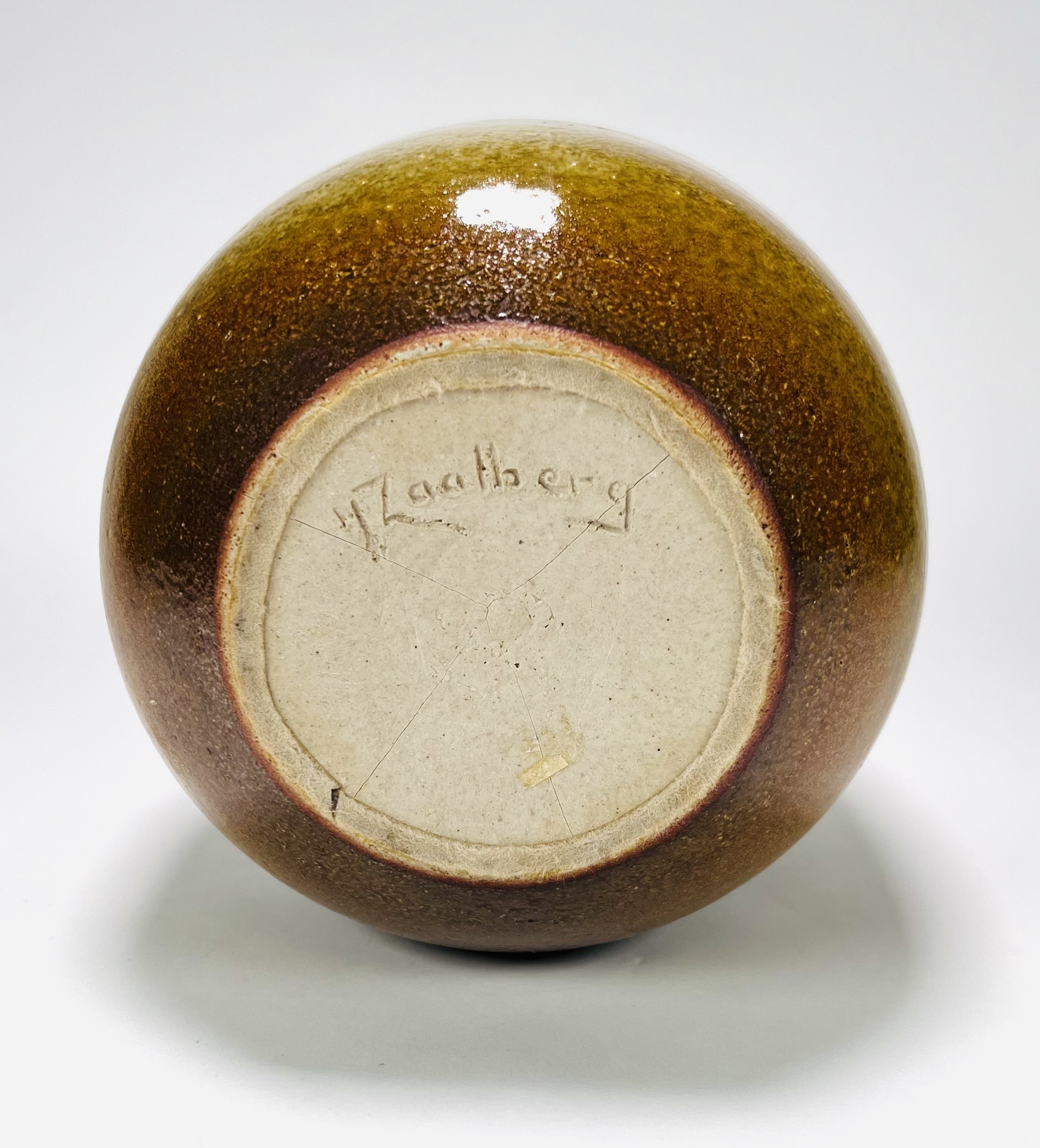 Keramieken vaas met bruin glansglazuur en zeegroene cirkel door Herman Zaalberg. Aan de onderzijde gesigneerd H. Zaalberg, jaren 70. |