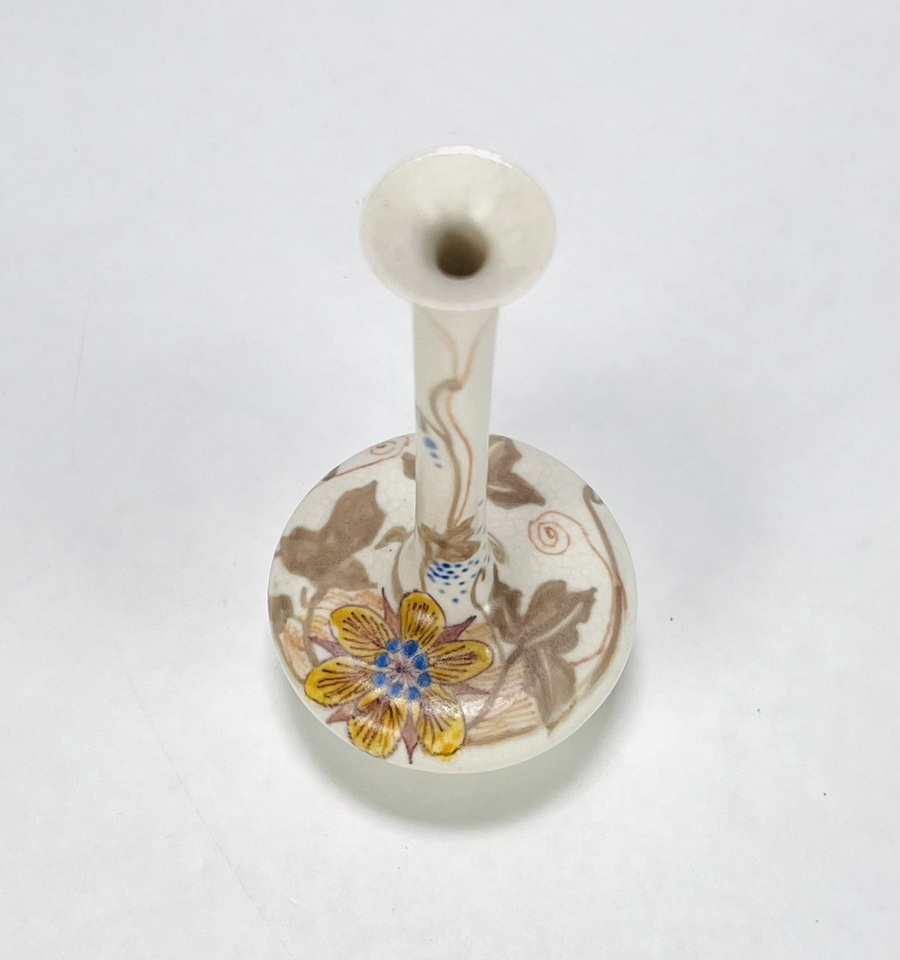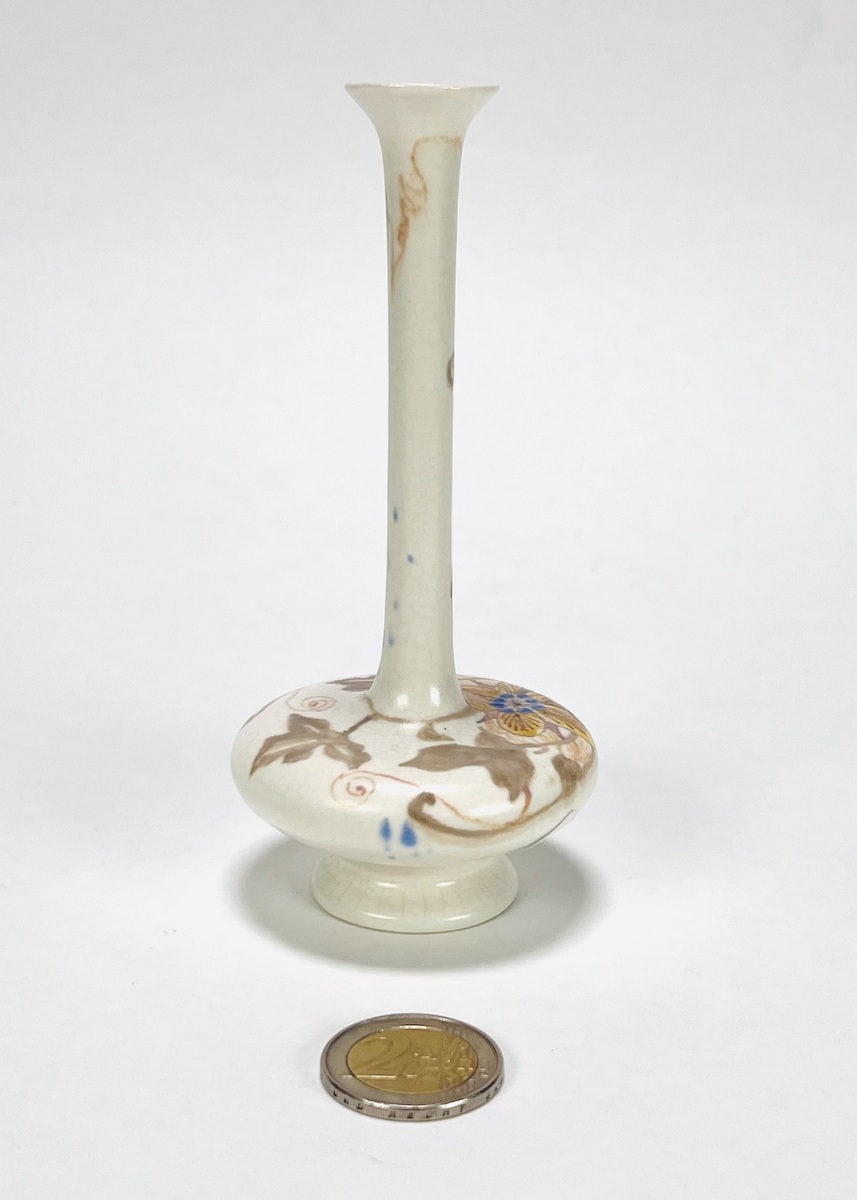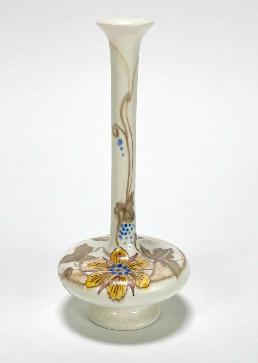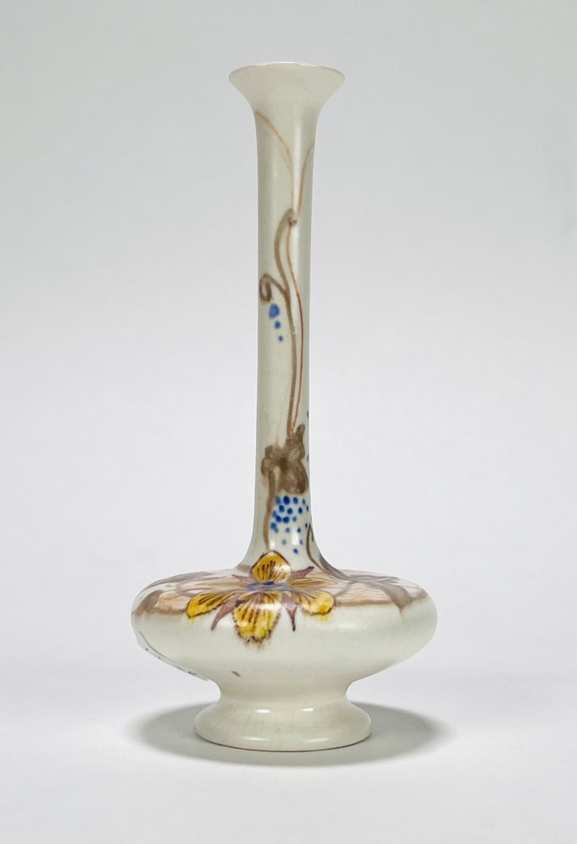 Art Nouveau vaasje van Plateelbakkerij Zuid-Holland gedecoreerd met floraal decor. Aan de onderzijde gemerkt en vermelding initialen plateelschilder M.v.d.K. Begin 1900. |