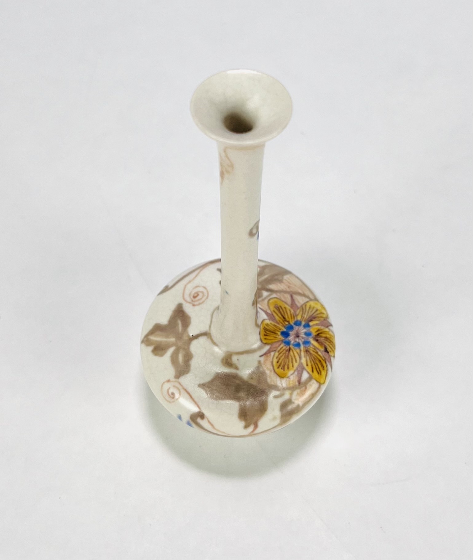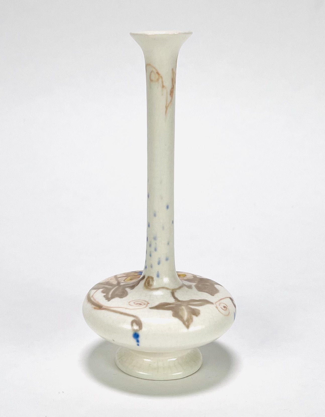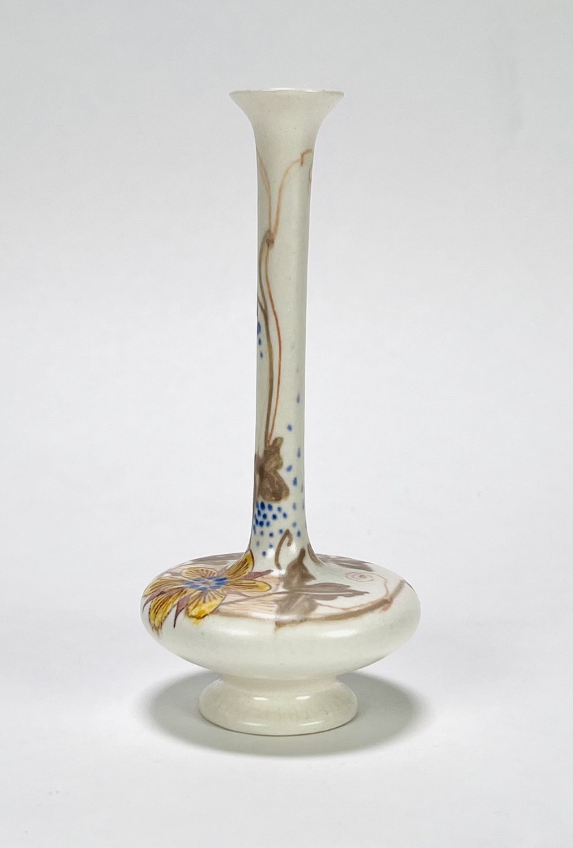Art Nouveau vaasje van Plateelbakkerij Zuid-Holland gedecoreerd met floraal decor. Aan de onderzijde gemerkt en vermelding initialen plateelschilder M.v.d.K. Begin 1900. |