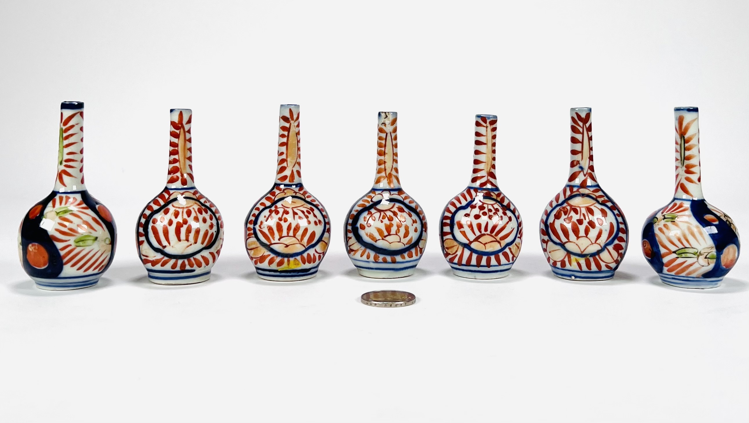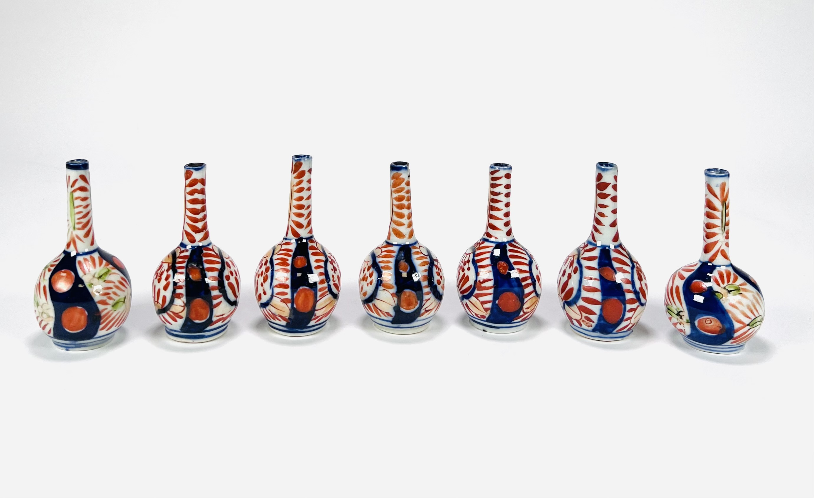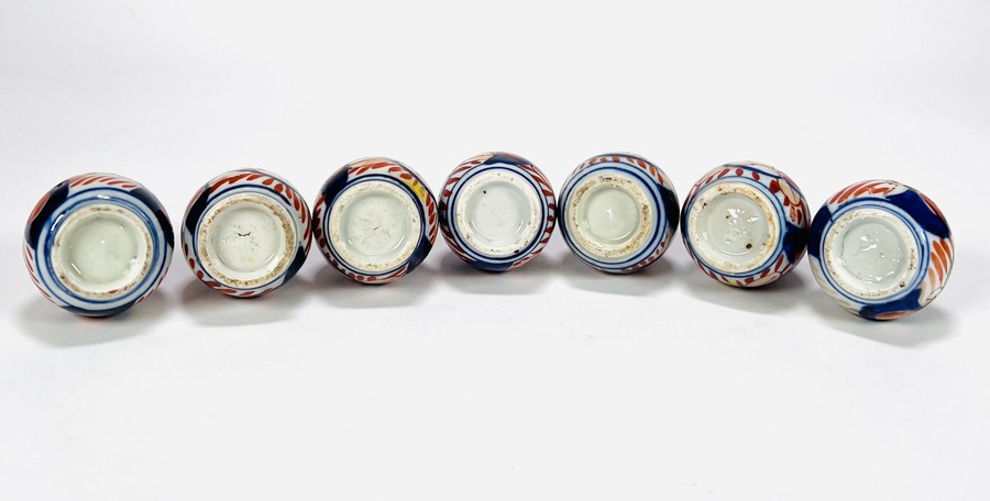 Zeven porseleinen miniatuur Imari vaasjes. Japan, eind 19e eeuw. |