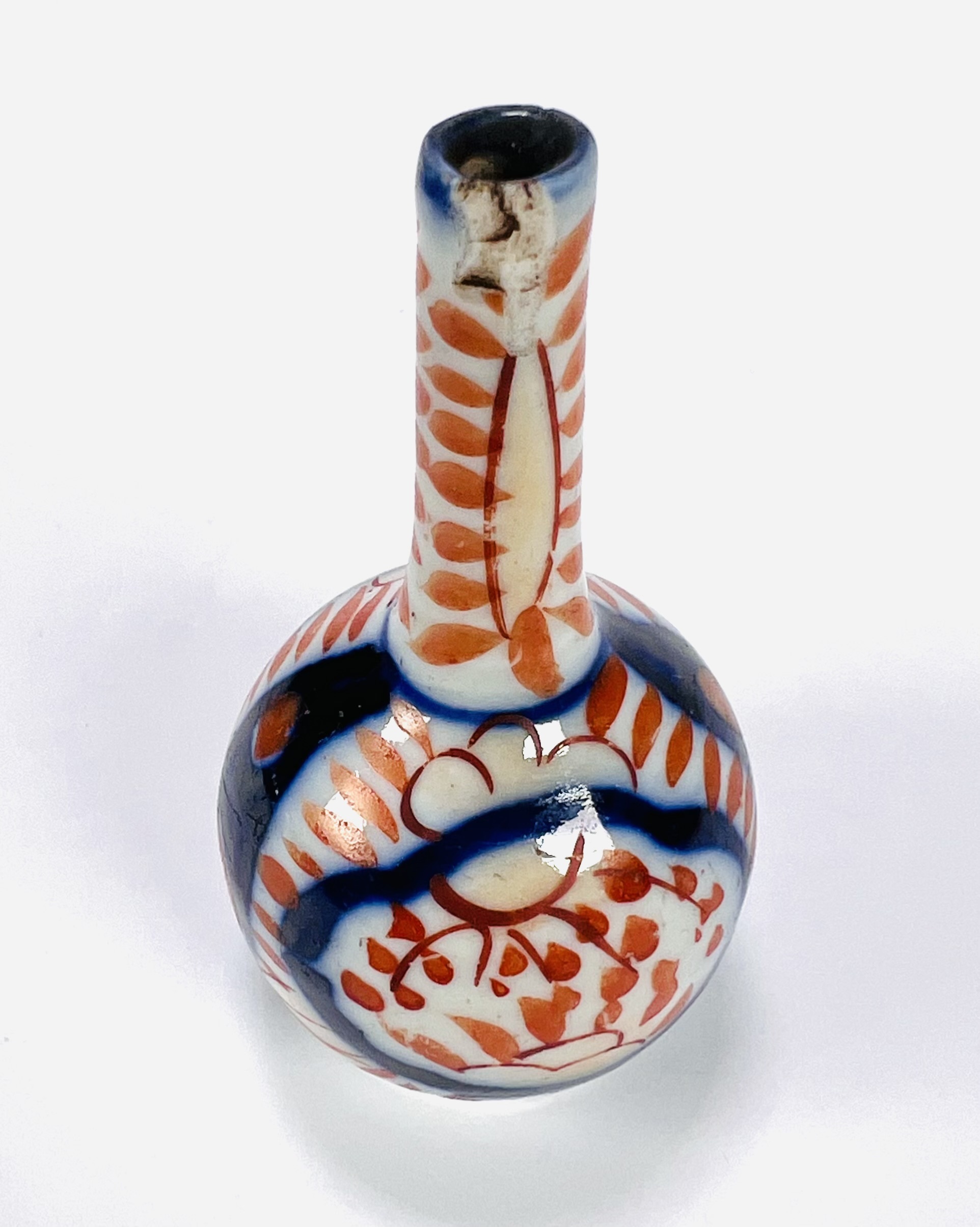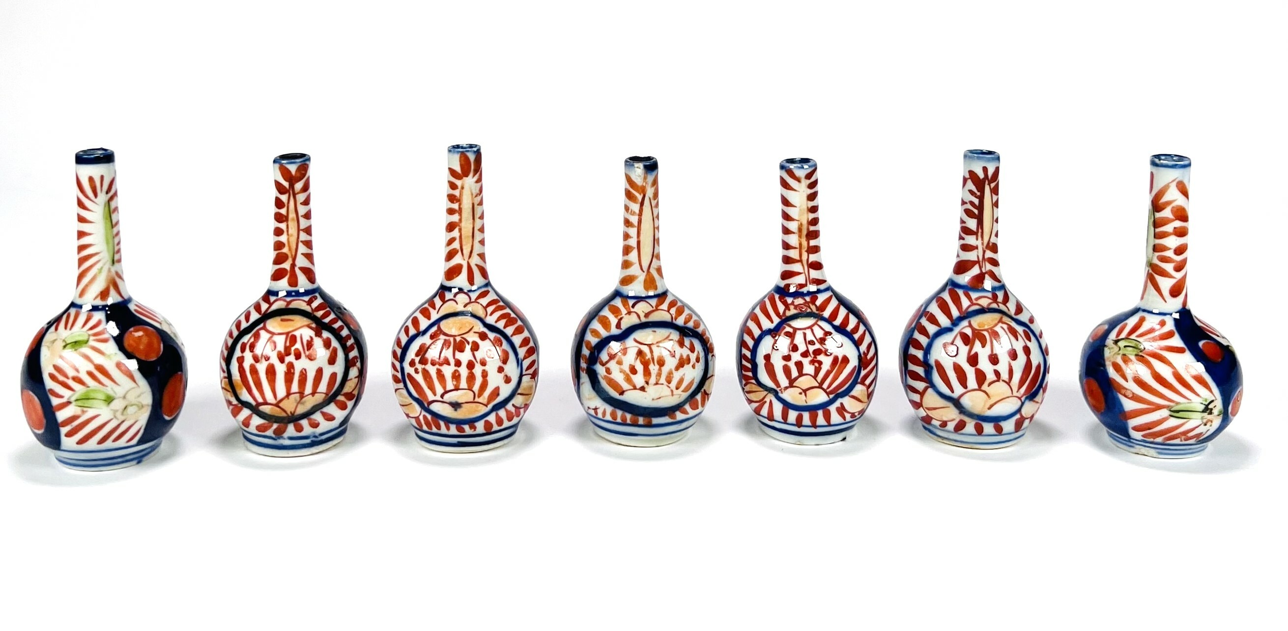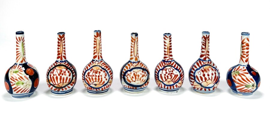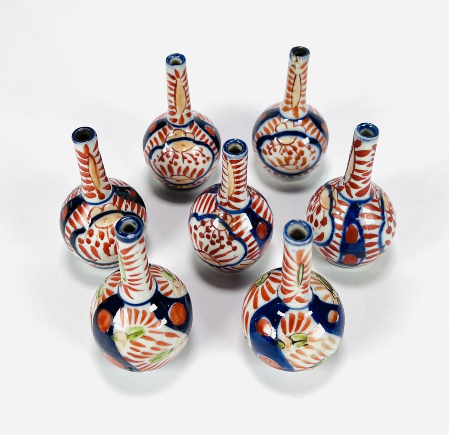 Zeven porseleinen miniatuur Imari vaasjes. Japan, eind 19e eeuw. |