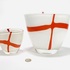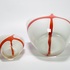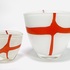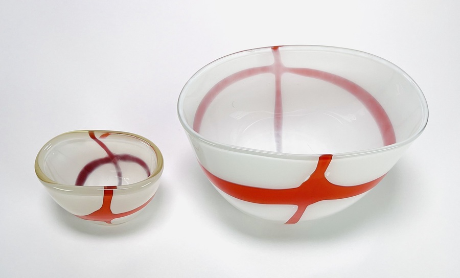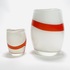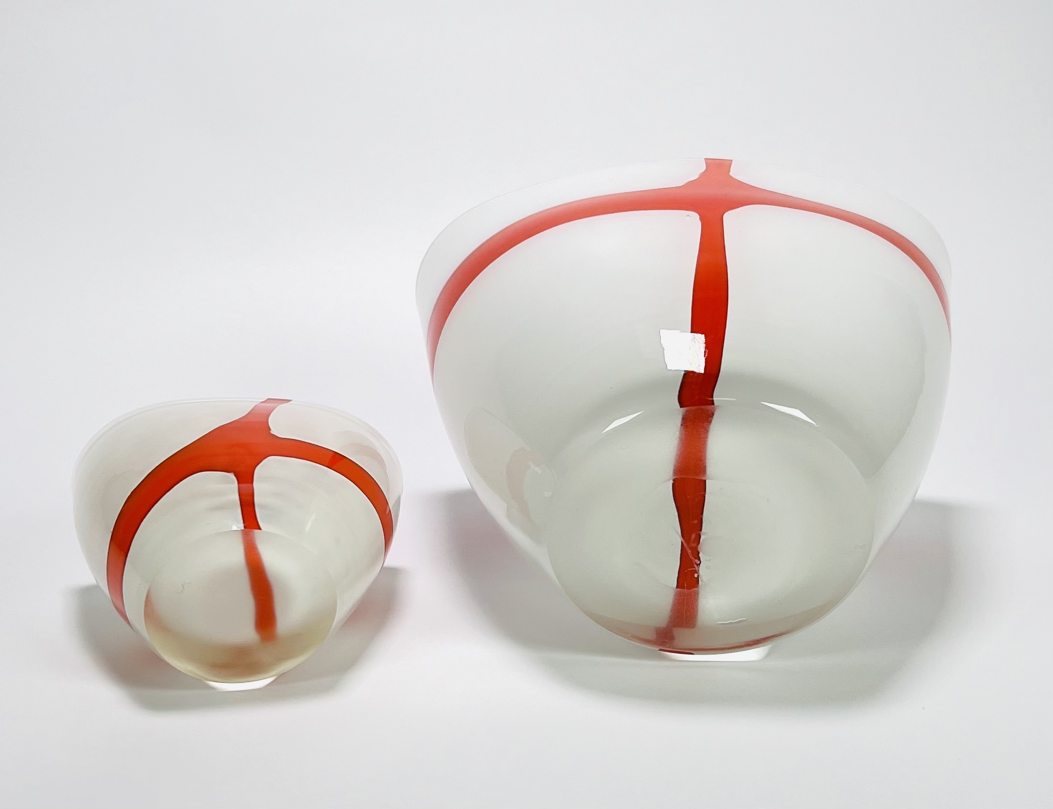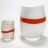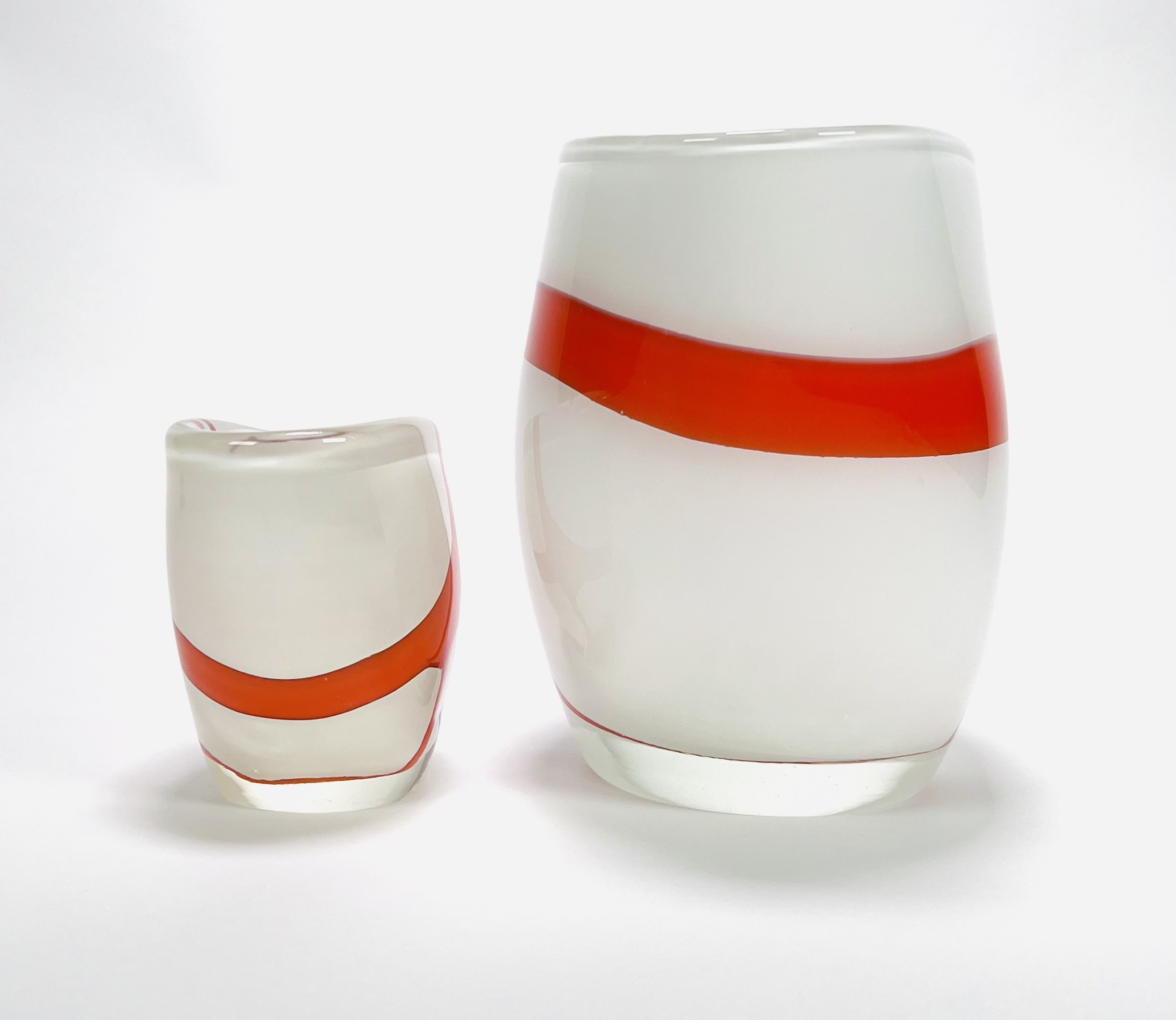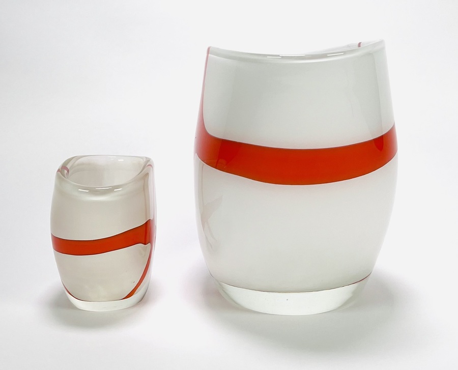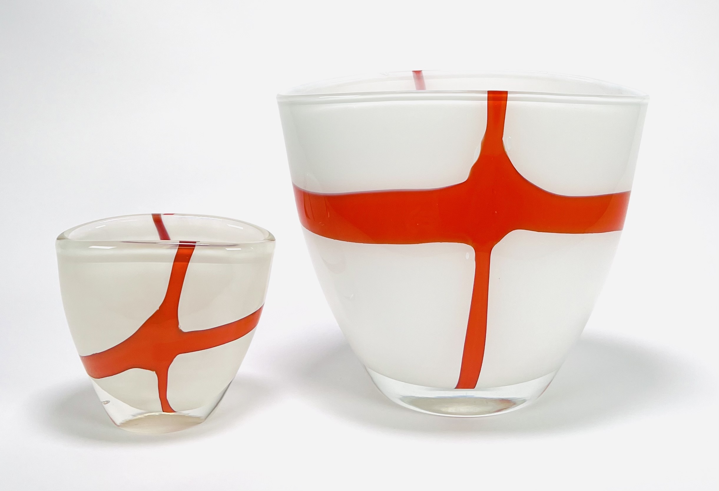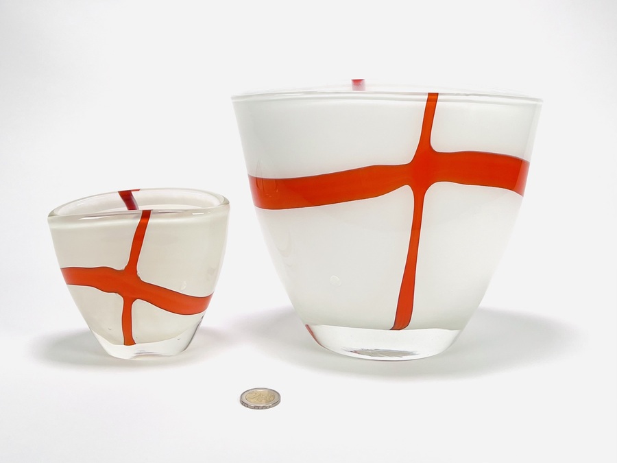 Twee dikwandige dubbellaagse melkglazen vazen met oranje kruis decor, 21e eeuw. |