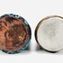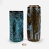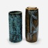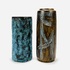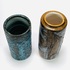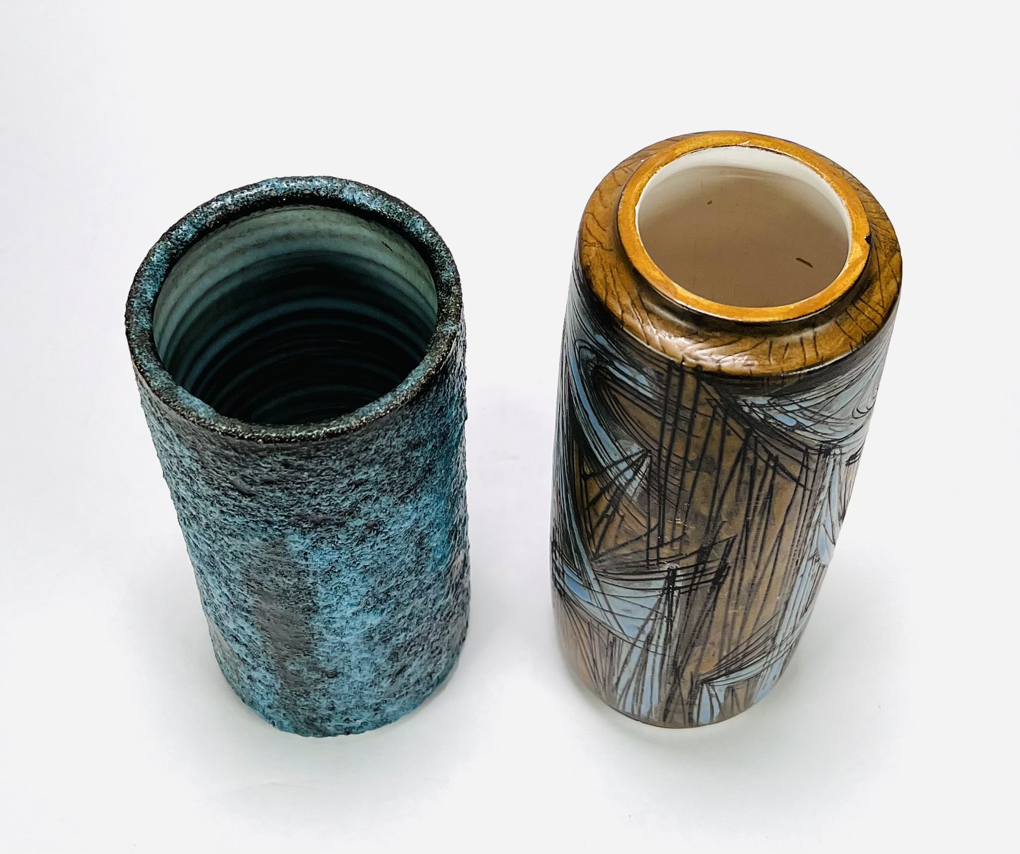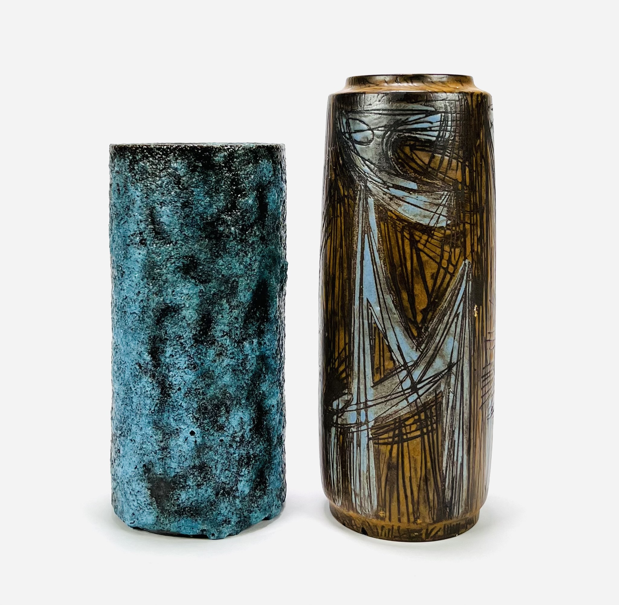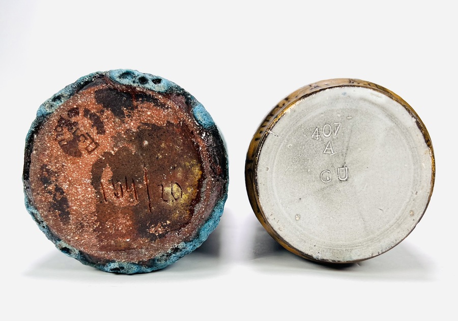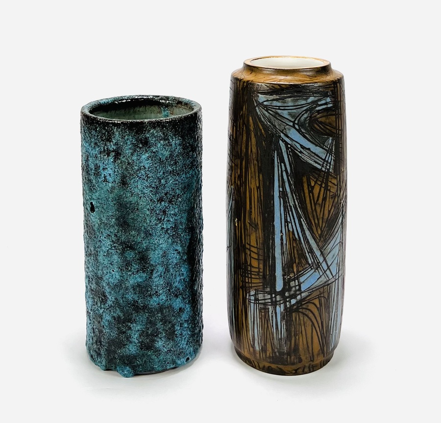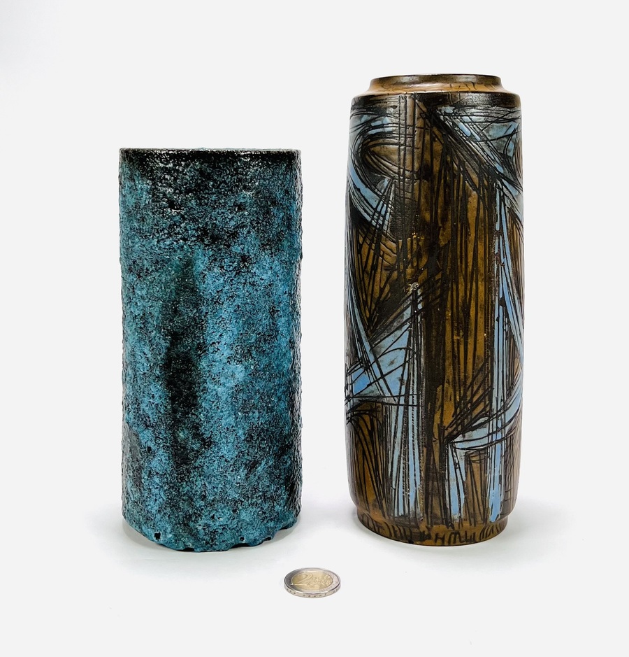 Twee keramieken vazen waaronder een cilindrische vaas met lichtblauw bruisglazuur door Pieter Groeneveldt, aan de onderzijde gemerkt en voorzien van modelnummer 104/20. Daarnaast een bruin-blauwe cilindrische vintage vaas door Cor Unum gemonogrammeerd CU en vermelding modelnummer 407 A, jaren 60. |