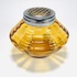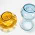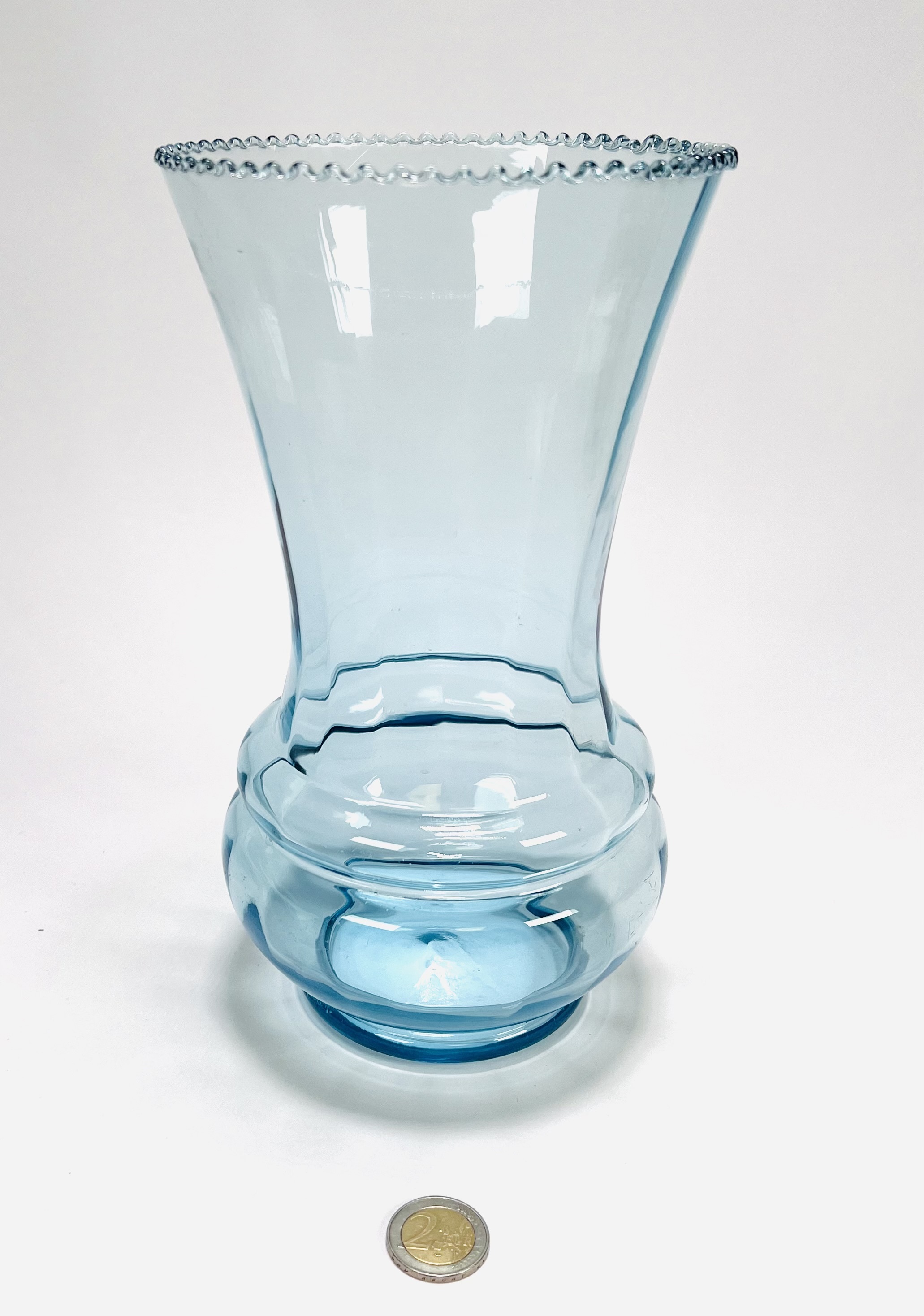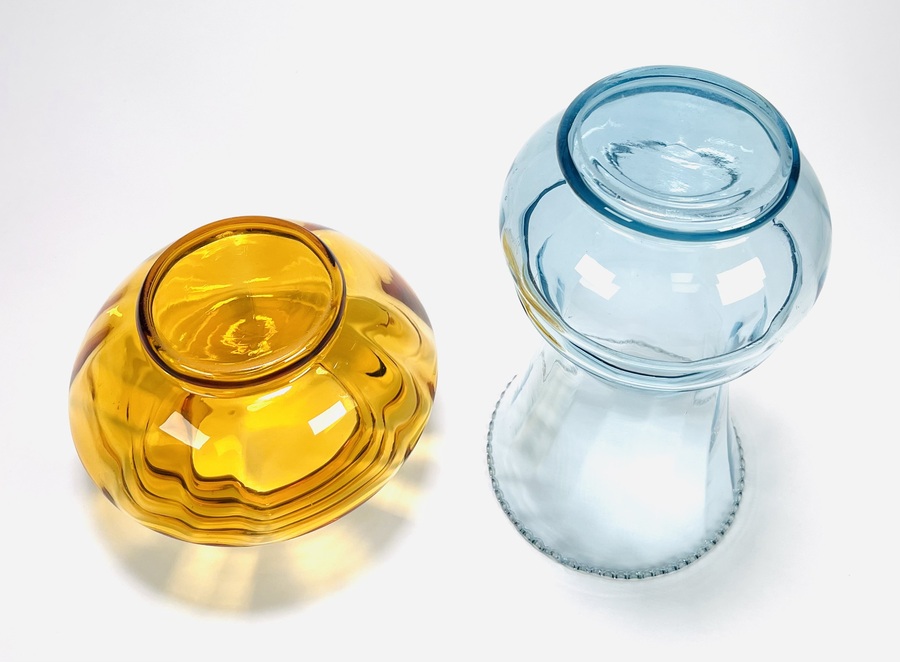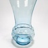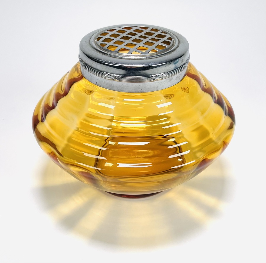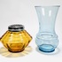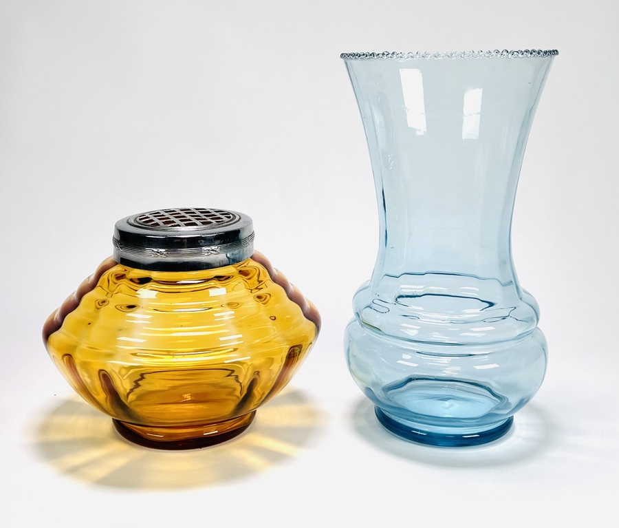 Persglazen Art Deco amberkleurige, groter formaat pique fleur met verchroomd rooster en een lichtblauwe Art Deco vaas met kartelrand. Beide vazen door Verreries Globeleterries Doyen, Florali serie. België, jaren 30. |