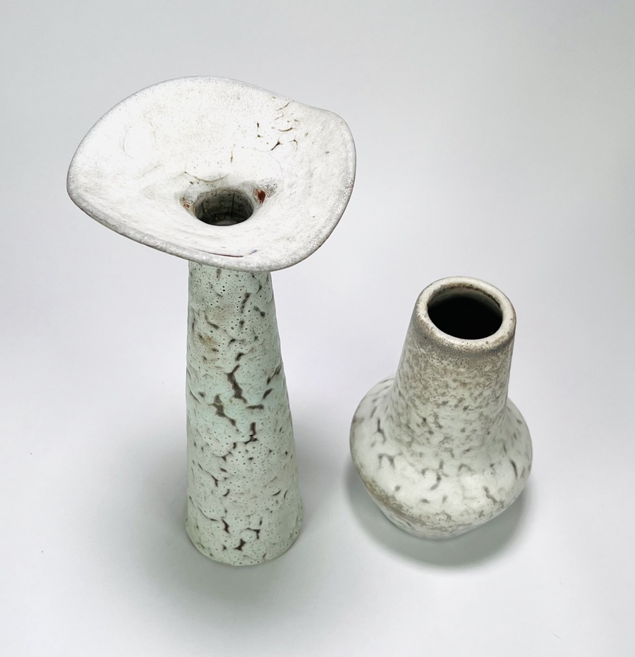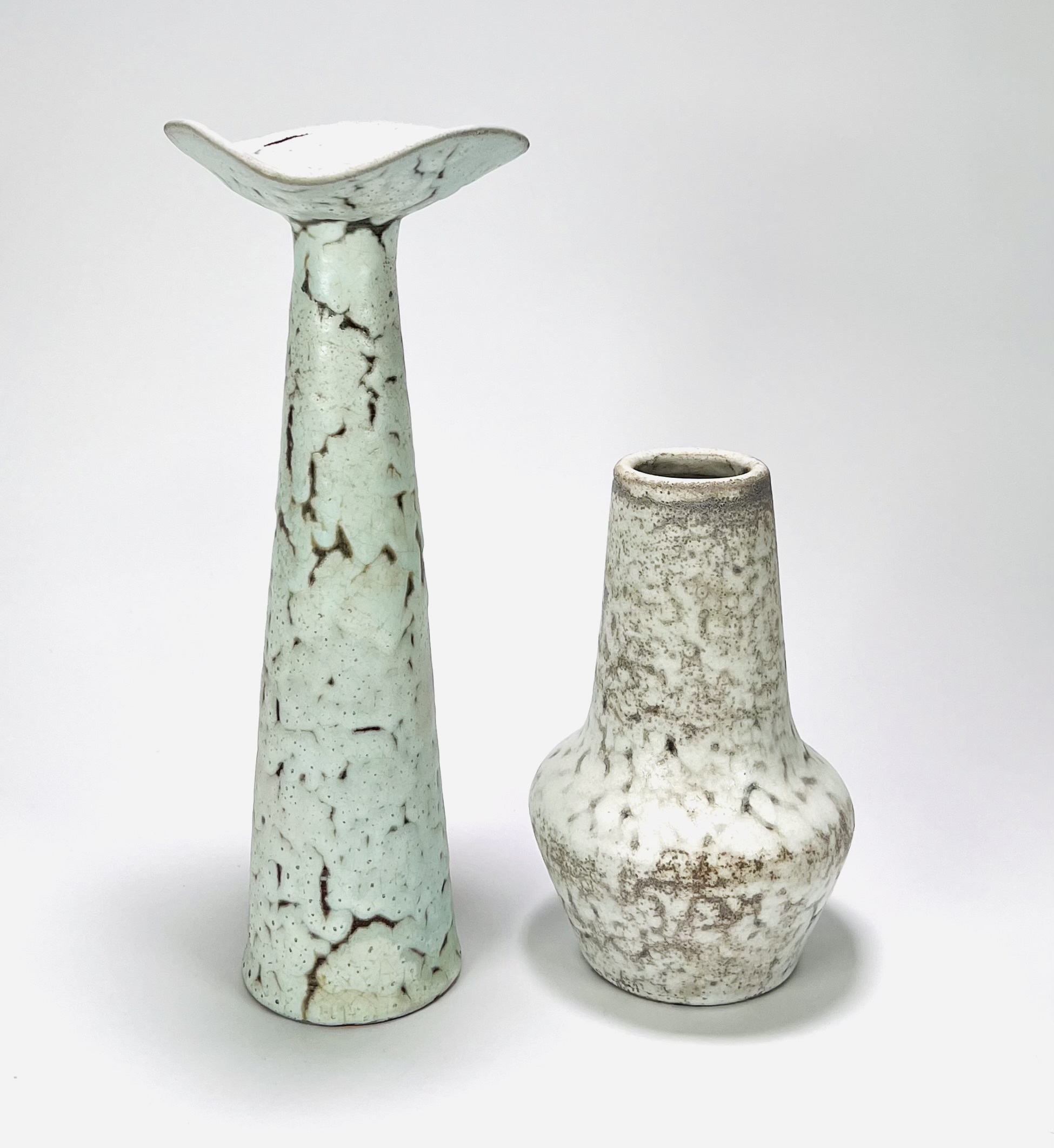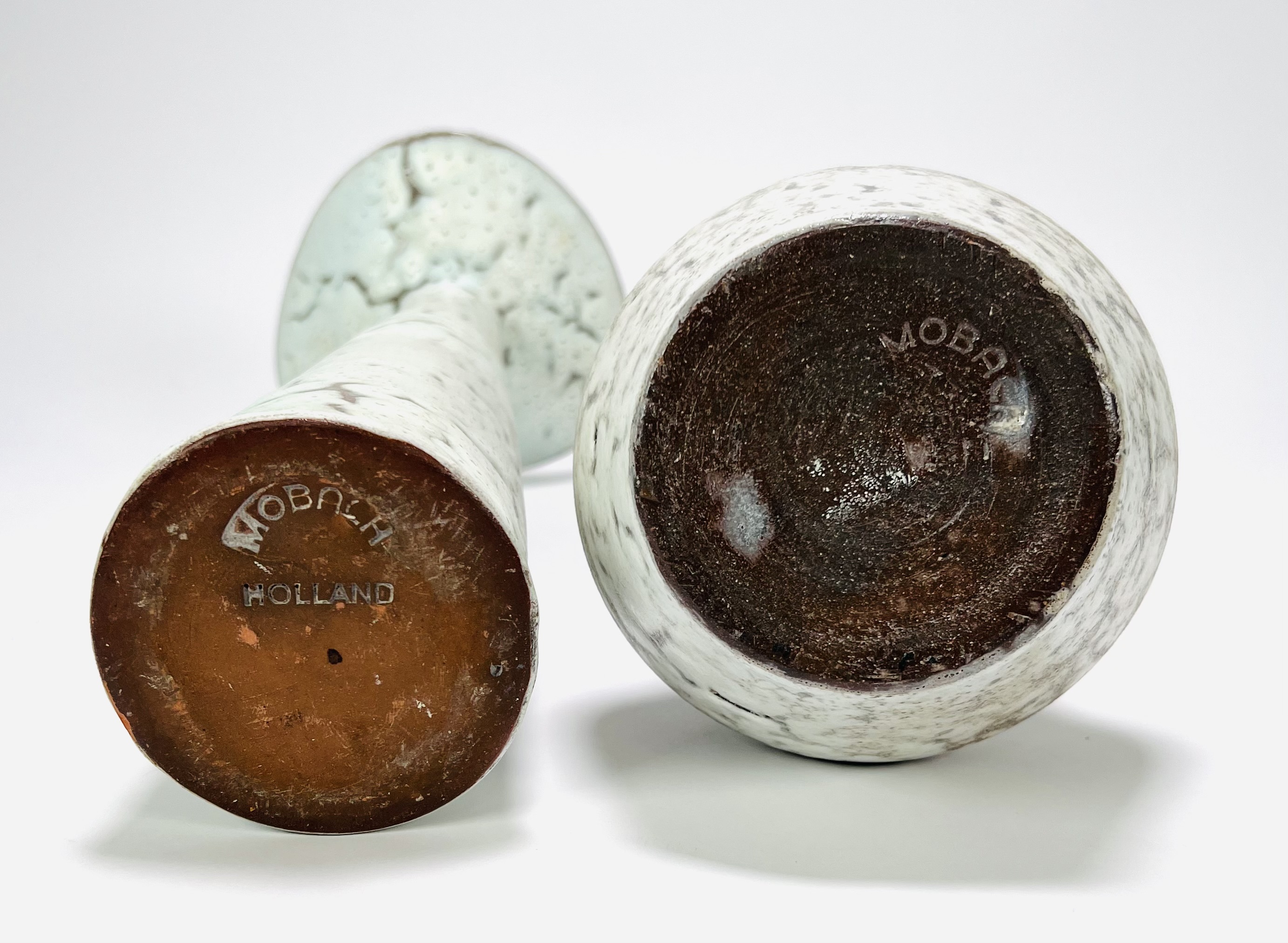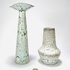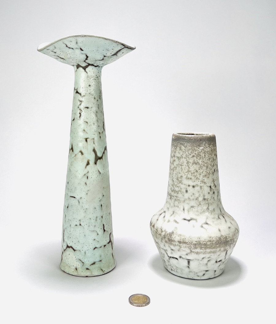 Twee keramieken vazen in beige en lichtgroenige kleurslag door Mobach, Utrecht. Aan de onderzijde gemerkt. Jaren 60/70. |