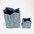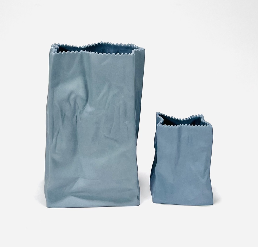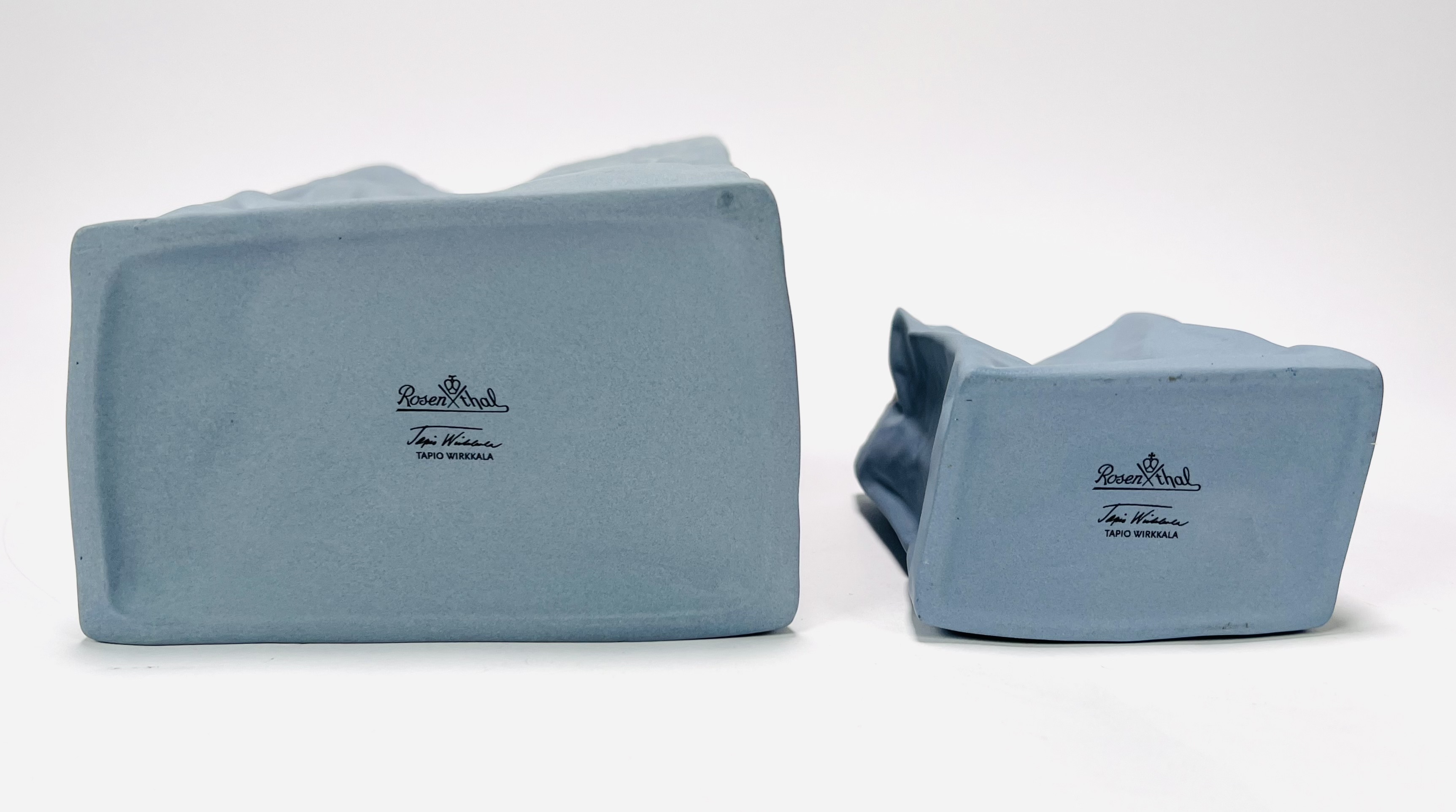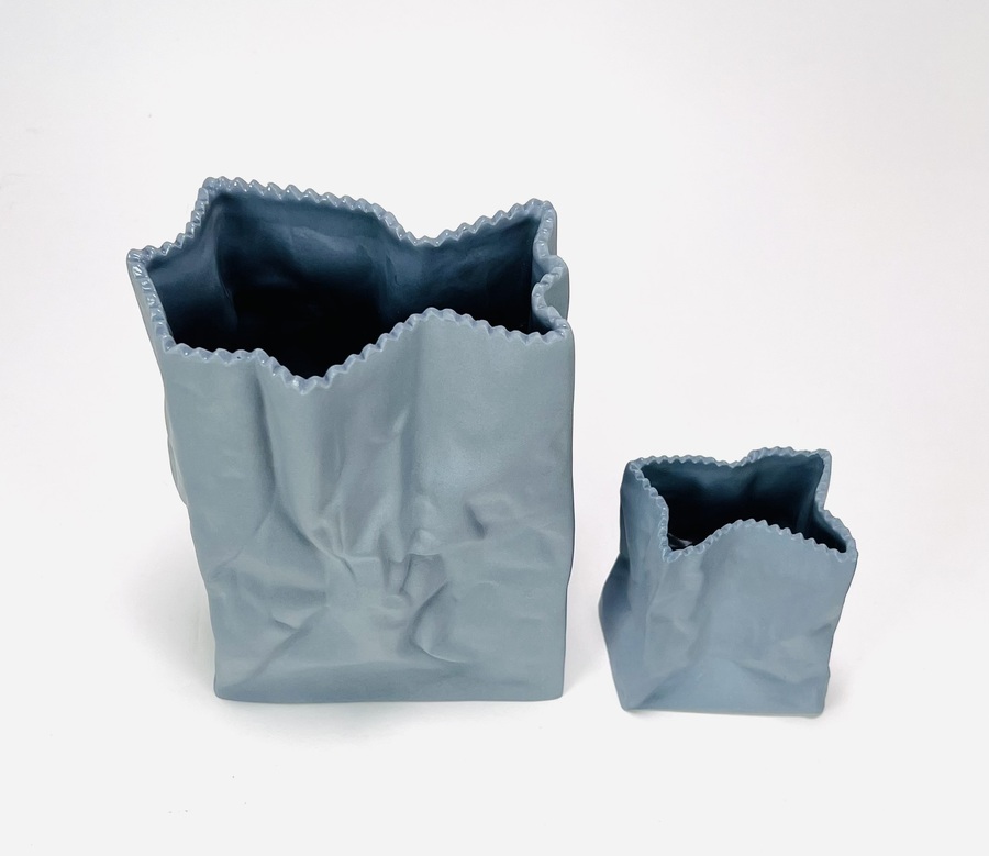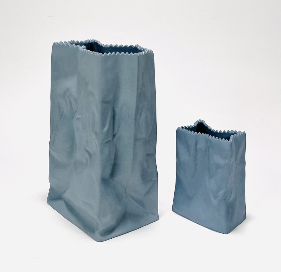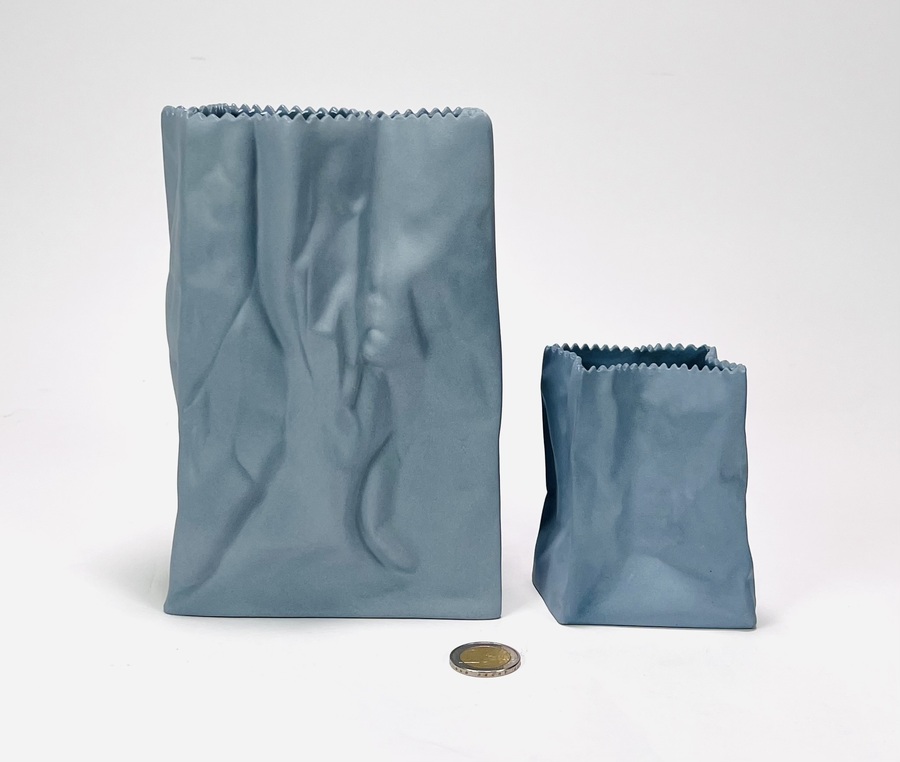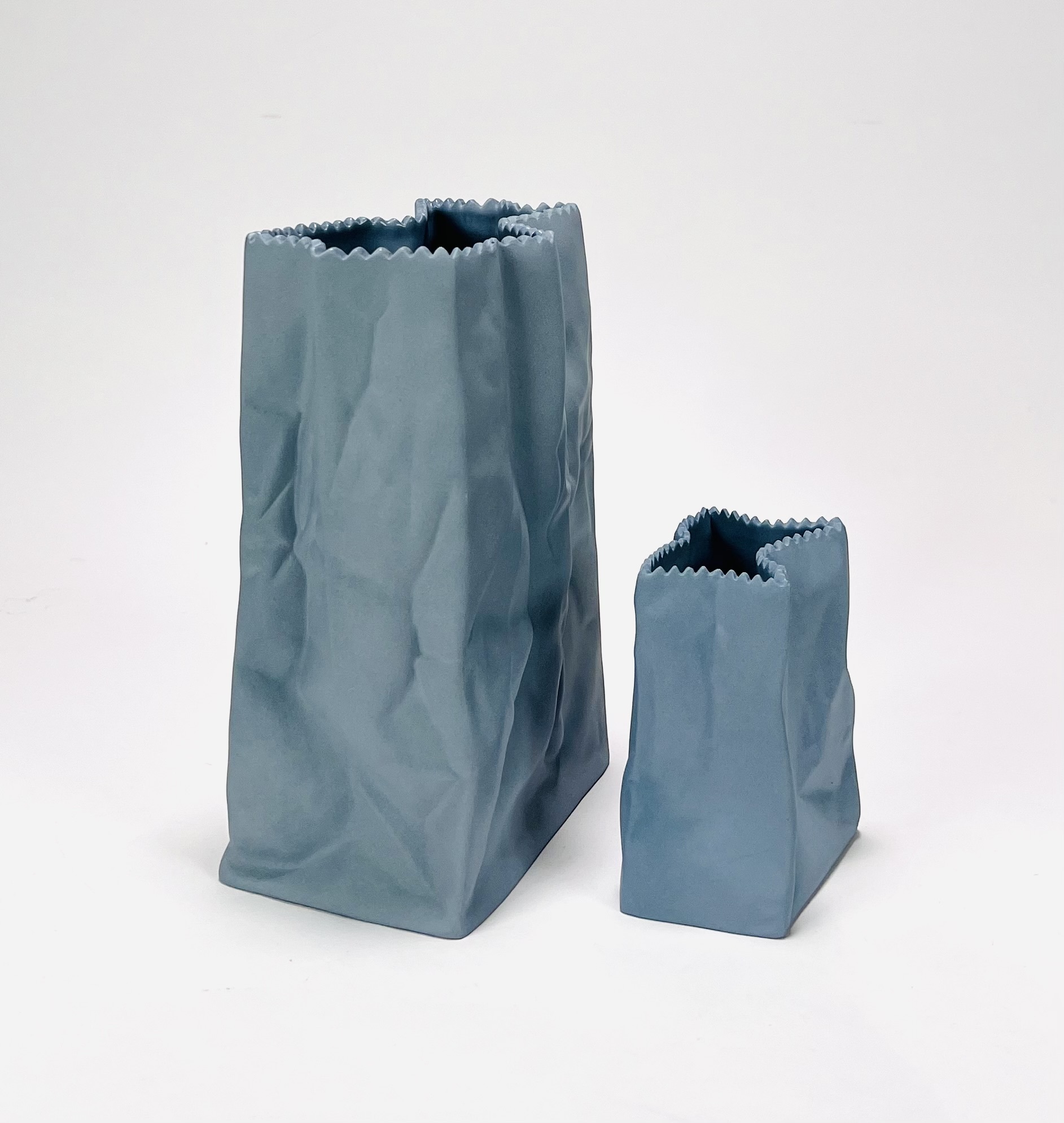 Twee grijsblauwe porseleinen "paper bag" vazen, ontwerp van Tapio Wirkkala en uitgevoerd door Rosenthal Duitsland. Oorspronkelijk ontwerp stamt uit 1977, 21e eeuw. |