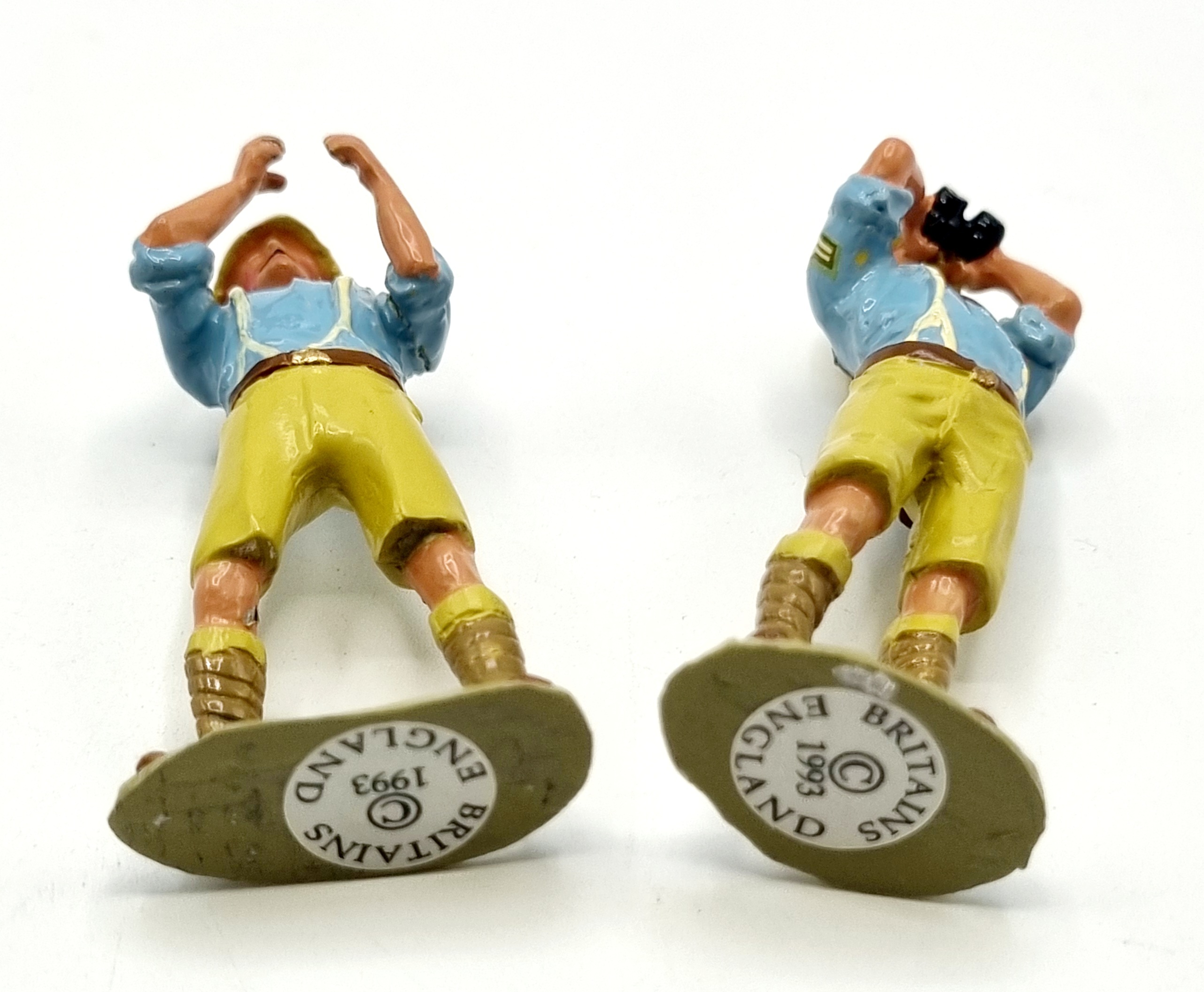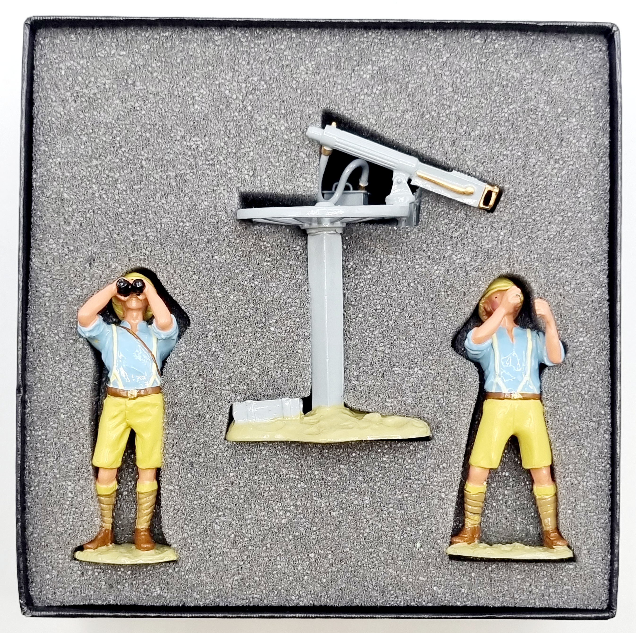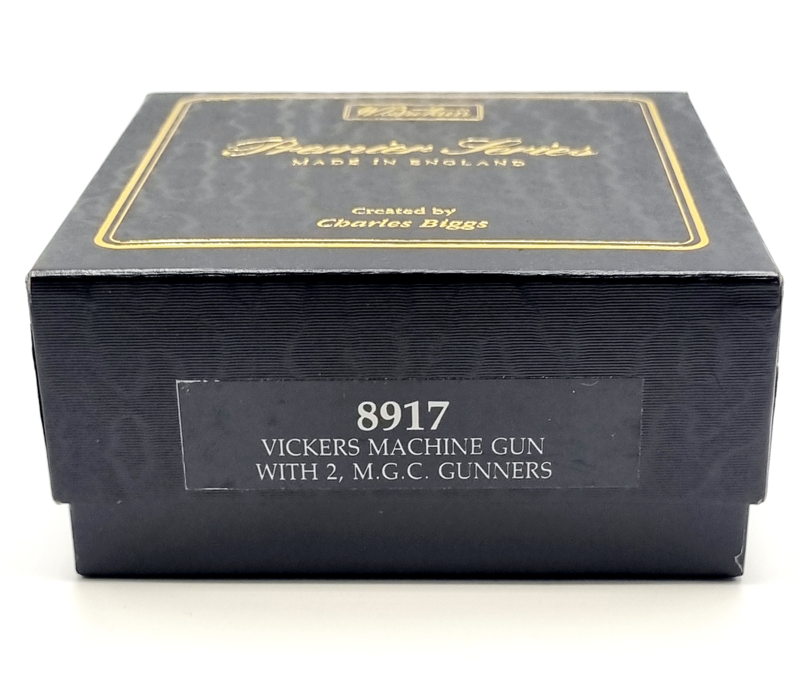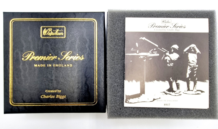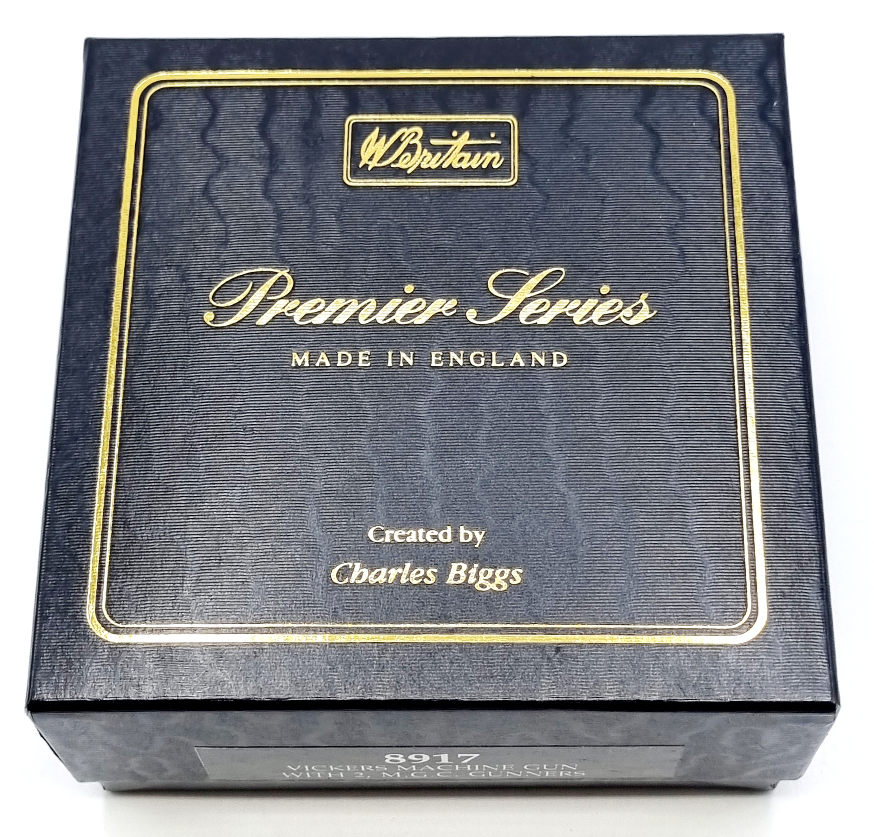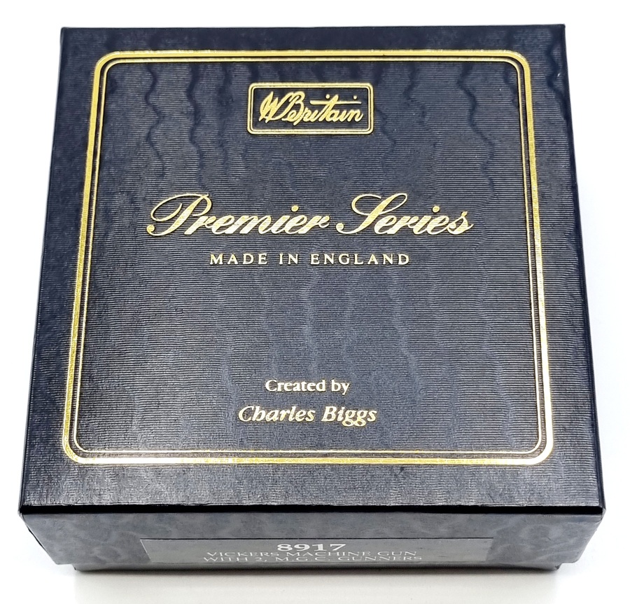 Uit de W. Britains Premier Series ontworpen door Charles Biggs, kartonnen doos met twee handbeschilderde tinnensoldaten met machinegeweer. Catalogusnummer 8917 uit 1995. |