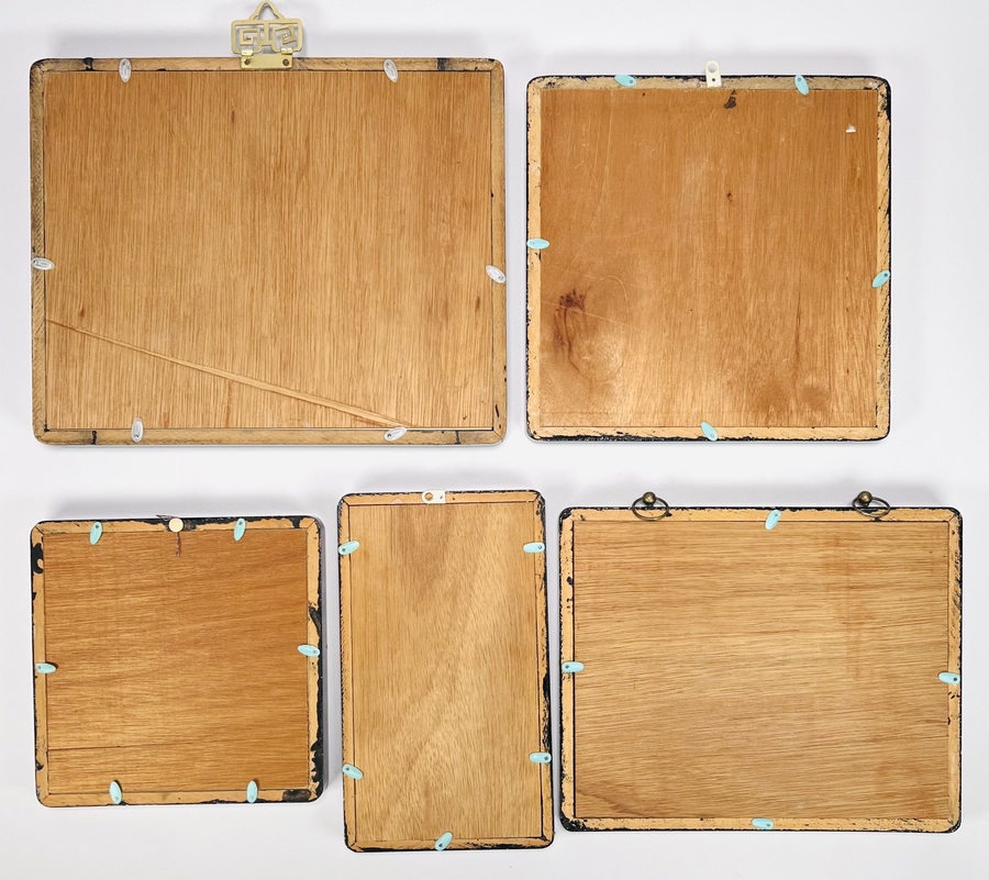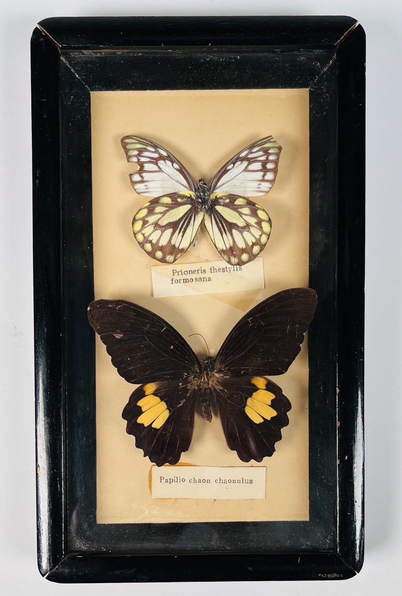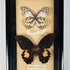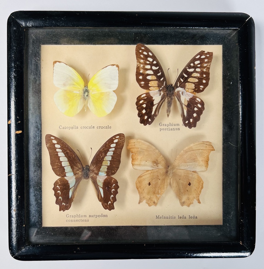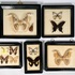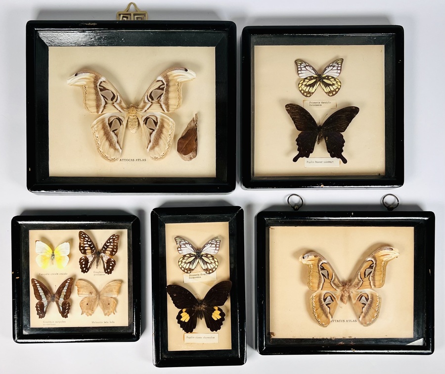 Tien ingelijste vlinders in vijf zwarte lijsten voorzien van glas. Met onder meer de Attocas Atlas met pop en de Catopsilia crocale. 21e eeuw. |