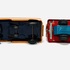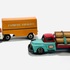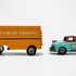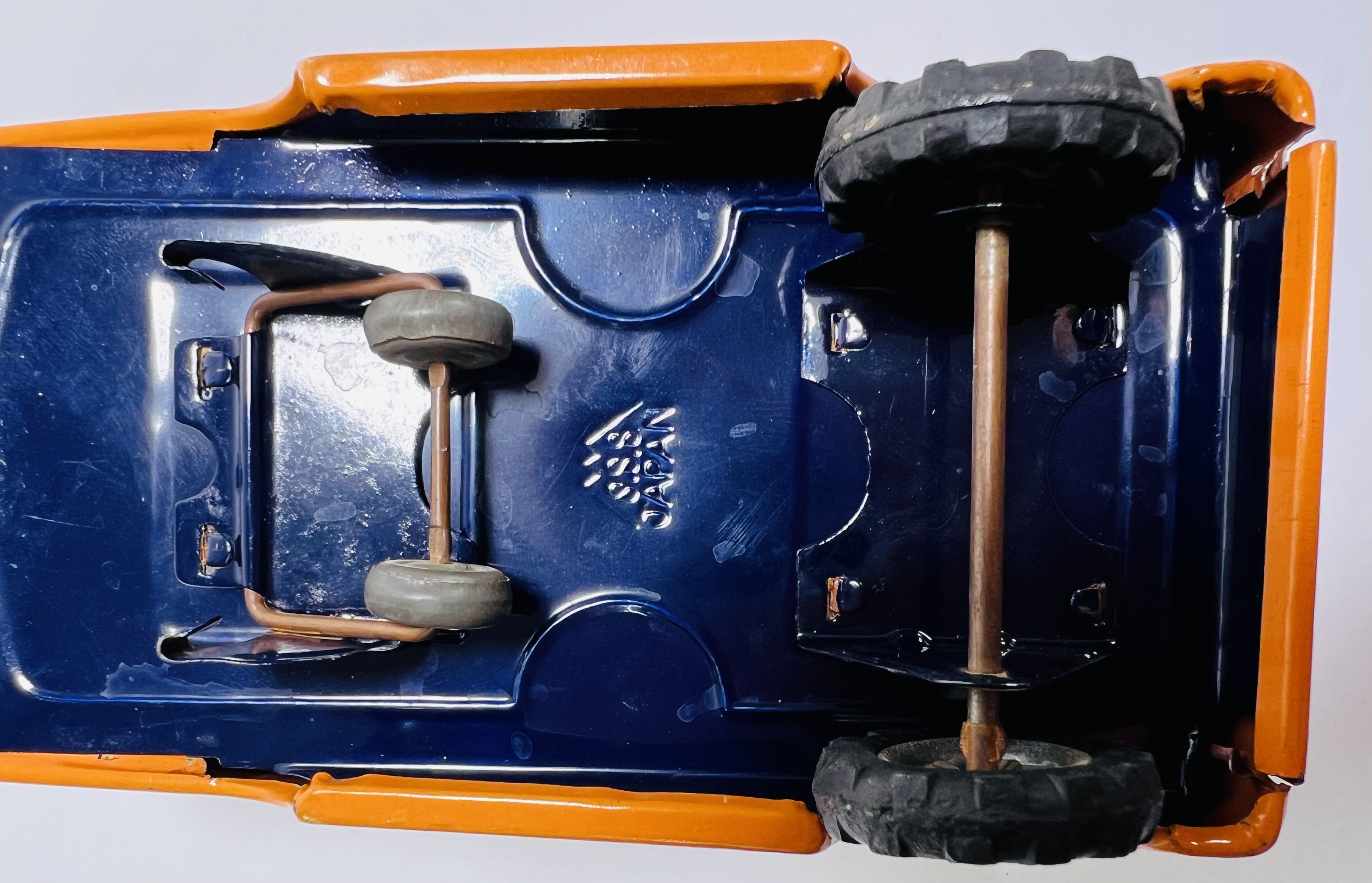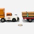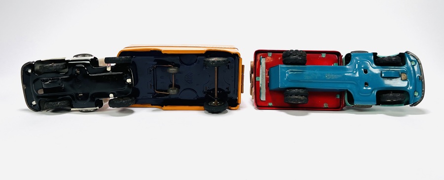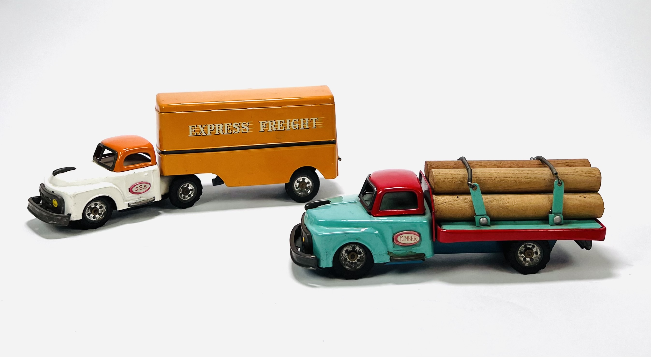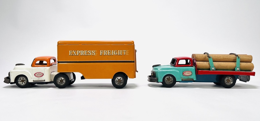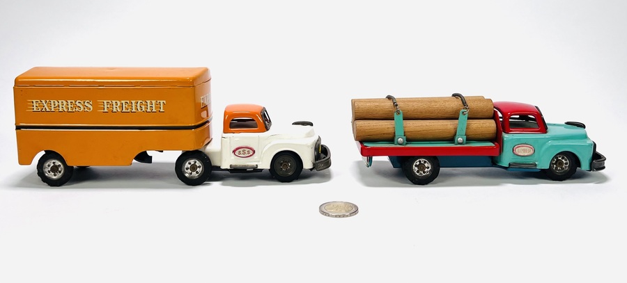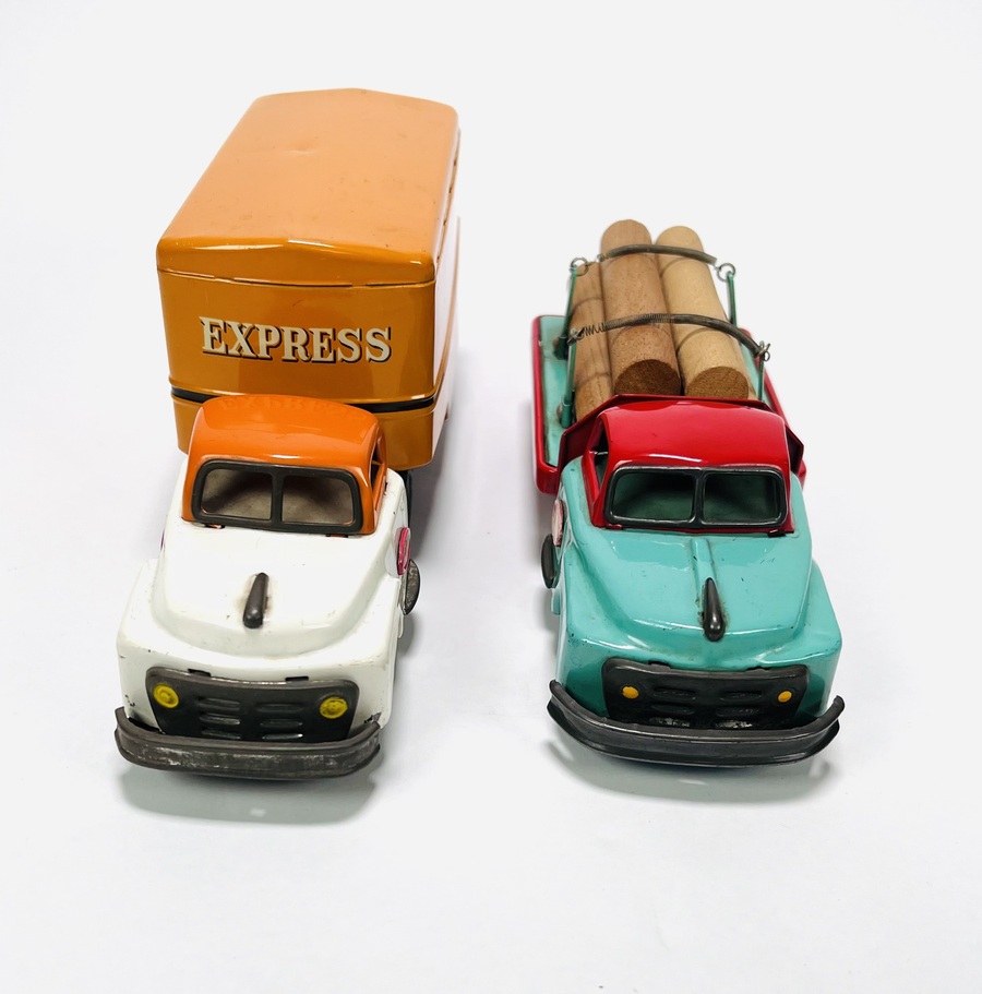 Twee blikken vrachtauto’s waarvan de grotere vrachtauto gemerkt is S.S.S Japan, vrachtauto met houten staven gemerkt Lumber. Japan, jaren 50/60. |