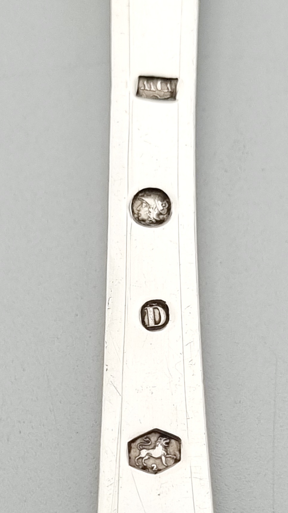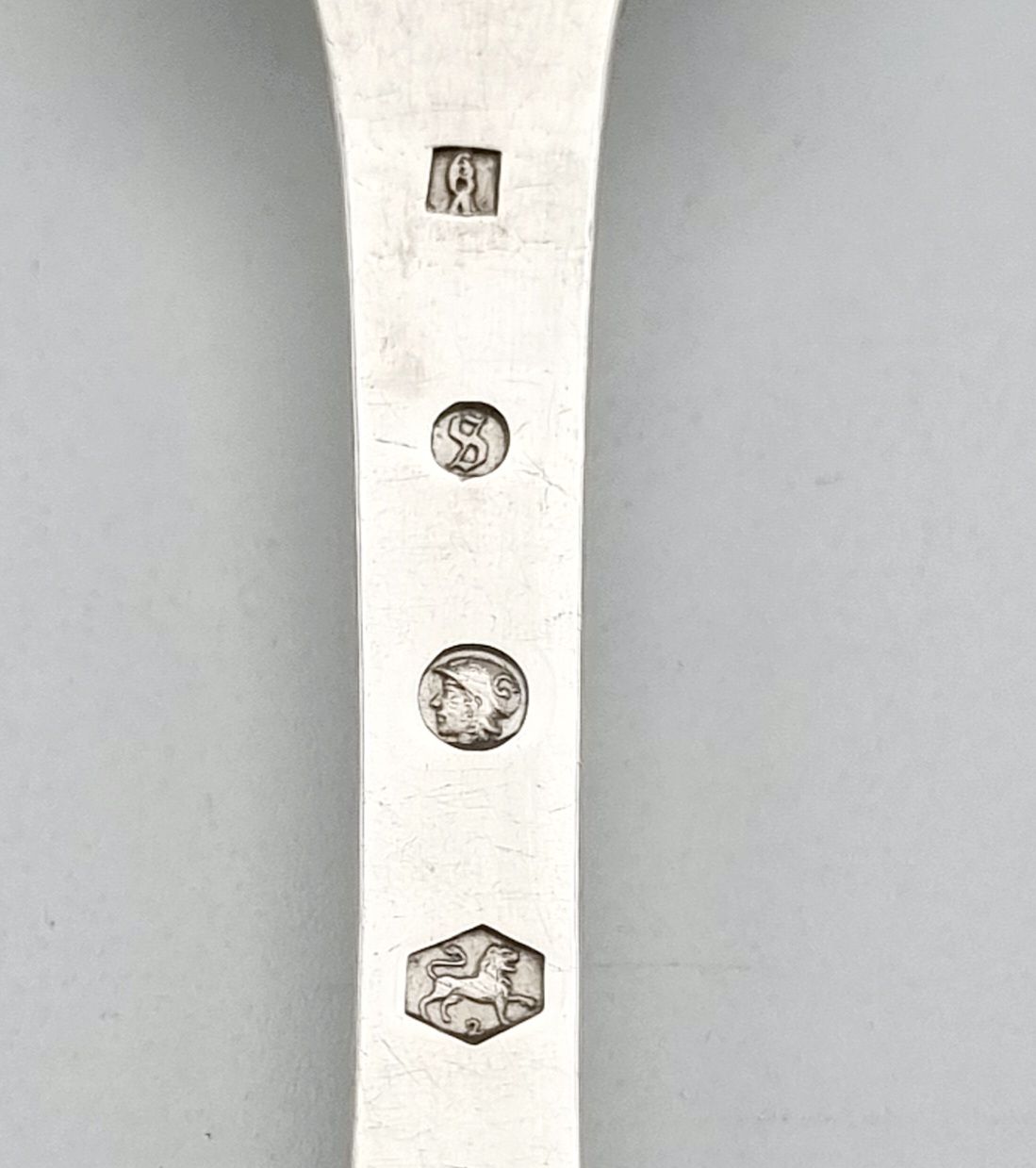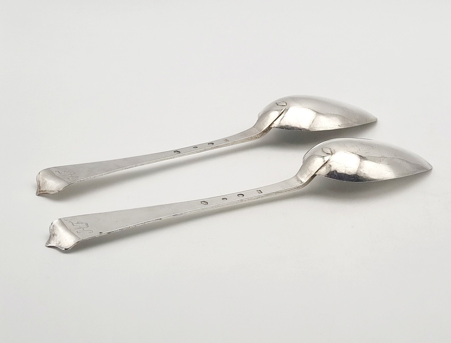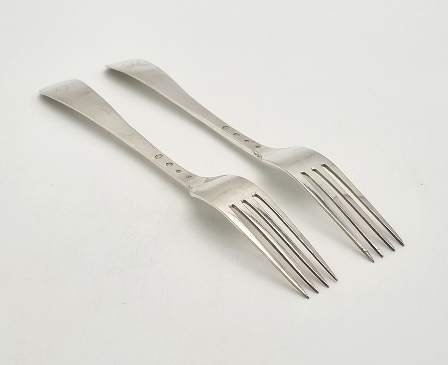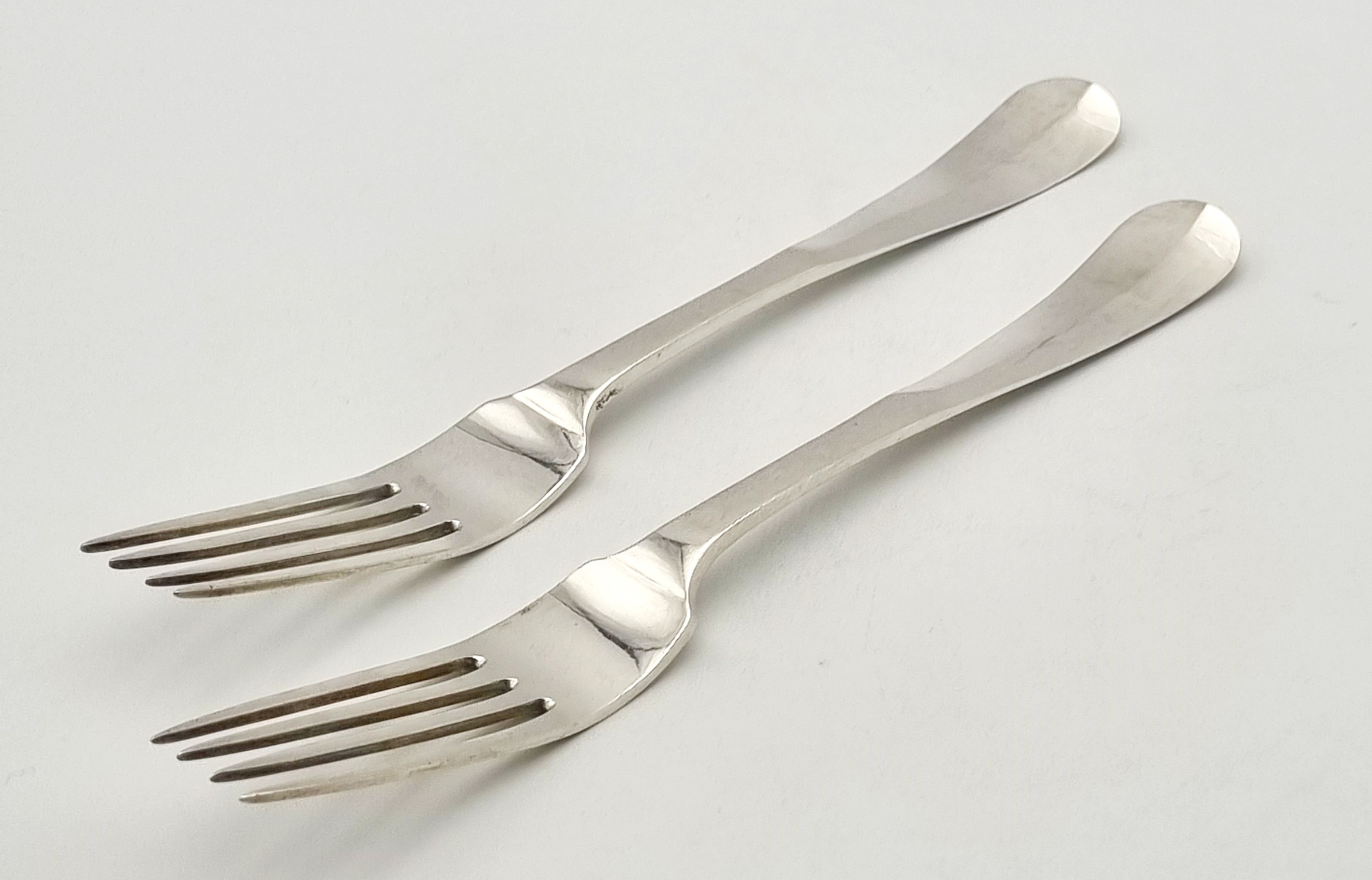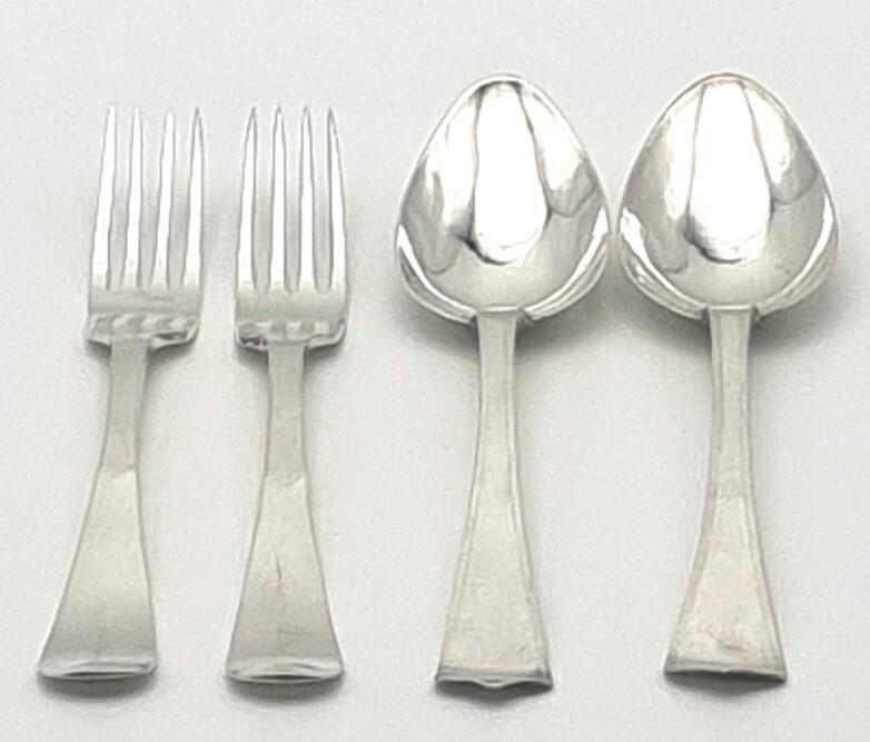 Twee zilveren eetlepels, gekeurd met meesterteken M, halve maan A, lopende leeuw 2, minervakop met een E (Groningen) en jaarletter D (1838). Twee zilveren vorken gekeurd met meesterteken, lopende leeuw 2, minervakop met een G (Zwolle )en jaarletter S (1877). |
