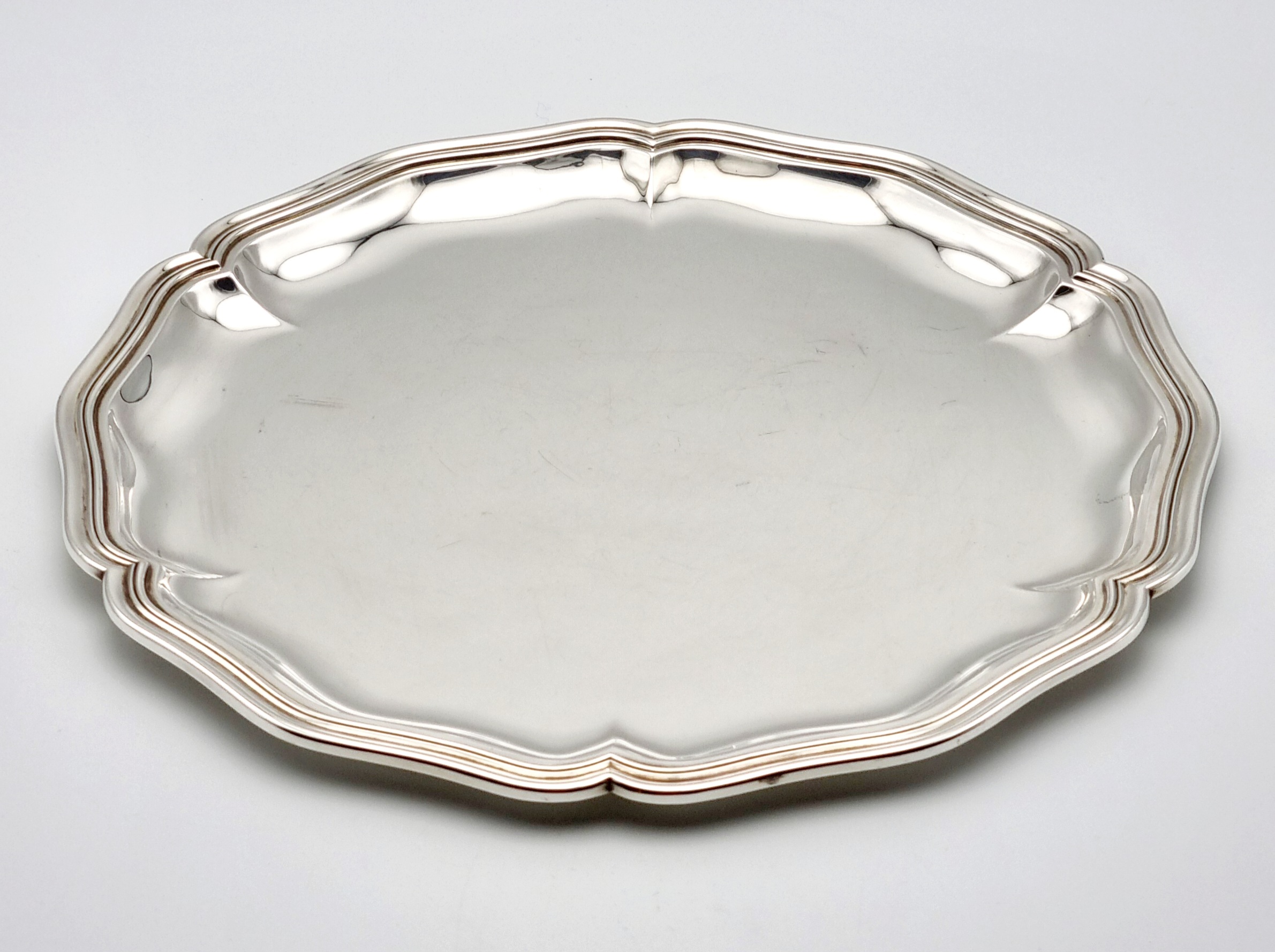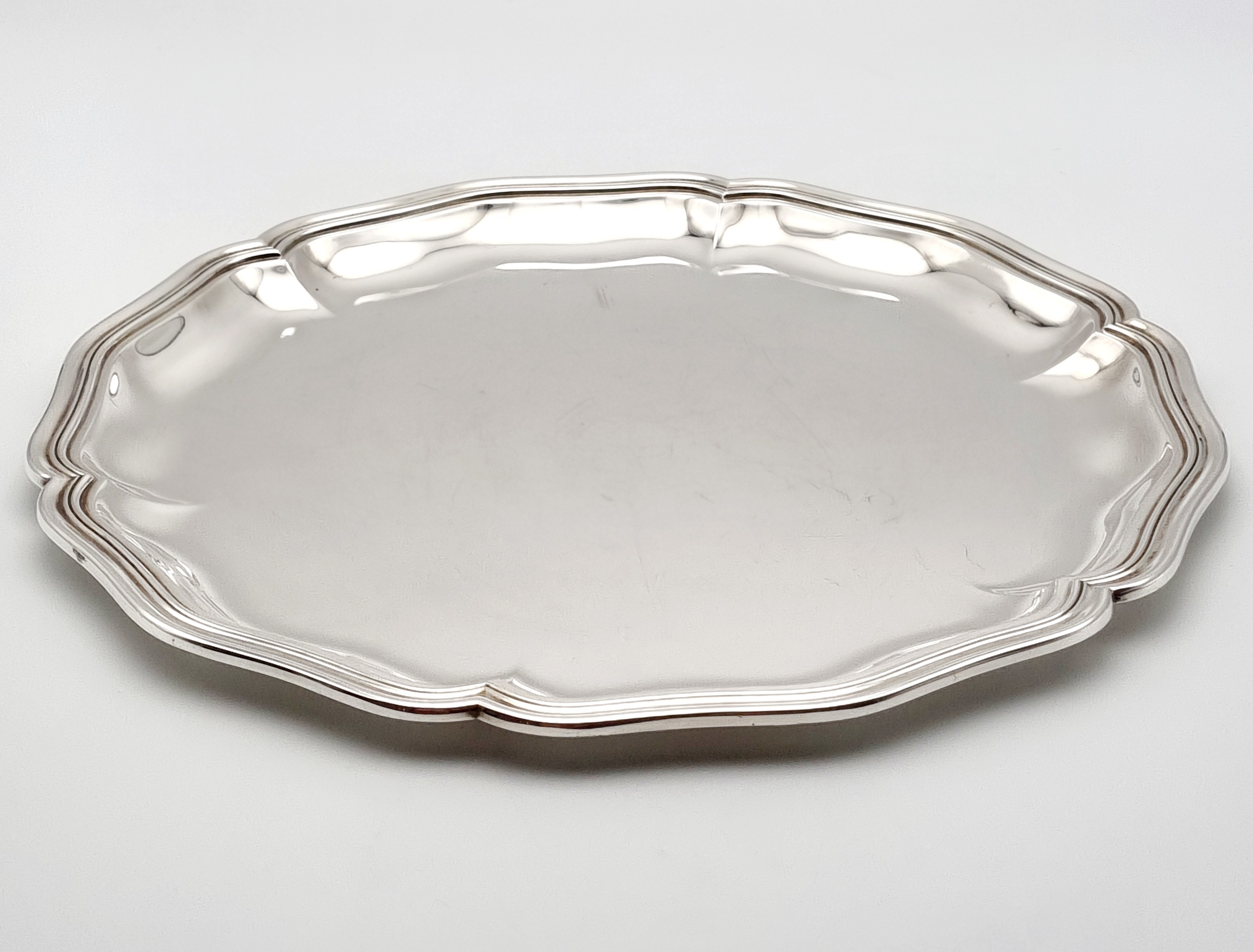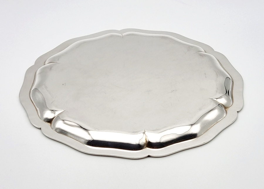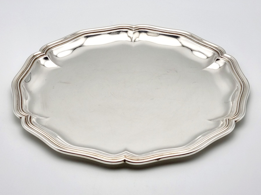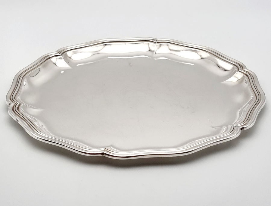 Zilveren dienblad met gecontourneerde rand. Gekeurd met meesterteken Jezler, 800 zilvergehalte en modelnummer 33-35. Schaffhausen (Duitsland), vierde kwart 20e eeuw. |