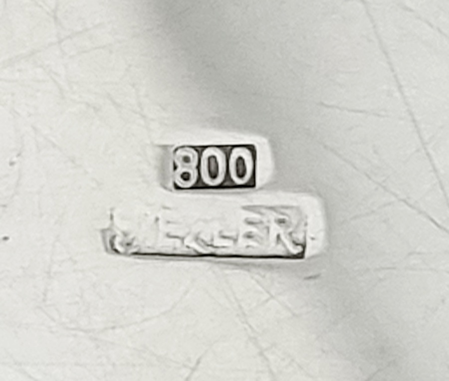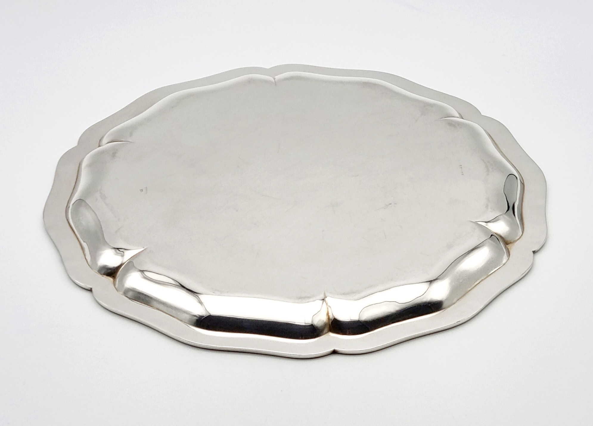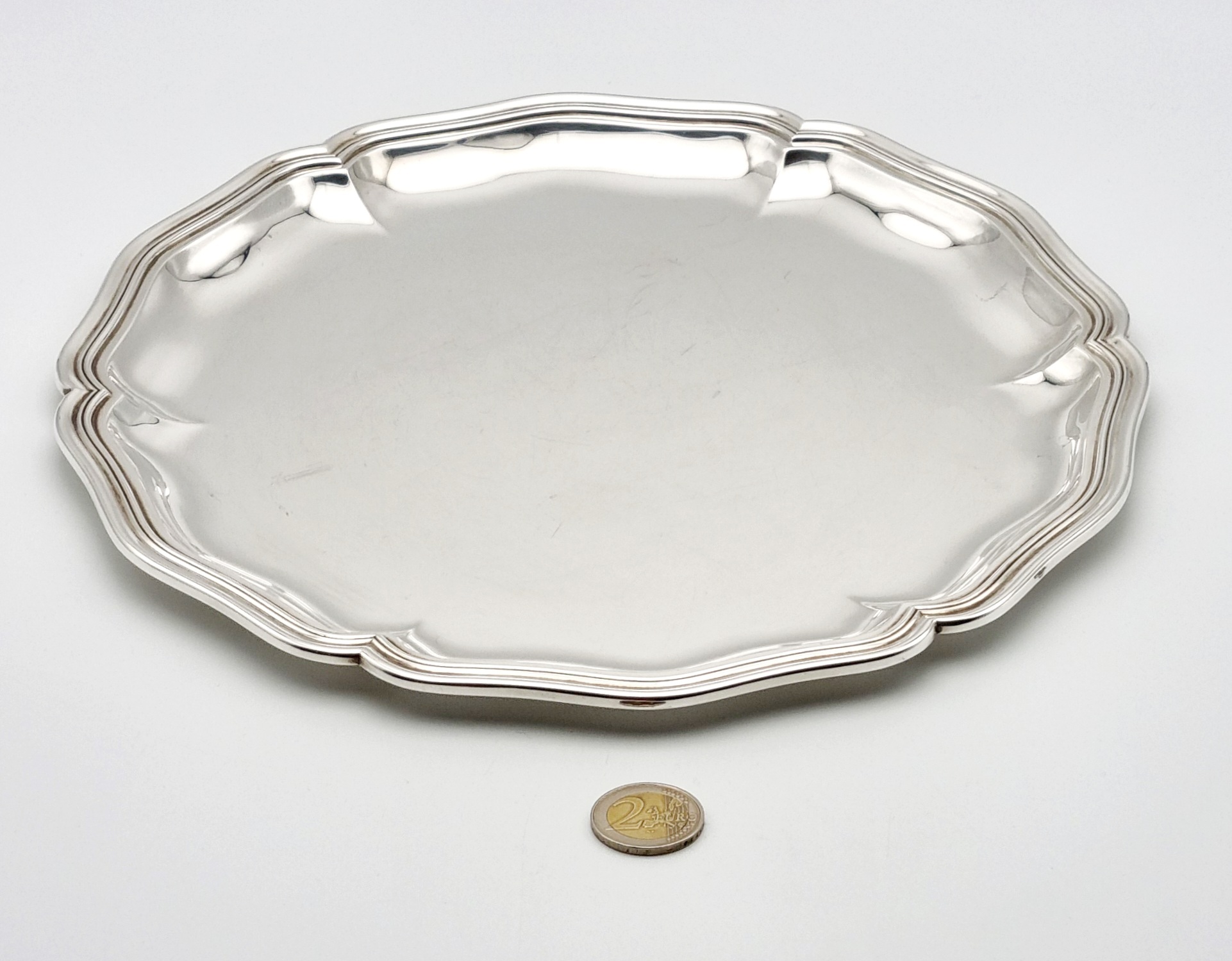 Zilveren dienblad met gecontourneerde rand. Gekeurd met meesterteken Jezler, 800 zilvergehalte en modelnummer 33-35. Schaffhausen (Duitsland), vierde kwart 20e eeuw. |