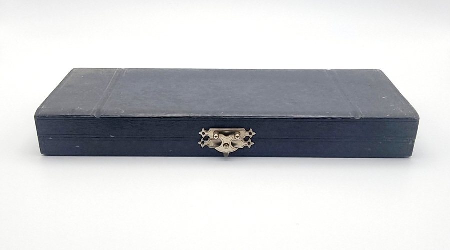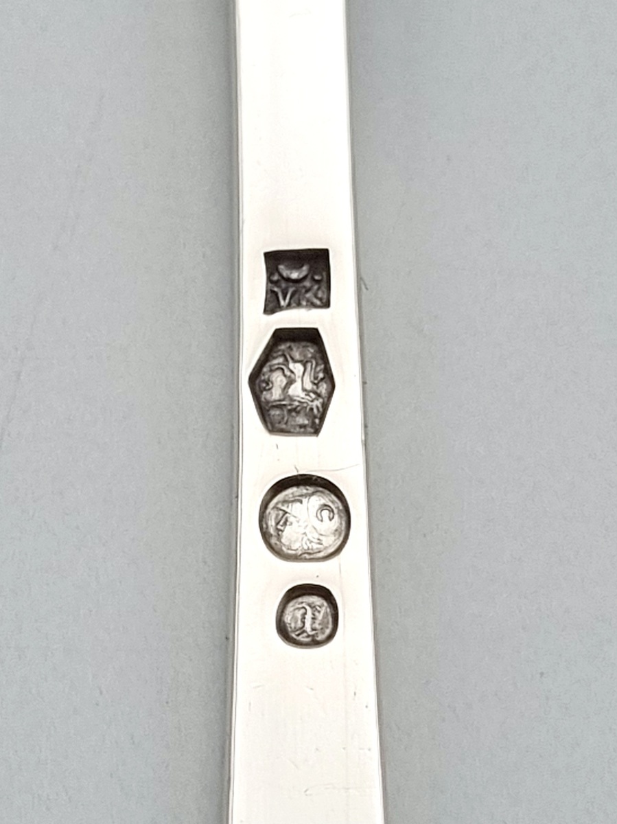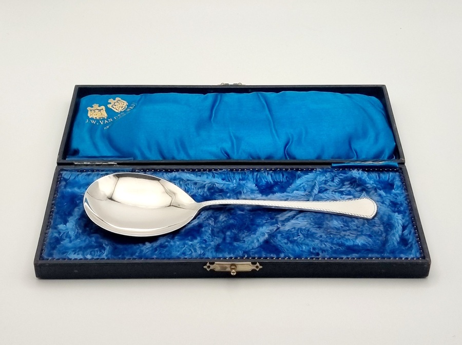 Zilveren lepel door Van Kempen, Voorschoten met bijbehorend etui. Gekeurd met meesterteken VK en halve maan, lopende leeuw 2, minervakop met een C (Den Haag) en jaarletter R (1876). |