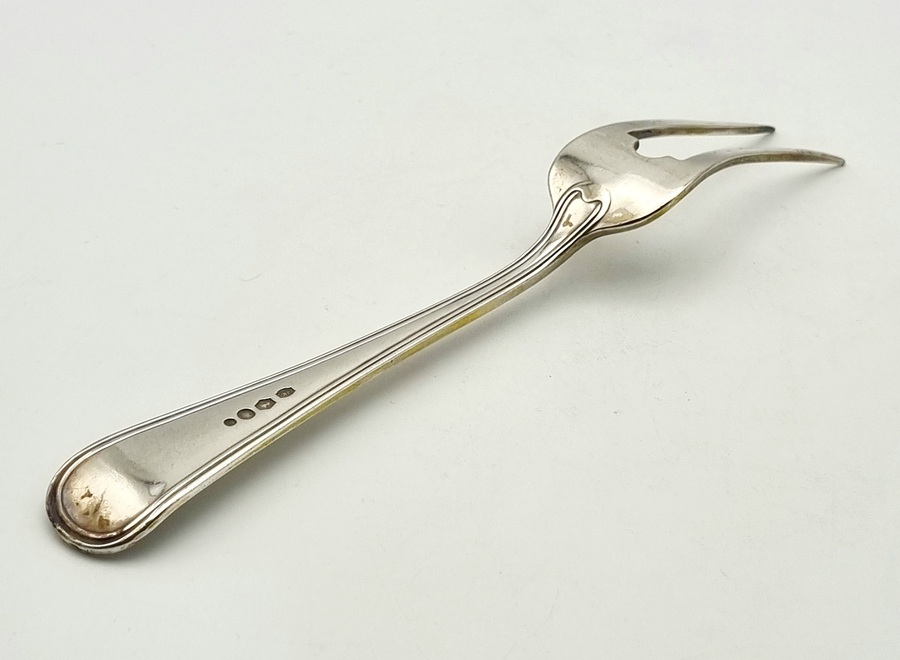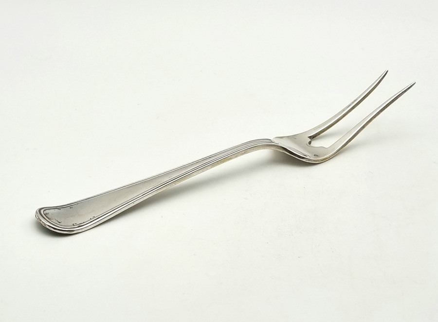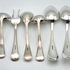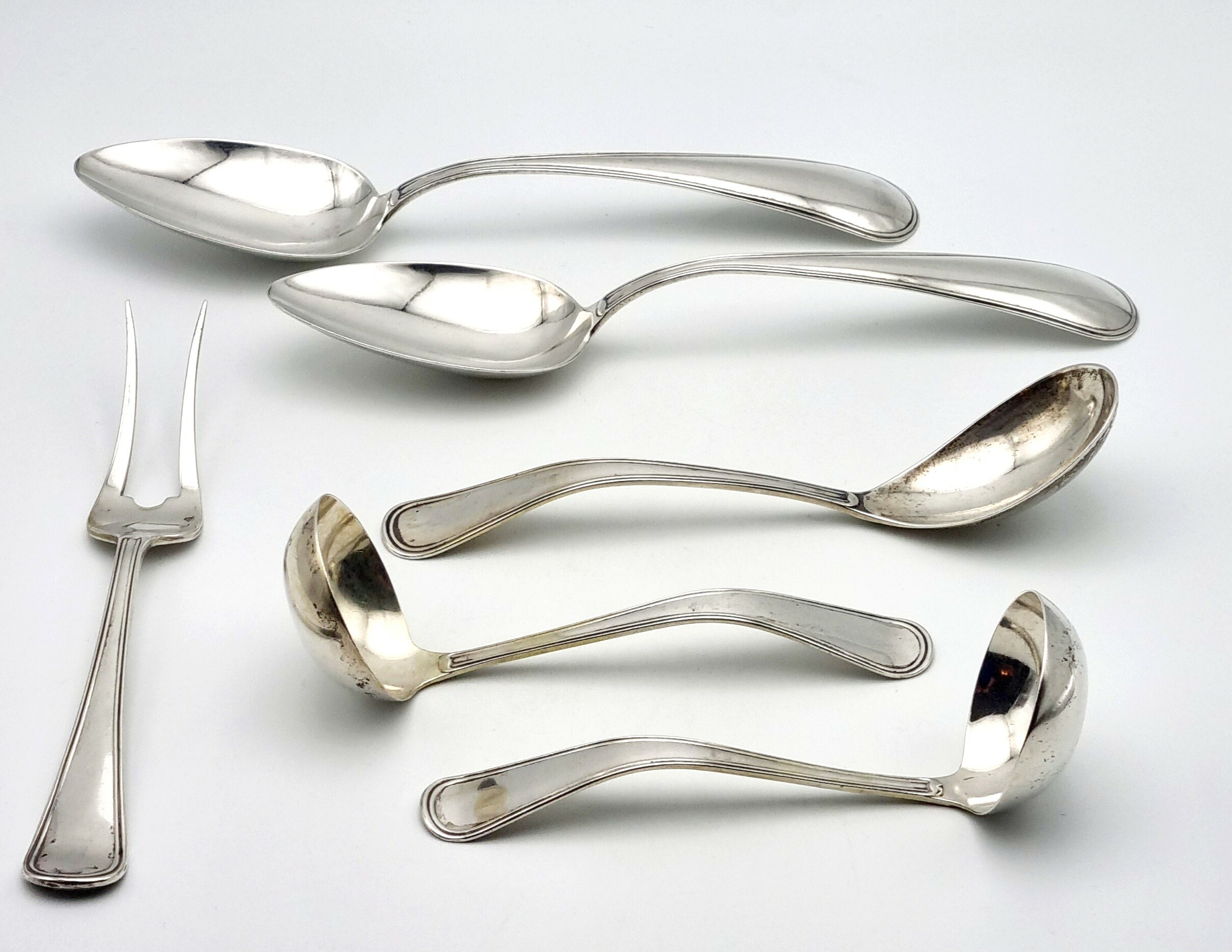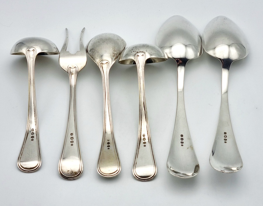 Vijf zilveren opscheplepels en vleesvork door zilverfabriek Van Kempen. Gekeurd met meesterteken VK (Van Kempen), lopende leeuw 2, minervakop met een B (Utrecht) en diverse jaarletters. |