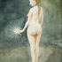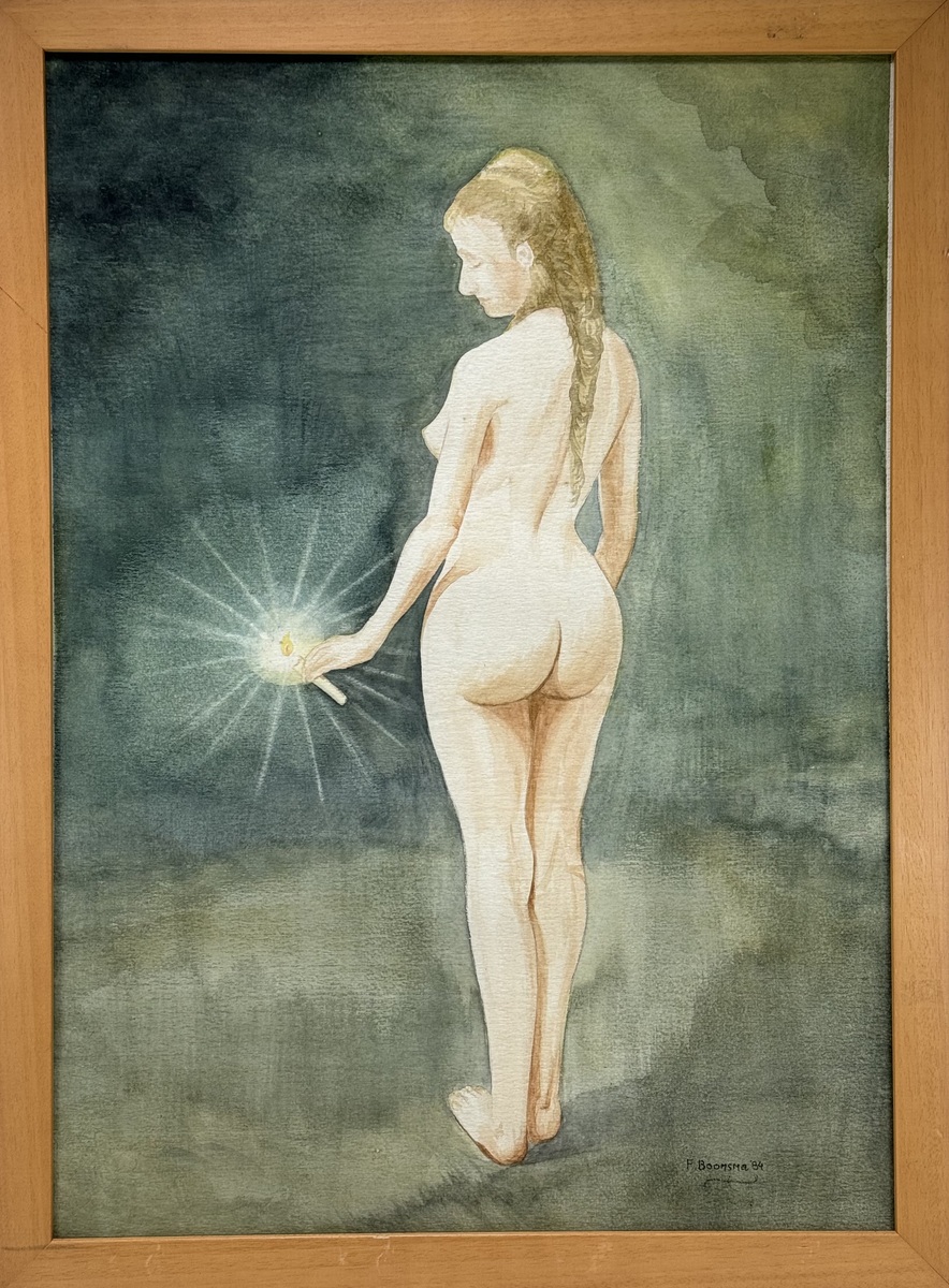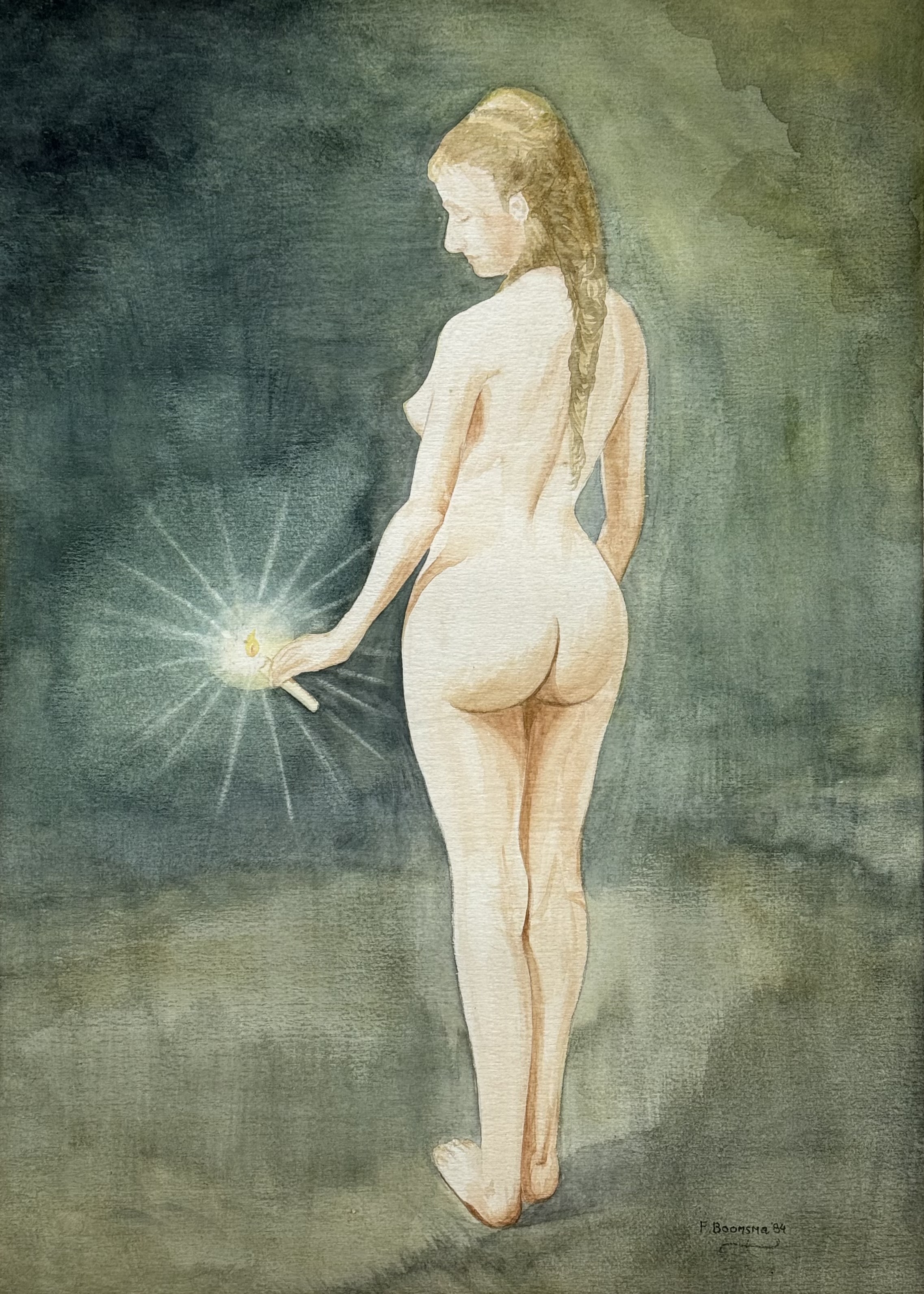 Aquarel van vrouwelijk naakt met kaarslicht door Frans Boomsma (1956). Rechtsonder gesigneerd en gedateerd 1984. |