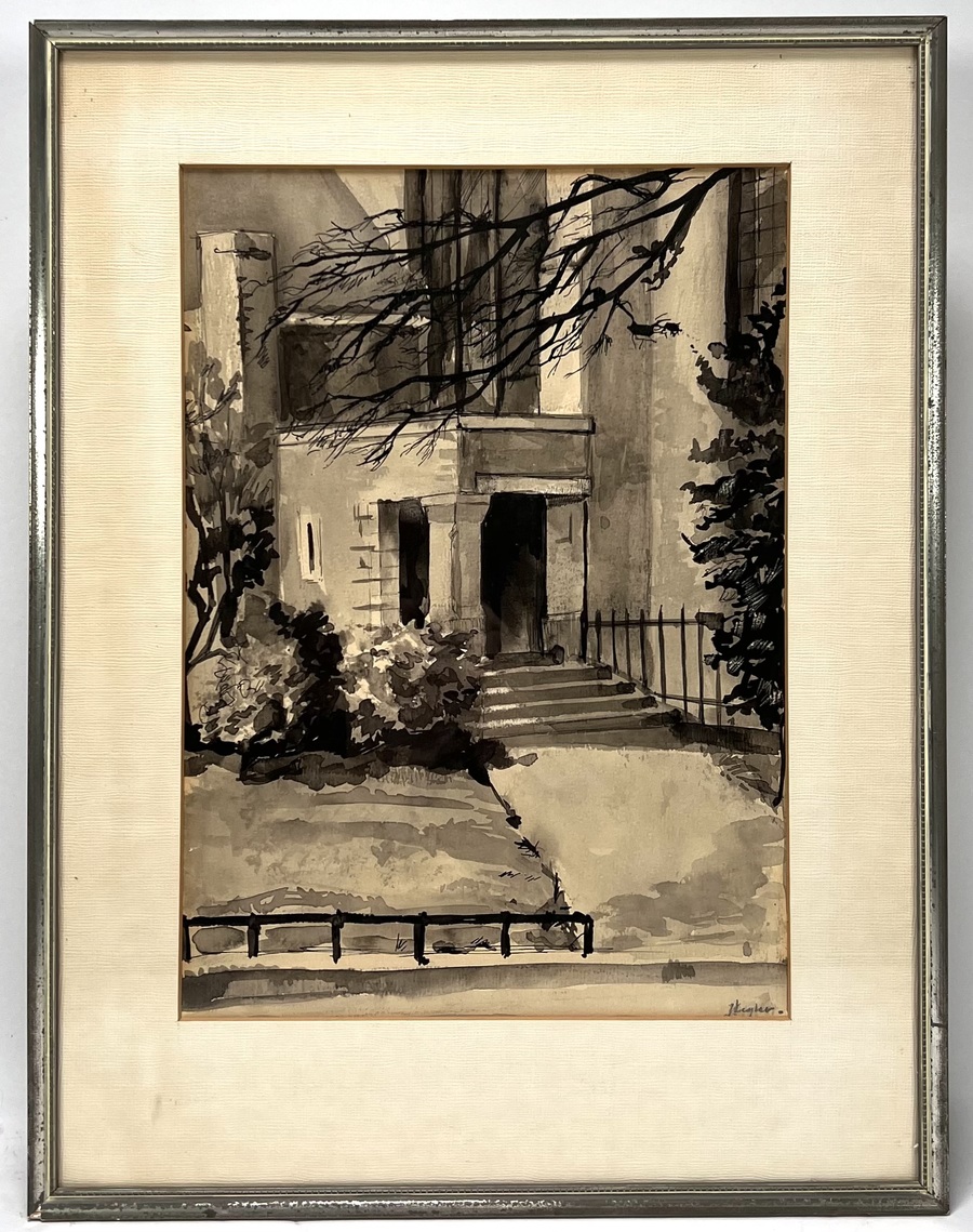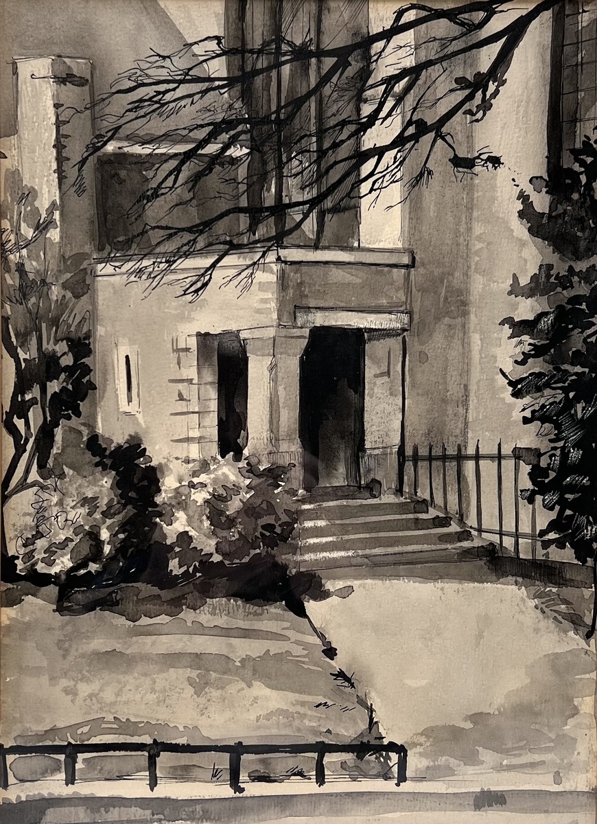 Inkttekening “Ingang van de Nederlands Hervormde Kerk te Rijswijk” door Jaap Vegter. Rechtsonder gesigneerd en te dateren omstreeks 1959. |