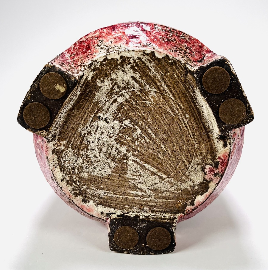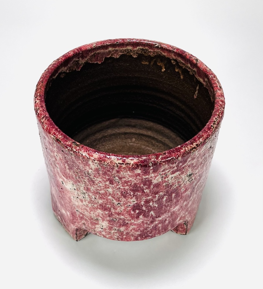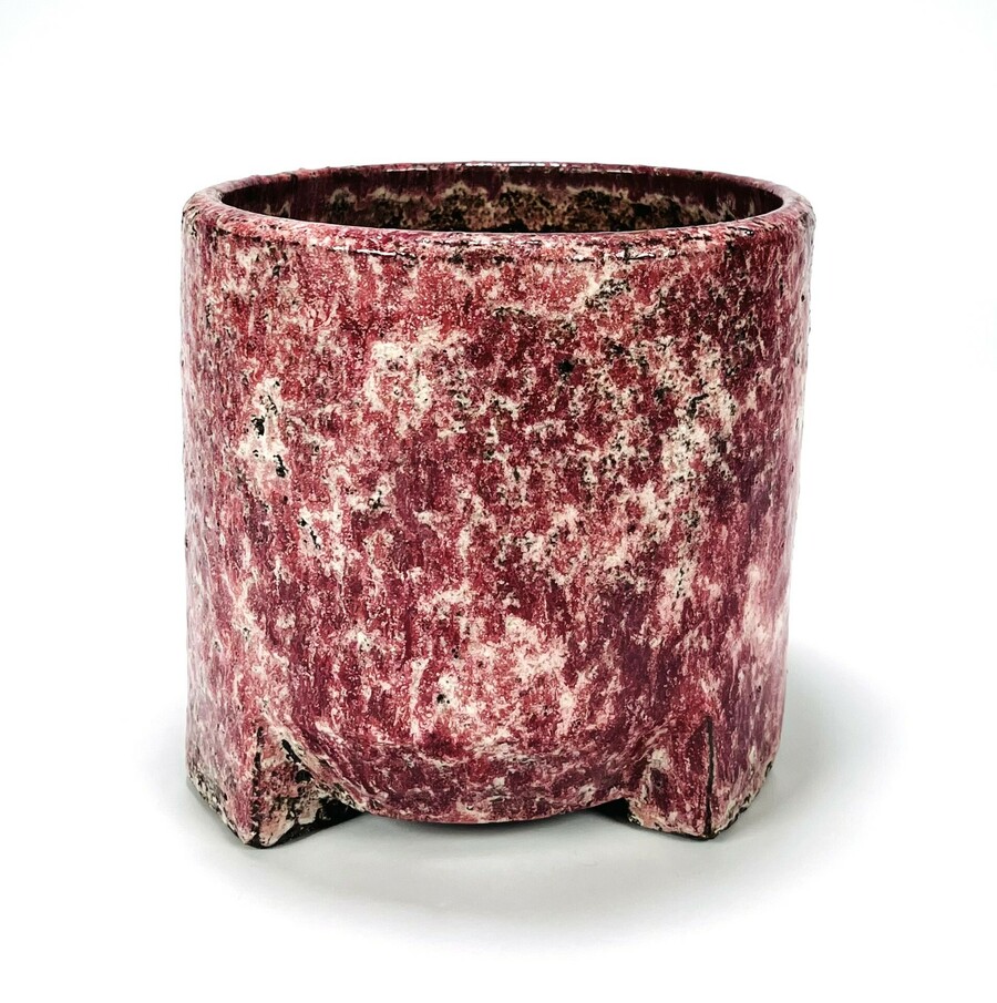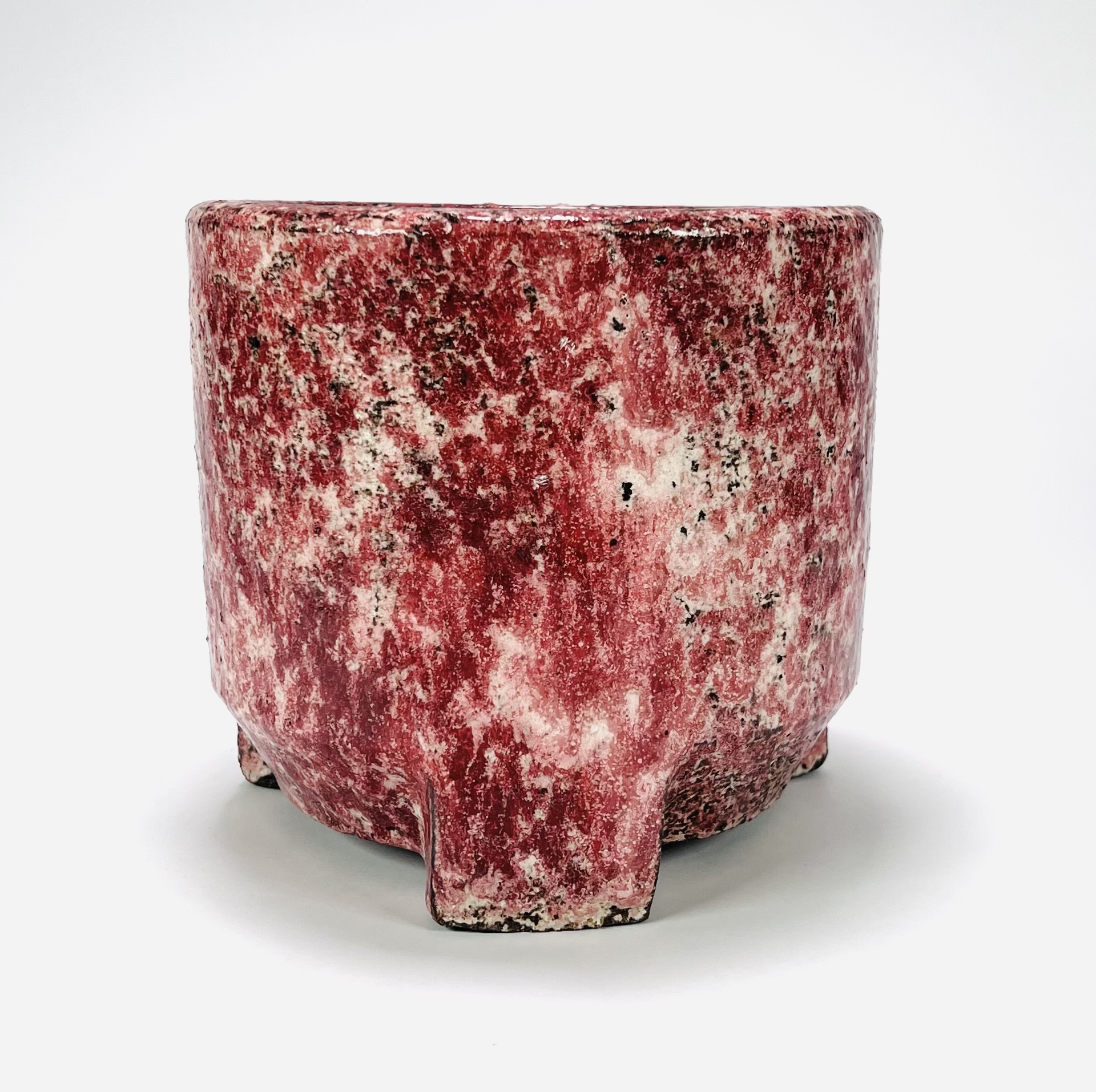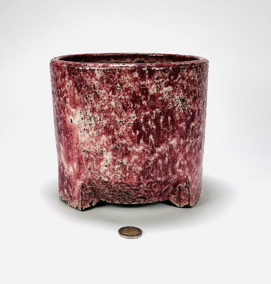 Rood-roze aardewerken cache-pot met Art Deco stijl nokken onderzijde, door Potterij Zaalberg. Aan de gemerkt Zaalberg en Holland. Midden 20e eeuw. |