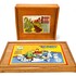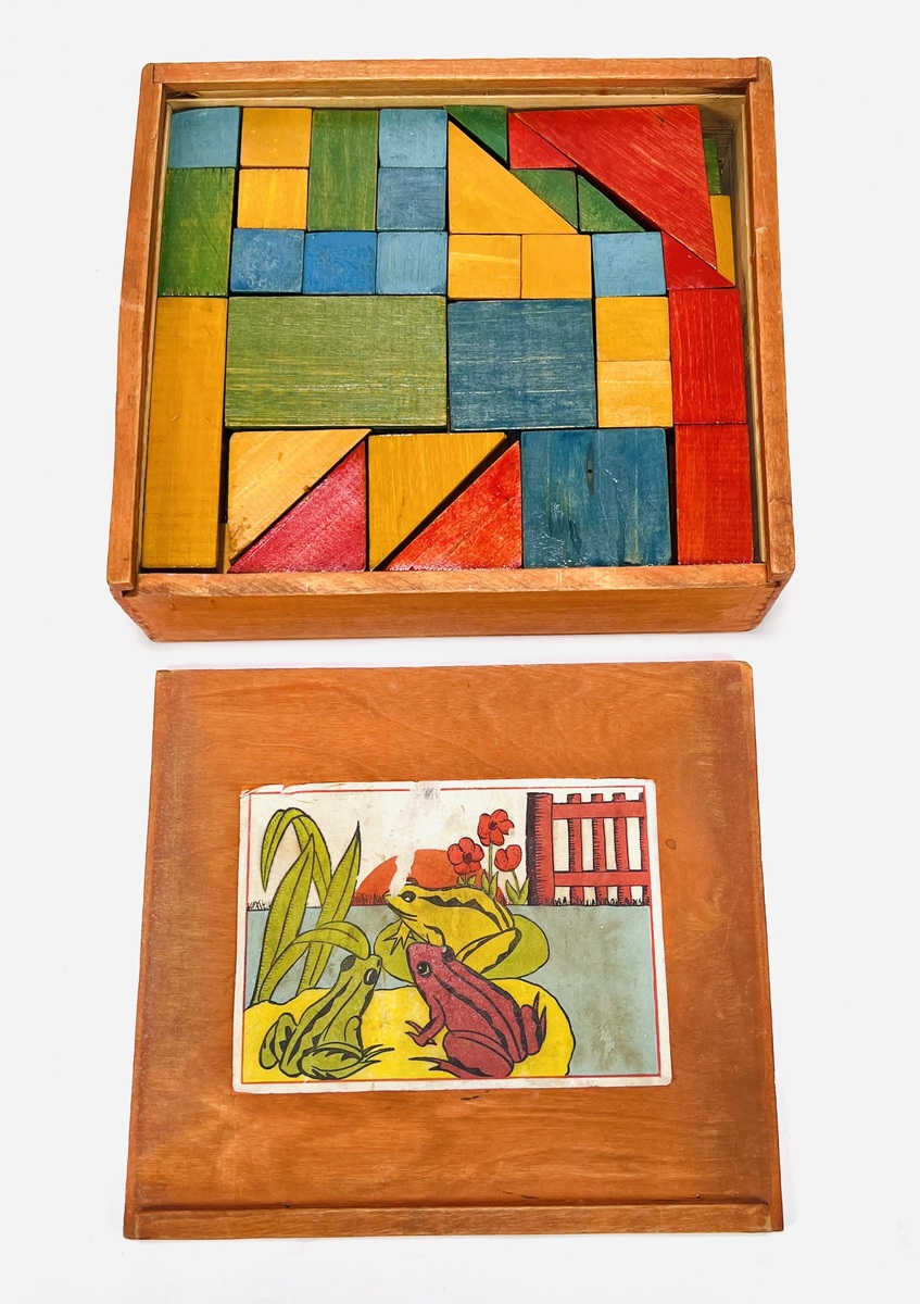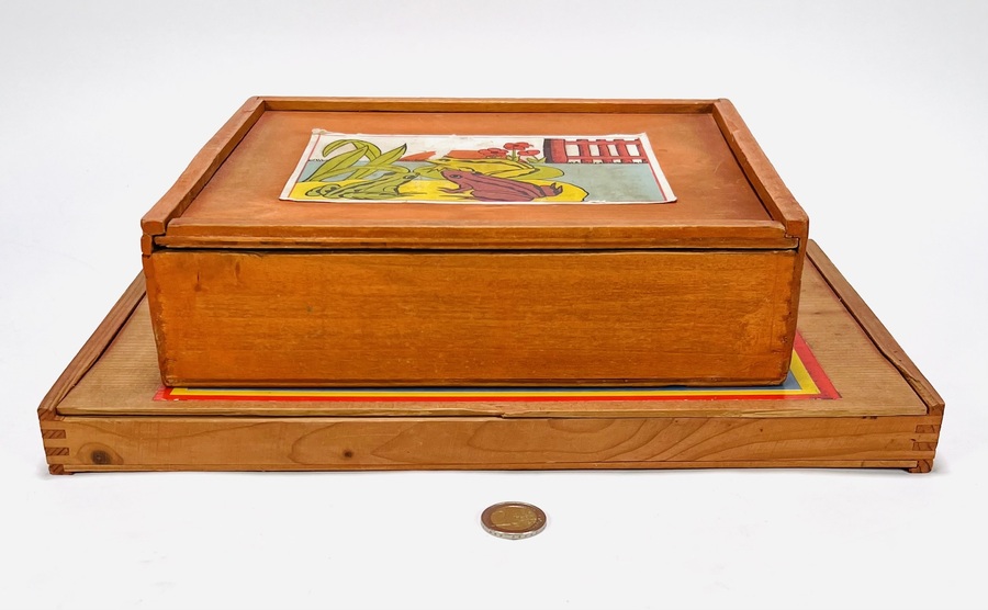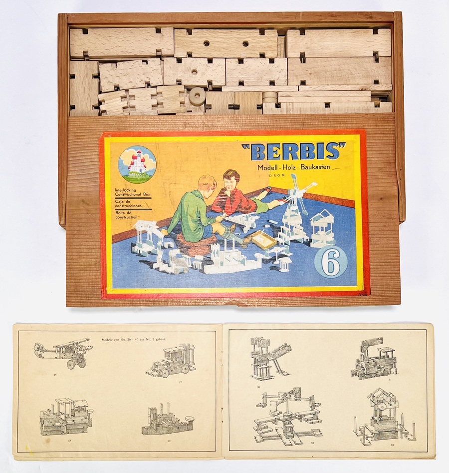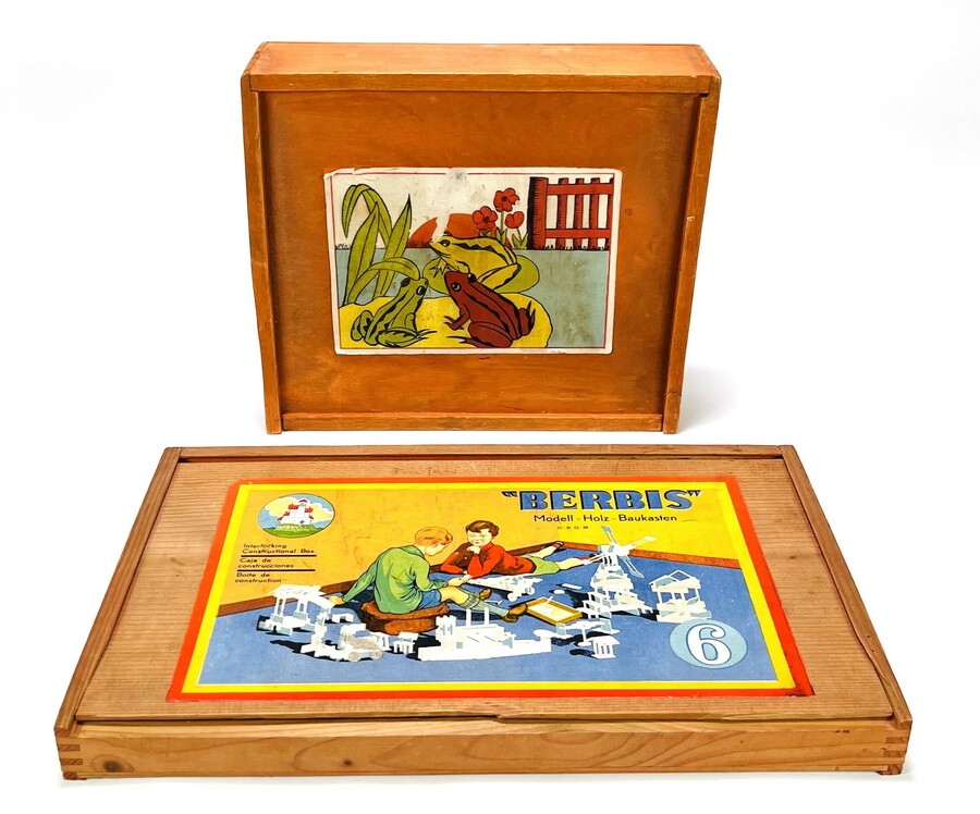 Twee blokkendozen van Duitse makelij met de Berbis Model Holz Baukasten en een tweede doos met gekleurde blokken. Tweede kwart 20e eeuw. |
