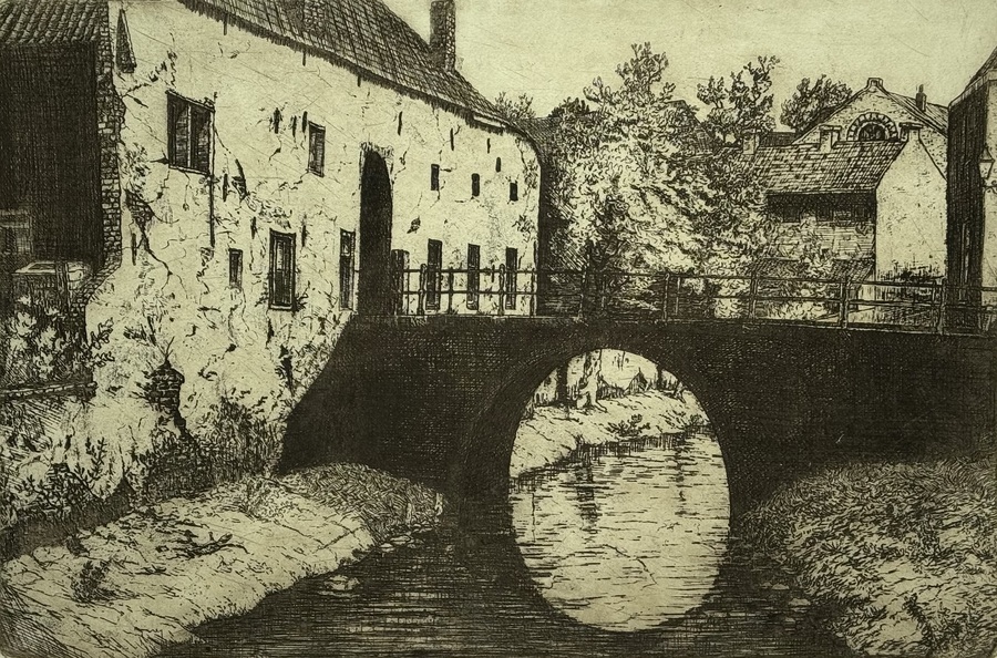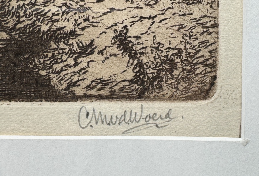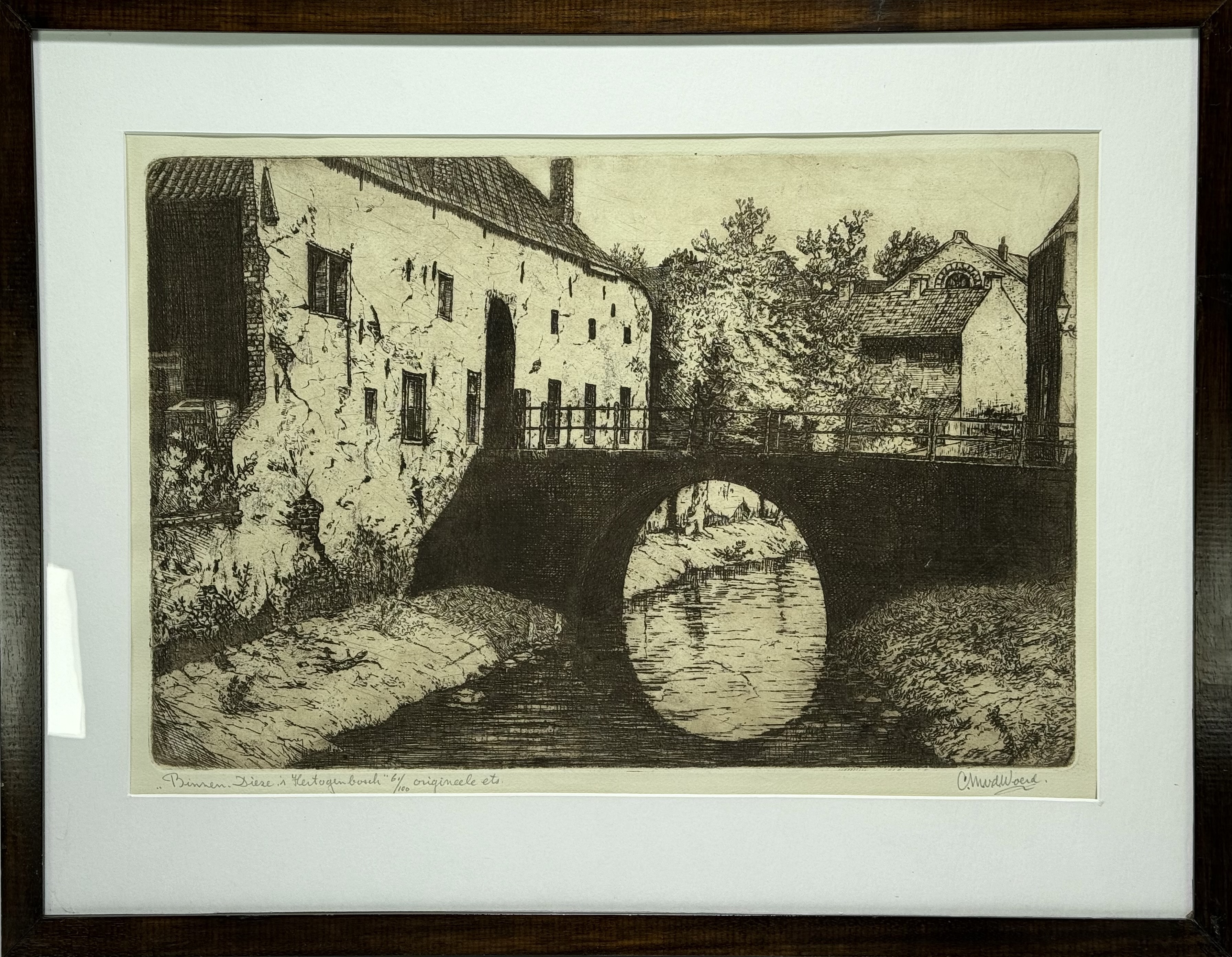 Ets getiteld “Binnen Dieze te ‘s Hertogenbosch” door Cornelis Marinus van der Woerd (1901-1994). Rechtsonder vermelding van titel en oplagenummer 61/100, rechtsonder met potlood gesigneerd. Derde kwart 20e eeuw. |