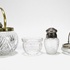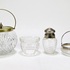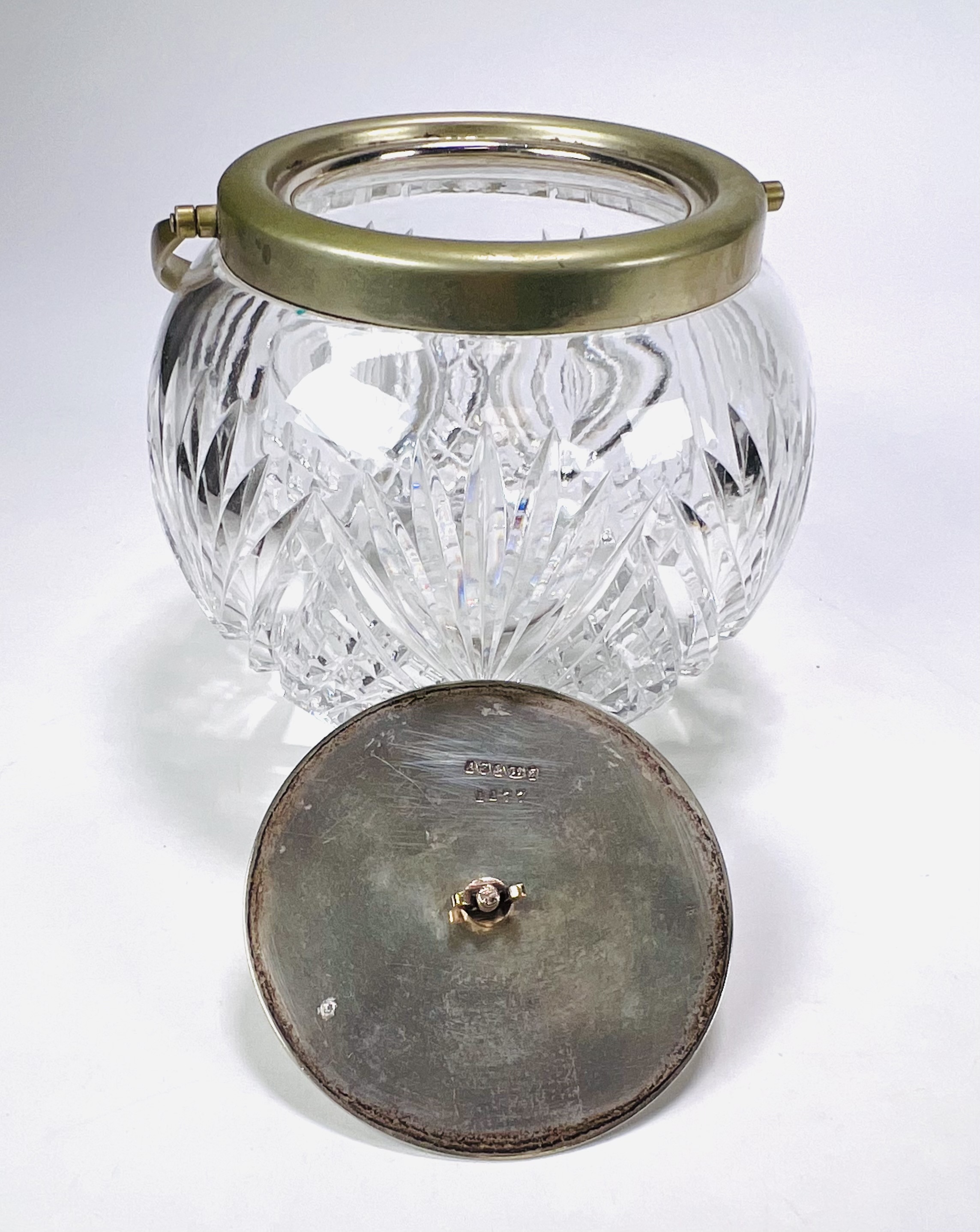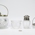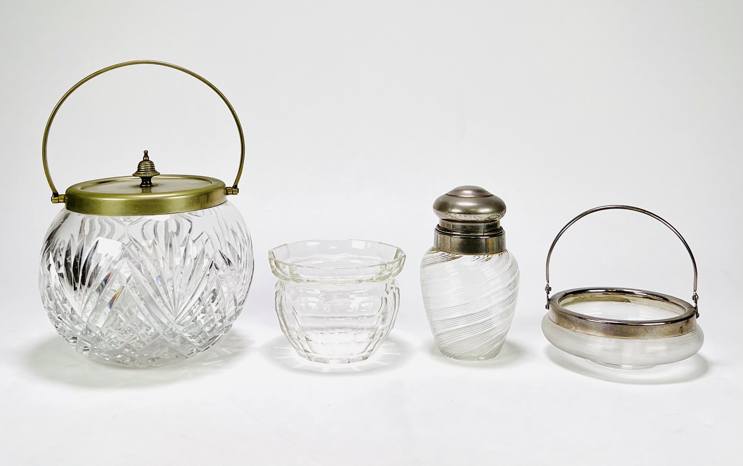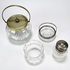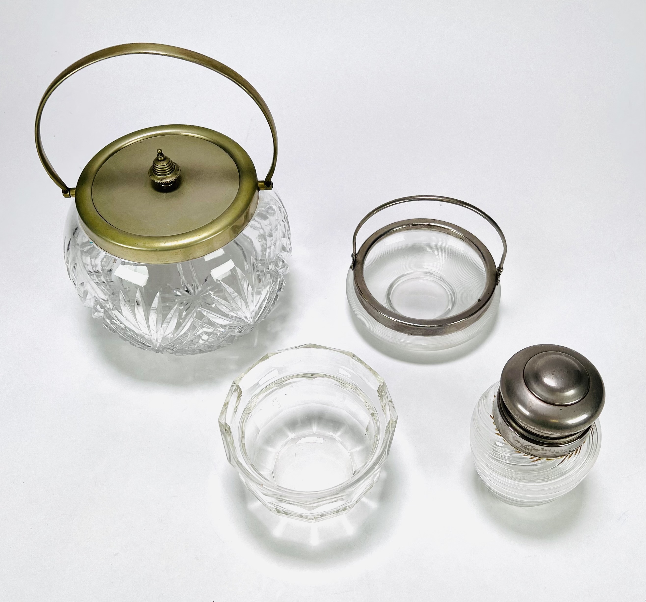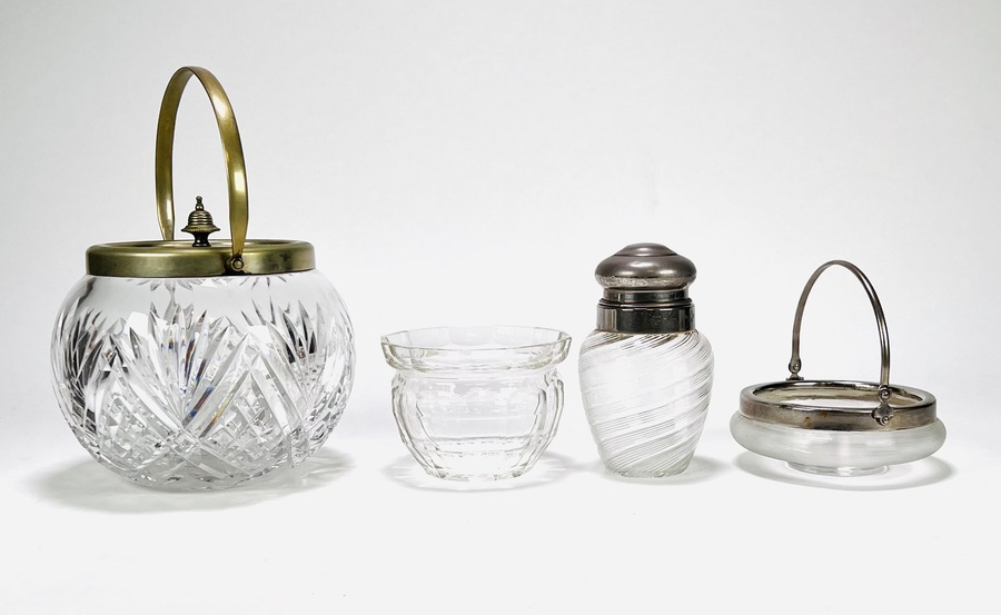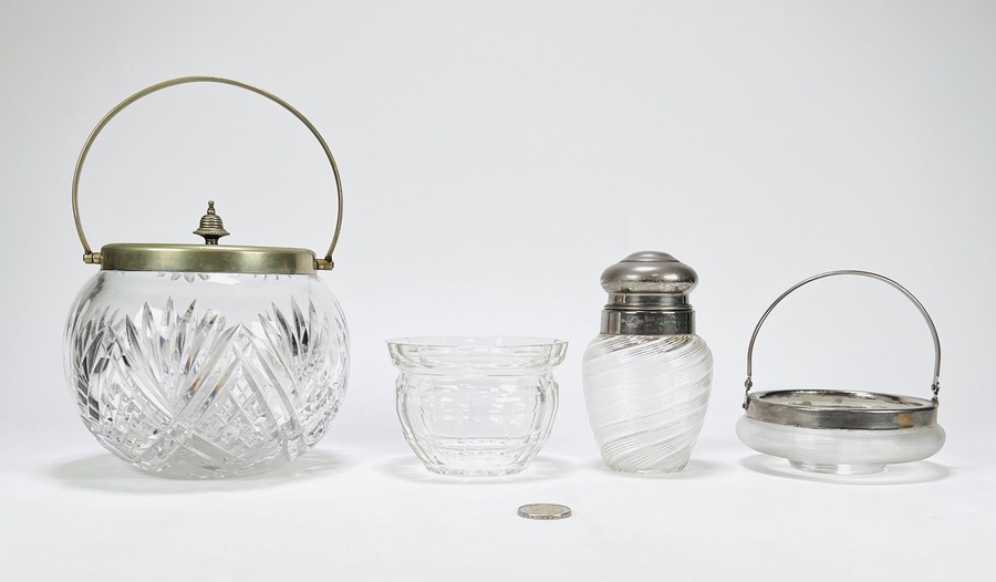 Kristallen waaiergeslepen koekjespot, een Fries draadglas theebus, serveerschaaltje en kom. 20e eeuw. |